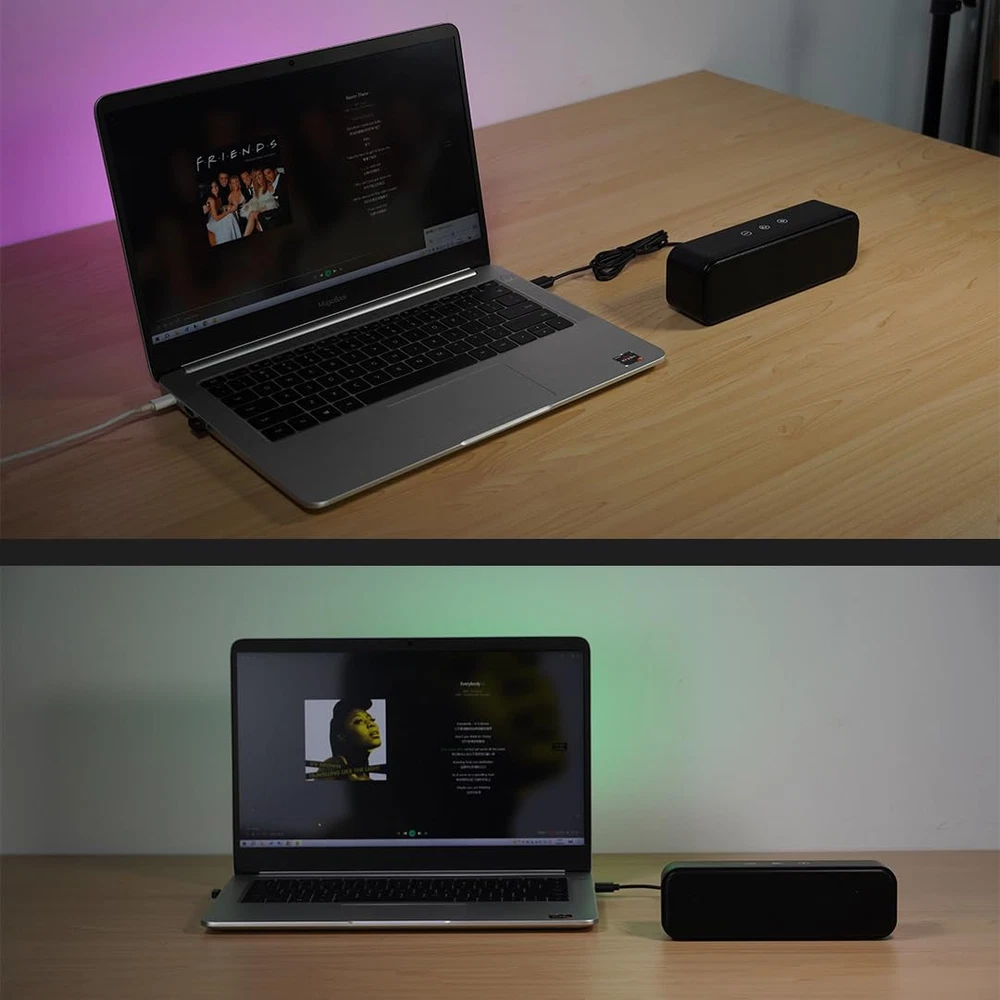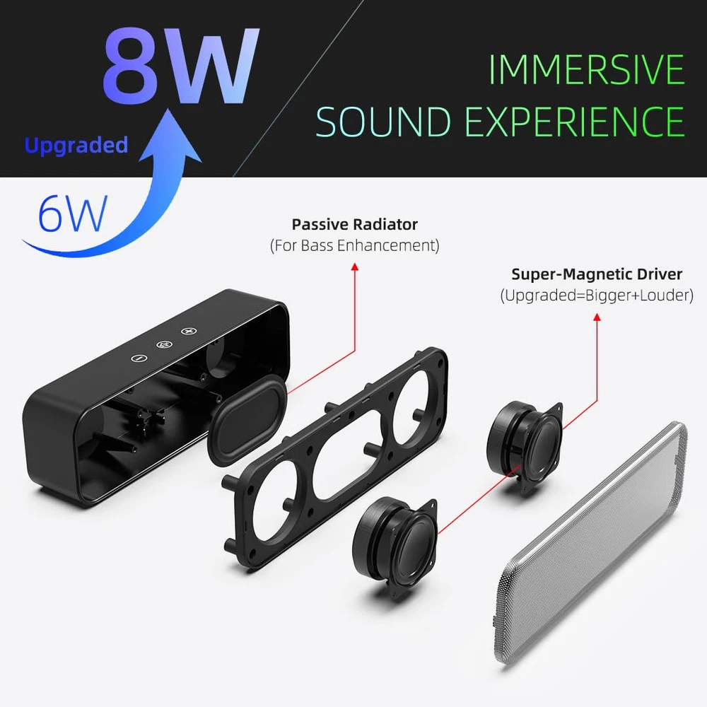 SIMPLE AND STYLISH: This speaker features a rectangular body with the perfect golden ratio, complemented by its matte black color, making it an ideal addition beneath any monitor. HiFi SOUND EXPERIENCE: The enhanced speaker features dual larger speaker drivers and a passive radiator, ensuring the delivery of surprisingly robust audio and punchy bass from such a compact size. EASY TOUCH CONTROL: There are 3 convenient touch buttons on the top, allowing you to effortlessly mute the speaker and adjust the sound volume with ease. USB PLUG-N-PLAY: With no 3.5mm headphone jack, static noise, or driver software required, simply plug in the USB cable and enjoy high-quality crystal-clear loud sound. FULL COMPATIBILITY: Compatible with Windows, macOS, Chrome OS, Linux - for any use on PCs, laptops, and desktop computers. NOTE: Please avoid connecting it to a TV/TV-Box/Projector/Monitor/Xbox/PStation for usage, as the USB ports on these devices may not provide sufficient power to drive our speaker, resulting in a potentially lower maximum volume.