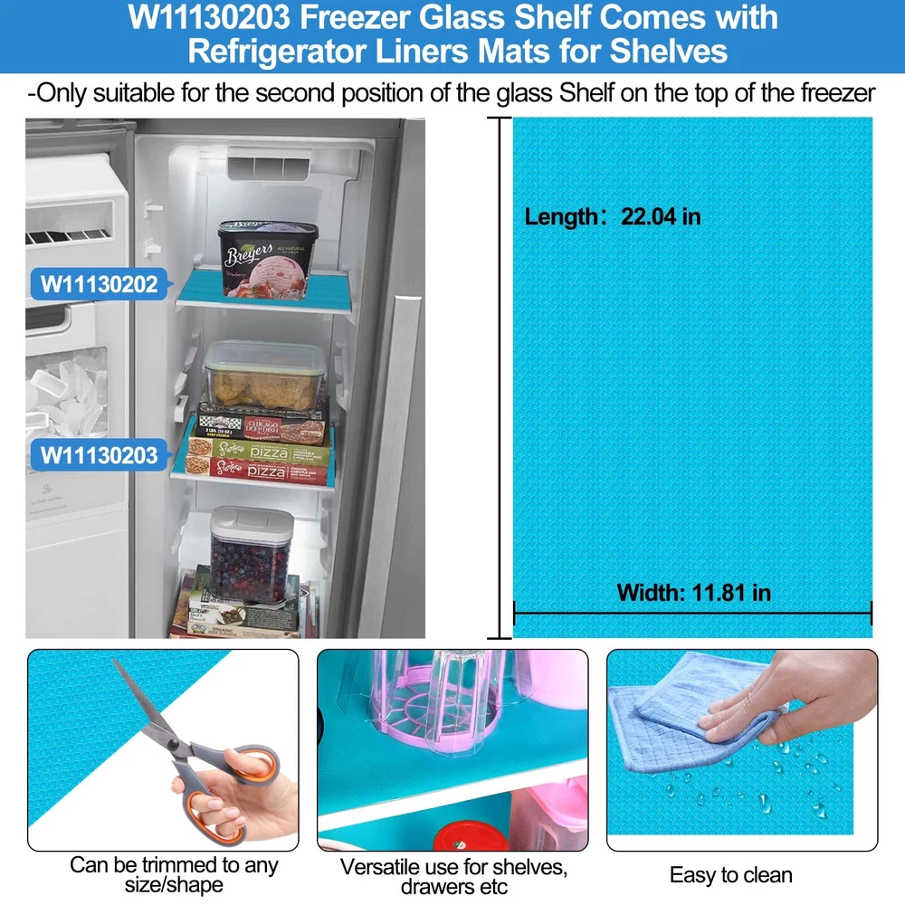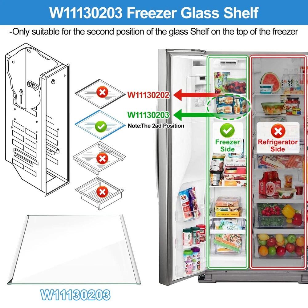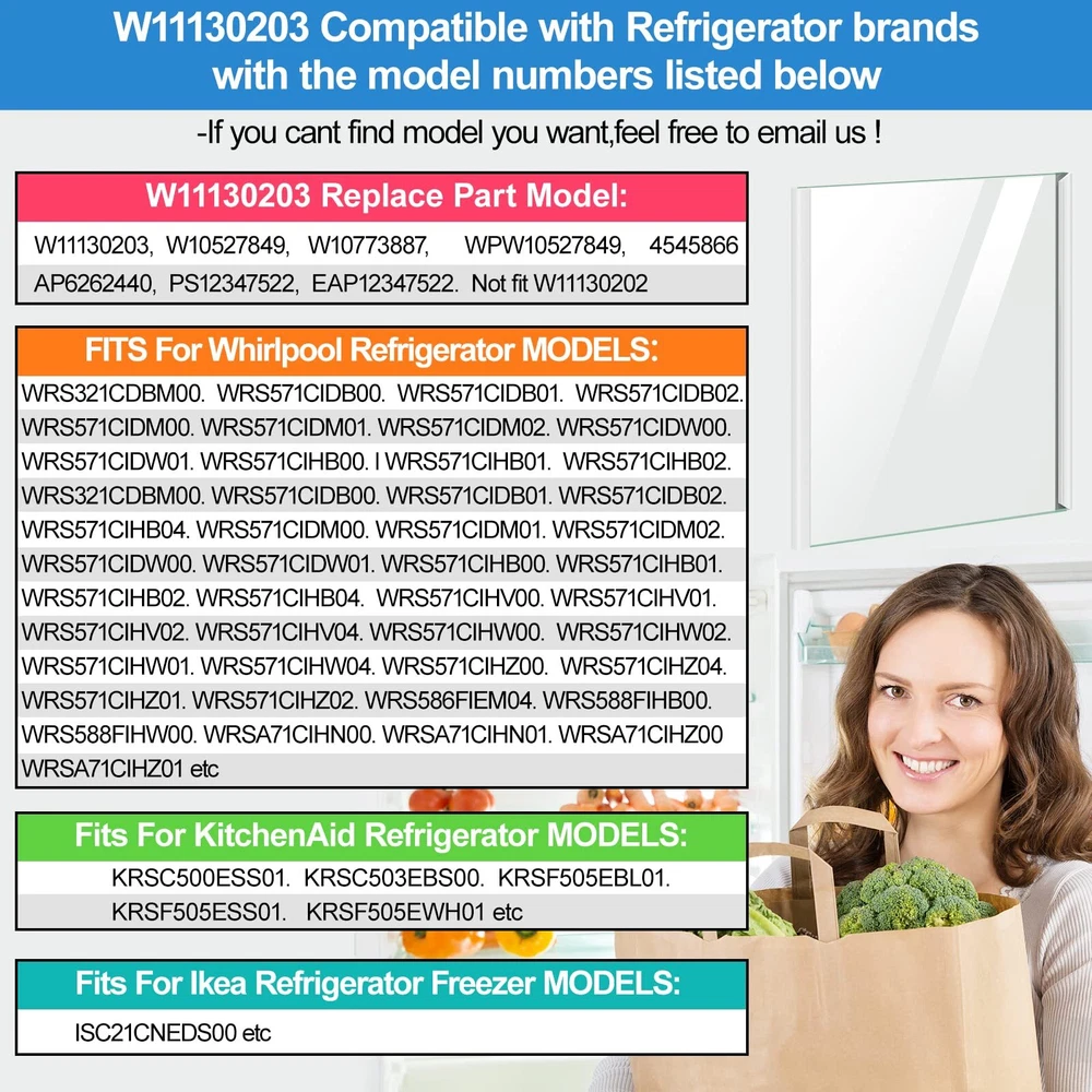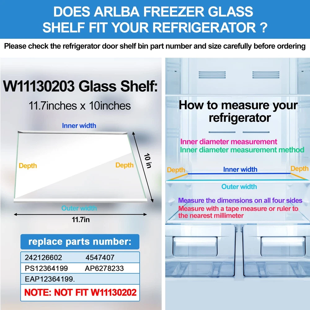 ✅【IMPORTANT NOTE】:Please make sure what is you need before purchase.The size of ARLBA W11130203 Freezer Glass Shelf is 11.7 inches(Length) X 10 inches (Width).Please NOTE that ARLBA W11130203 freezer glass shelf is installed on the freezing side of the Whirlpool refrigerator,located in the second position of the glass Shelf position on the top of the freezer.It is not suitable for the side of the refrigerator.Not suitable for part number W11130202. Please read our homepage and photos in detail ✅【Upgraded material】:ARLBA high-quality W11130203 freezer frame is made of high precision process 9H hardness Tempered Glass,3mm thickness reinforcement glass is reliable for wear resistance of fridge glass shelf,which is durability, strengthen,pollution-free,anti-scratches and scrapes.fridge glass shelf replacement have good bearing performance,can hold up to 30KG,stronger and tougher than ordinary materials.glass Shelf frame on both sides is made of food grade material,it is durable and safe. ✅【W11130203 Glass Shelf Replace Part Numbers】:This W11130203 freezer Glass Shelf replacement replace parts number:W10527849, W10773887, WPW10527849, AP6262440, PS12347522, EAP12347522, 4545866. .Not fit part number W11130202.This W11130203 freezer glass shelf fits on the freezer side of the Whirlpool refrigerator, the 2nd from the Freezer Top Glass Shelf position. It does NOT fit the refrigerator-side. Please check the Glass Shelf size and part number before ordering. ✅【Replace Brands and Models】:ARLBA W11130203 freezer Glass Shelf replacement for whirlpool KitchenAid and Ikea refrigerator freezer shelf parts.Fit models: WRS571CIDM00 WRS571CIDM01 WRS571CIDM02 WRS321CDBM00 WRS571CIDB00 WRS571CIDB01 WRS571CIDB02 WRS571CIDW00 WRS571CIDW01 WRS571CIHB00 WRS571CIHB01 WRS571CIHB02 WRS571CIHB04 WRS571CIHZ00 WRS571CIHZ04 WRS571CIHZ01 WRS571CIHZ02 WRS586FIEM04 WRS571CIHV00 WRS571CIHV01 WRS571CIHV02 WRS571CIHV04 WRS571CIHW00 WRS571CIHW02 WRS571CIHW01 WRS571CIHW04. ✅【Packaging Includes & Warranty】:1 X W11130203 freezer shelf glass for whirlpool refrigerator parts and 1 x fridge mats.( For whatever reason, if you are not satisfied, Please let us know, We will show you our sincere attitude and satisfactory solutions)