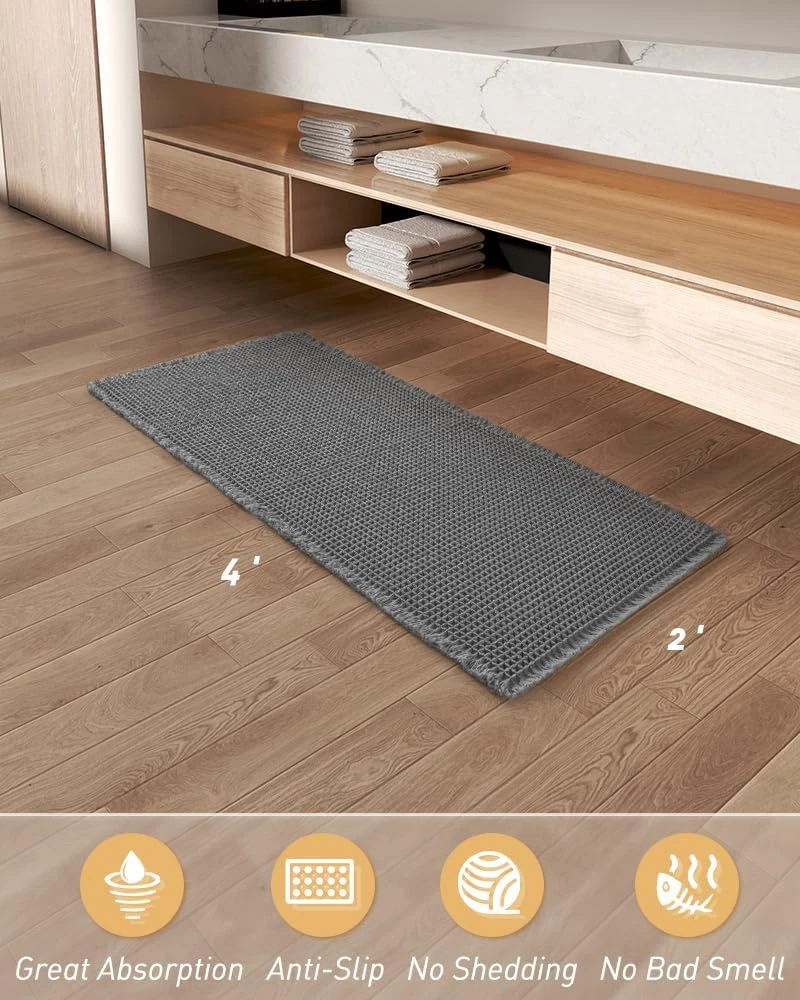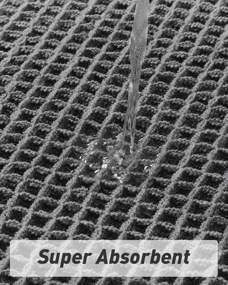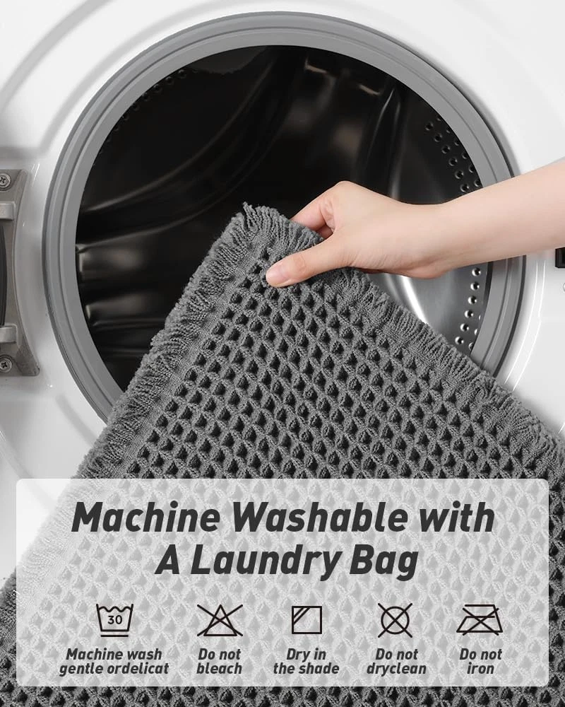 Upgraded Waffle Desgin: This boho bath mat is power-loomed with upgraded yarns-Integrating decoration and durability. The heavier and thicker threads are applied to make sure the pattern will be more solid and compact- NEVER OUT OF SHAPE! Great Water Absorption: Double layer of deep waffle texture absorbs water instantly and more breathable. In addition, the yarns we use is inherently absorbent-it absorb water like crazy. This absorbent bath mat can soak up the water and keep your floor dry like a giant sponge, and protect your feet from the cold floor. Clear Rubber Backing: This non slip bath mat is designed with clear rubber backing(HMA-Hot Melt Adhesive, invisible but touchable). This bathmat firmly grips the ground to prevent you and your families from falling. Comfortable and Soft: Three-dimensional waffle design combined with flexible yarns make the bathroom floor mat softer and cozier. Bring you a comfortable underfoot feeling. Enjoy a comfort space when you finishing shower. Easy to Maintain: Machine washable bathroom rugs provide convenience in your daily life. Recommend gentle mode,cold water. Or just shake the dust off from the bath rugs for simple cleaning. Product Description