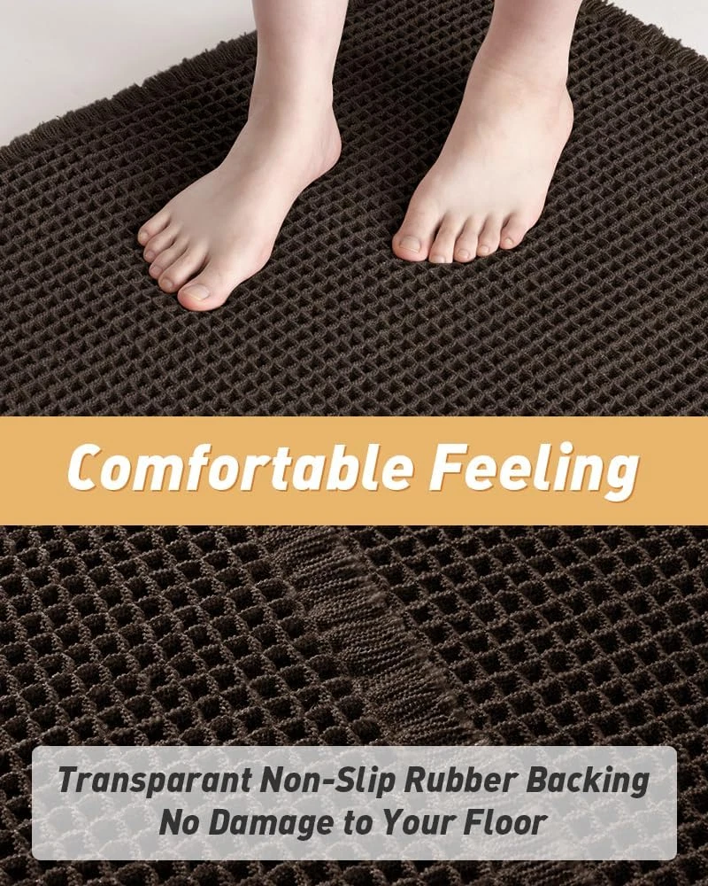 Upgraded Waffle Desgin: This boho bath mat is power-loomed with upgraded yarns-Integrating decoration and durability. The heavier and thicker threads are applied to make sure the pattern will be more solid and compact- NEVER OUT OF SHAPE! Great Water Absorption: Double layer of deep waffle texture absorbs water instantly and more breathable. In addition, the yarns we use is inherently absorbent-it absorb water like crazy. This absorbent bath mat can soak up the water and keep your floor dry like a giant sponge, and protect your feet from the cold floor. Clear Rubber Backing: This non slip bath mat is designed with clear rubber backing(HMA-Hot Melt Adhesive, invisible but touchable). This bathmat firmly grips the ground to prevent you and your families from falling. Comfortable and Soft: Three-dimensional waffle design combined with flexible yarns make the bathroom floor mat softer and cozier. Bring you a comfortable underfoot feeling. Enjoy a comfort space when you finishing shower. Easy to Maintain: Machine washable bathroom rugs provide convenience in your daily life. Recommend gentle mode,cold water. Or just shake the dust off from the bath rugs for simple cleaning. Product Description