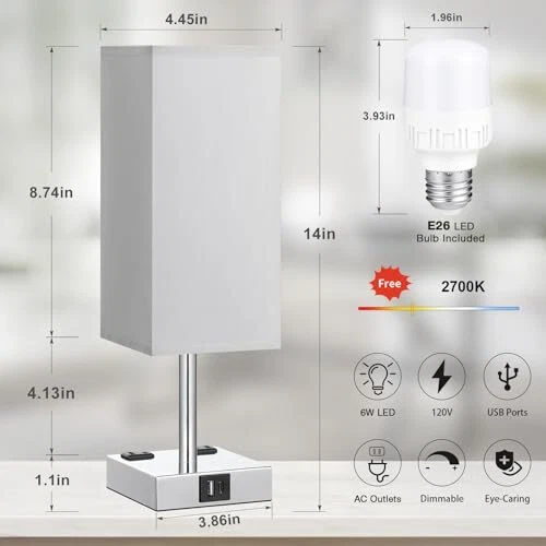 30 Days Return Policy Fast Delivery Trusted seller 【Upgraded】Bedside Table Lamp Touch Control, with USB C+A Charging Ports & Dual AC Outlets, 3-Way Nightstand Lamp for Bedroom with LampShade Living Room Office(LED Dimmable Bulb Included) Product Description 3-Way Dimmable Touch Bedside Lamp - Featured with smart touch sensitive sensor, small touch lamp has 3 different brightness levels and convenient to turn on/off because you can adjust light setting by tapping on silver metal base. Night light lamp for steady sleep or nursing, accent lighting for ambience, brightest setting for reading or working Upgraded Desk Lamp with USB A+C Charging Ports & AC Outlets - This usb table lamp for bedroom built in USB A & type-C (5V/2.1A) and AC Outlet (120V) charger for fast charging, can charge your phone, kindle, tablet, watch and other devices no matter the side lamp is on or off Modern Gray Lamp for Room Decor - Dimmable table lamp is well made and sleek in design, Linen fabric lamp shade gave off a warm and pleasant glow, providing you with a relaxed and comfortable atmosp. Ideal side table lamp for bedroom, kids room, living room, office, dorm, study room. Merry Christmas gift for friends, kids and family. The height of the small lamp is 15.35 inch, please check the size photo E26 LED Light Bulb Included - To save you from troubles in finding right bulb to match, the USB lamp comes with E26 base Q50 3000K LED bulb, giving off stable warm white light, protecting your eyes Safety and Worry-free - The nightstand lamp is easy to assemble. If you have any question please feel free to let us know, quickly and friendly service will be provided Shipping Returns Payment Shipping Shipping is FREE to all addresses other than APO/PO boxes in the lower 48 states. All our stock ships from US-based warehouses. Shipped via USPS or UPS (depending on location and package weight) Unless stated otherwise, all orders will ship within 24-72 hours of your payment being processed. Check our feedback to see the great reviews of FAST shipping we offer. Returns As our valued customer, we will do our best to make sure the product you receive arrives to you on time and as expected. If you are not satisfied with your purchase, please contact us within 30 days of receiving your order to process a return. Payment We currently accept payment via eBay managed payments only. Once payment is cleared, we will dispatch your shipment within 1-3 business days. Please refer to the "Shipping" tab for more information regarding shipping speed to your destination.