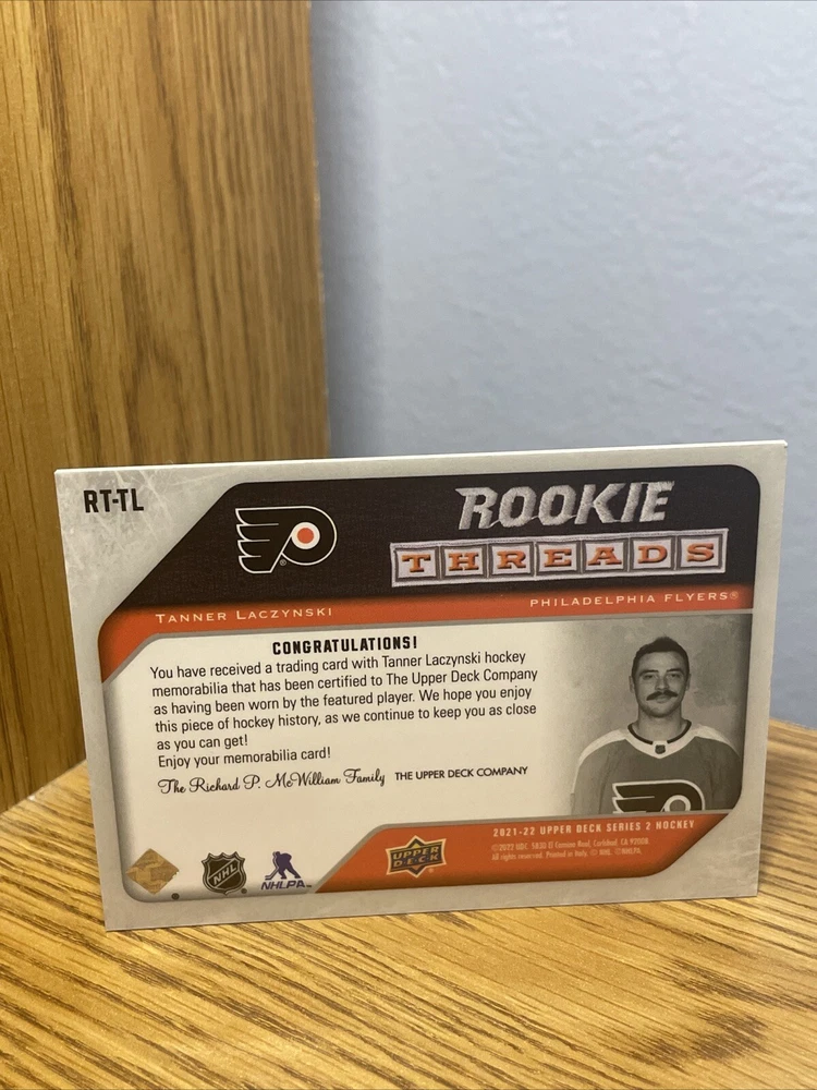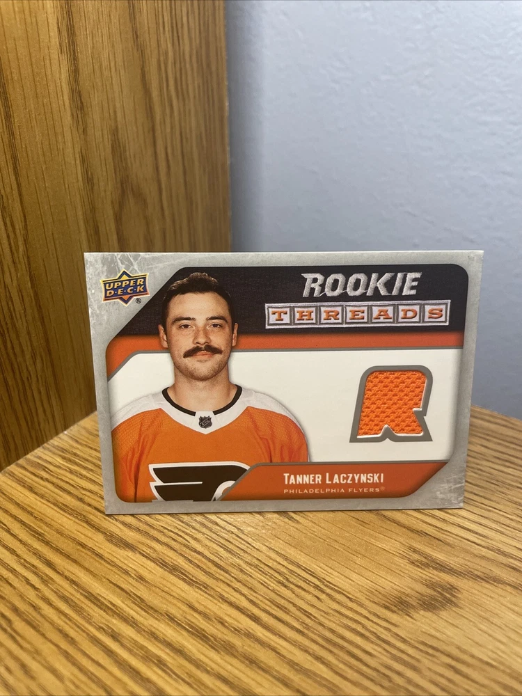 Get your hands on the Upper Deck 2021-22 Series 2 Rookie Threads Tanner Laczynski #RT-TL trading card. This sports trading card features the Philadelphia Flyers player in his rookie season, with a jersey parallel/variety. Part of the National Hockey League (NHL), this card is a must-have for any hockey sur glace fan. It is manufactured by Upper Deck and is part of the 2021-22 Upper Deck Series 2 set. This card is not autographed and is classified as non. Don't miss out on the chance to add this card to your collection.