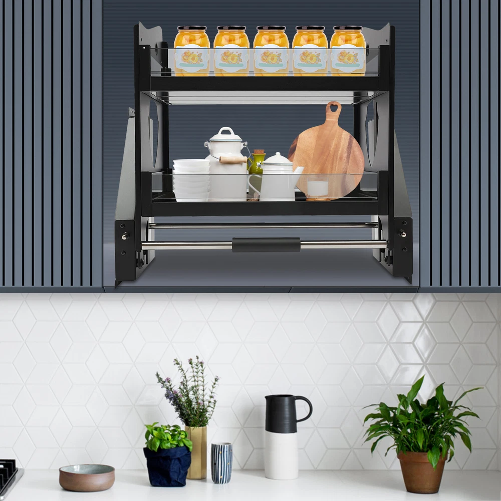 Pull Down Shelf Upper Kitchen Wall Cabinet Storage Organizer (24inch Cabinet) Description Say goodbye to the inconvenience of traditional kitchen cabinets with fixed heights, our pull-down cabinet organizer can be easily lowered to the most suitable working height for you, making the cooking process more energy-saving and comfortable. It's a scientific and reasonable layout to meet your needs for a variety of storage of kitchen utensils so that you can enjoy convenience at the same time, but also keep the kitchen clean and orderly, showing the aesthetics of modern life. Key Features Sturdy and Durable: The product is made of high-quality carbon steel, space aluminum, and tempered glass, using baked paint technology, with high strength, wear resistance , and long service life. Storage Assistant: The 2 tiers of open shelves provide you with plenty of space for spices and other kitchen tools, which are reasonably partitioned to keep your kitchen organized. Excellent Load-bearing Capacity: The thickened double rod rocker arm, high-quality material, 5mm thick toughened glass, and strong screw fixation make it more stable, and the weight capacity of the product can reach up to 66.14 lbs, which allows you to place various items with confidence. Smooth Push-pull: The advanced two-way hydraulic damping cushioning system and powerful coiled spring windings ensure easy pull-down and stable push-back while keeping items free from impact and people from having to shift and exert themselves. Thoughtful Design: Through the left and right side adjustment buttons, the product can provide three levels of assistance( 2.2-11.02 lbs , 11.02-15.4 lbs , 13.22-26.4 lbs ), so that you can adjust the rebound strength and balance strength according to the weight of the items you put in it, effectively preventing it from going down too fast. Adjustable Width: The width of the product can be adjusted by 0.59 inches on the left and 0.59 inches on the right, meeting your installation needs in the cabinet. Convenient to Use: This product can be pulled down about 11.81 in ches from a high cupboard, allowing you to easily remove items from the cupboard, making it very friendly for older people and teenagers. Space-saving: It makes the most of unreachable high cupboard space while increasing worktop space, improving space utilization without taking up space for everyday activities, and making the room more spacious. Easy to Clean: The smooth surface and angular structure design allow you to easily remove dust from the surface of the product with a towel. Customer Service: We aim to provide high-quality products and services. If you have any questions, please feel free to contact us. We will reply as soon as possible and solve the problem for you. Details Practical Handle: The foam grip is non-slip and easy to grip. Extended Rocker Arms: They make the product drop quickly in one step. Raised Fence: It prevents the accidental dropping of placed objects. Pre-drilled Holes: They enable you to mount and fix this product directly into the cabinet. Application This product is suitable for dish racks, spice racks, and food storage racks in upper cabinets in kitchens, bars, coffee cabinets, pantries, wardrobes, wardrobes, etc. for storing snacks, bowls, plates, spices, condiments, spice bottles, other kitchen items. Specifications Style: Modern Shape: Rectangular Color: Black Material: Carbon Steel, Space Aluminium, Tempered Glass Surface Treatment: Baked Paint Shelf Type: Sliding Shelf Mount Type: Inside the Cabinet Assembly Required: Yes Indoor/Outdoor Usage: Indoor Number of Tiers: 2 Max. Load-bearing Capacity: 30kg/ 66.14 lbs Drop-down Depth: About 30cm/ 11.81 in Right Switch Loaded: 5kg/ 11.02 lbs Left Switch Loaded: 5kg/ 11.02 lbs Applicable Cabinet: Width: 56-59cm/22.05-23.23 in; Depth: >28cm/11.02 in; Height: >56cm/ 22.05 in Three-gear Adjustment: 1-5kg/2.2-11.02 lbs, 5-7kg/11.02-15.4 lbs, 6-12kg/13.22-26.4 lbs Tier Height: 25cm/ 9.84 in Each Basket Height: 7cm/ 2.76 in Each Basket Width: 24.5cm/ 9.65 in Each Outer Basket Width: 26cm/ 10.24 in Overall Product Size: 56*28*53cm/ 22.05*11.02*20.87 in Package Size: 65*34*34cm/ 25.59*13.38*13.38 in Gross Weight: 12kg/ 26.45 lbs Net Weight: 10kg/ 22.05 lbs Package Included 1* Pull-down Cabinet Organizer 1* Chinese Installation Diagram Other Accessories Required for Installation Notes Please note that when this product is running, it is strictly prohibited to operate the booster button, and it can be operated after it is pushed into the cabinet. Please do not use hard tools to clean the shelf. Please allow the slight color difference caused by the shooting light and 1-3cm error due to manual measurement, and make sure you do not mind before you order. Payment Delivery details Terms of sales About us Contact us Payment We accept ebay payment 。 Fees such as import duties, taxes are not included in the item price or shipping costs. These charges are the buyer's responsibility. Delivery details Shipping: 2-9 working days to: USA Terms of sales We maintain high standards of excellence and strive for hundred percent customer satisfaction. Feedback is very important to us. We hope that you contact us immediately before you give neutral or negative feedback, so that we can address your concerns. It is impossible to address issues if we do not know about them! About us Your satis faction is our ultimate goal. We work hard to earn your trust and future business. Our certified technicians have tested each item before shipping. The unit comes with 1 year limited warranty on all manufacturing defects. a) If you receive a defective item, you may return it or ask for a discount. Please contact us within 14 days after you receive the package. b) What you returned must be intact and in its original packaging as re? u. Customer is responsible for shipping costs of the returned item. c) We will cover the cost of shipping back t with the shipping rate indicated in the registration page. We will se