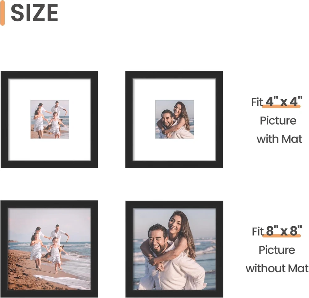Upsimples 8X8 Picture Frame, Display Pictures 4X4 with Mat or 8X8 without Mat, W