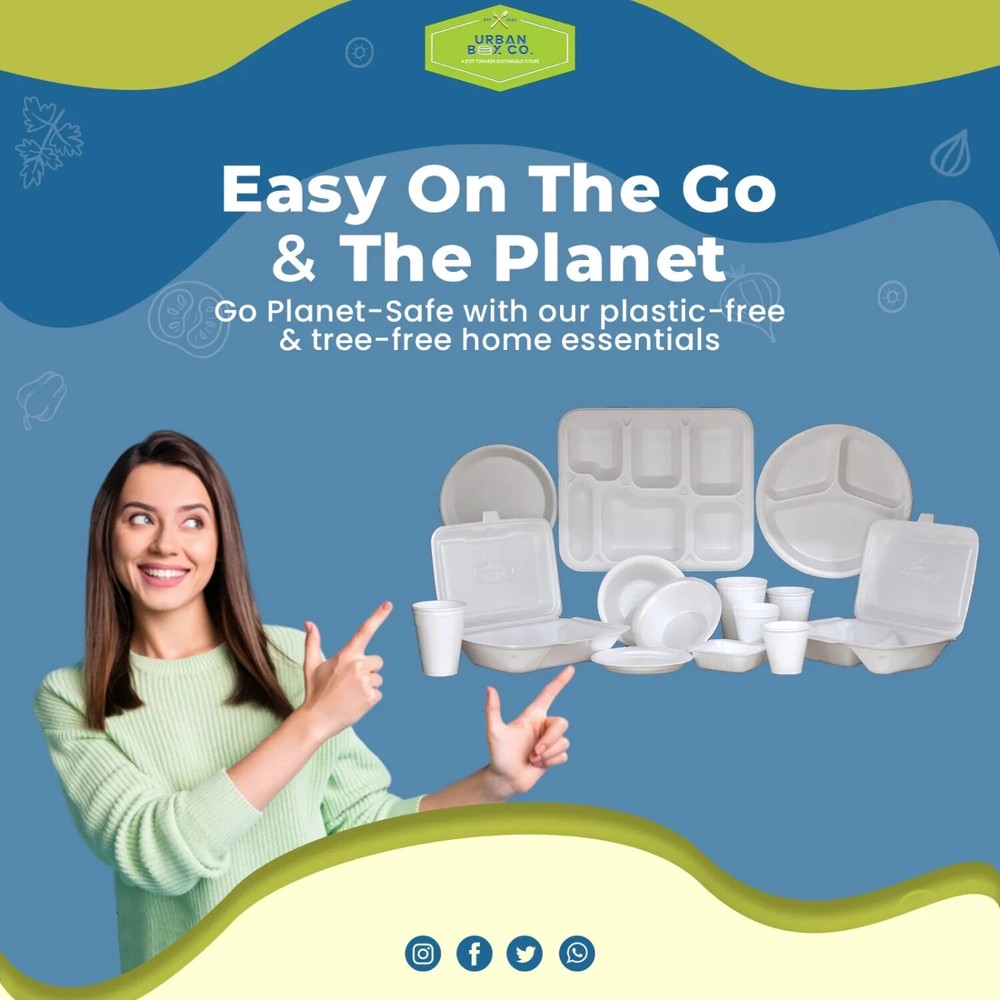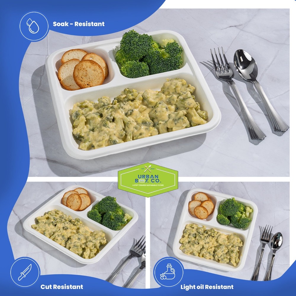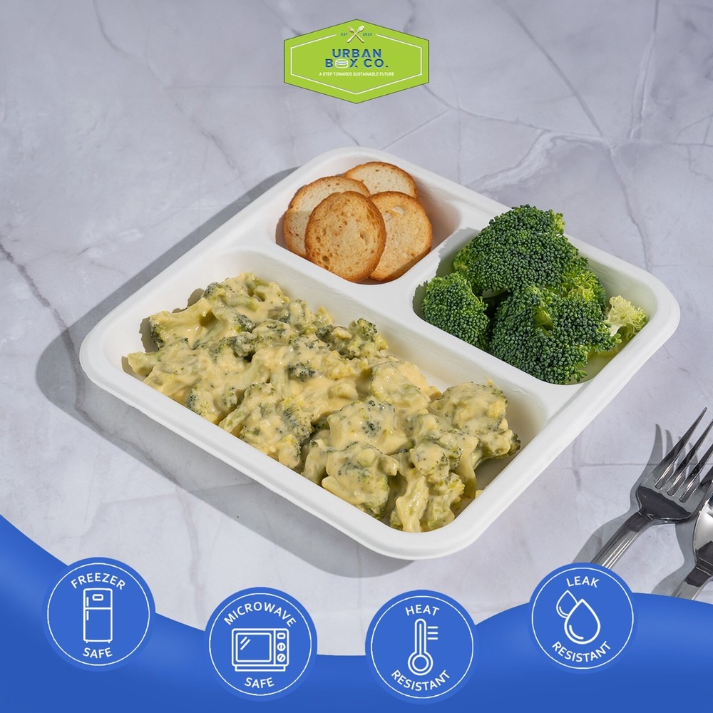 Urban Box Co 100% Compostable Extra Strong Heavy-Duty 5-Compartment Rectangle Deep Paper Plates - 50-Pack Elevate your dining experience with our 100% Compostable Extra Strong Heavy-Duty 5-Compartment Deep Paper Plates. Crafted from eco-friendly bagasse, these plates are designed for durability and convenience, making them perfect for any occasion—from school lunches to catering events. Choose our Extra Strong Heavy-Duty 5-Compartment Deep Paper Plates for a sustainable, stylish, and practical dining solution. Order your 50-pack today and redefine your dining experience while making a positive impact on the environment! 5-Compartment Design: Features five deep compartments for serving a variety of dishes without mixing flavors, perfect for balanced meals and snacks. Extra Strong & Heavy-Duty: Crafted from sturdy materials to hold hot and cold foods securely, ensuring no leaks or messes during your events. 100% Compostable & Eco-Friendly: Made from natural bagasse, these plates are fully compostable, helping to reduce environmental impact while promoting sustainability. Versatile for Every Occasion: Ideal for school lunches, catering events, parties, and everyday dining, offering a stylish and convenient solution for any gathering. Convenient 50-Pack: Comes with 50 large disposable plates, making it easy to stock up for large gatherings, picnics, and regular use. Urban Box Co sturdy sectional compostable dinner plates are perfect for everyday use. Eco-friendly & biodegradable disposable plates.