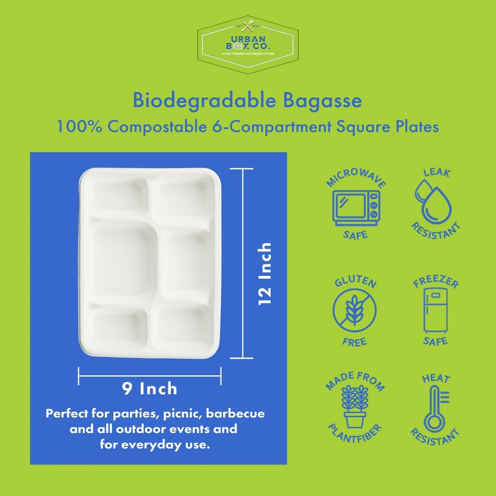 Serve up eco-friendly convenience with these 100% Compostable 6 Compartment School Rectangle Meal Trays. This 50-pack of heavy-duty, sugarcane bagasse paper plates is perfect for schools, cafeterias, parties, and family gatherings. Made from renewable sugarcane fiber, each tray offers six compartments, ideal for portion control and keeping foods separate. Safe for the microwave, these trays are sturdy enough to hold hot, cold, and heavy foods without bending or leaking. Upgrade your mealtime setup with these eco-friendly, compostable, and disposable school meal trays that prioritize both functionality and sustainability. Perfect for green-conscious consumers looking for high-quality, biodegradable lunch trays that are gentle on the environment. Eco-Friendly & 100% Compostable: Made from renewable sugarcane bagasse, these trays are fully compostable, providing a sustainable alternative to plastic and foam plates. 6 Compartment Design: Ideal for keeping food separated, each compartment is perfectly sized for main dishes, sides, and sauces, making it ideal for school lunches, cafeterias, and events. Heavy-Duty & Sturdy: Crafted from high-quality sugarcane fibers, these plates are built to hold heavy meals without bending, soaking, or leaking, even with hot or cold foods. Microwave Safe: Designed for convenience, these trays are microwaveable, allowing you to heat food directly on the plate without worry. 50 Pack Value: Includes 50 compostable plates, offering an ample supply for events, gatherings, or daily use in schools and homes. Safe & Non-Toxic: Free from harmful chemicals, these disposable trays are safe for use with any type of food, offering peace of mind for you and the environment. Urban Box Co sturdy sectional compostable dinner plates are perfect for everyday use. Eco-friendly & biodegradable disposable plates.
