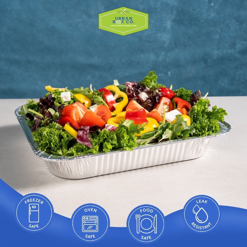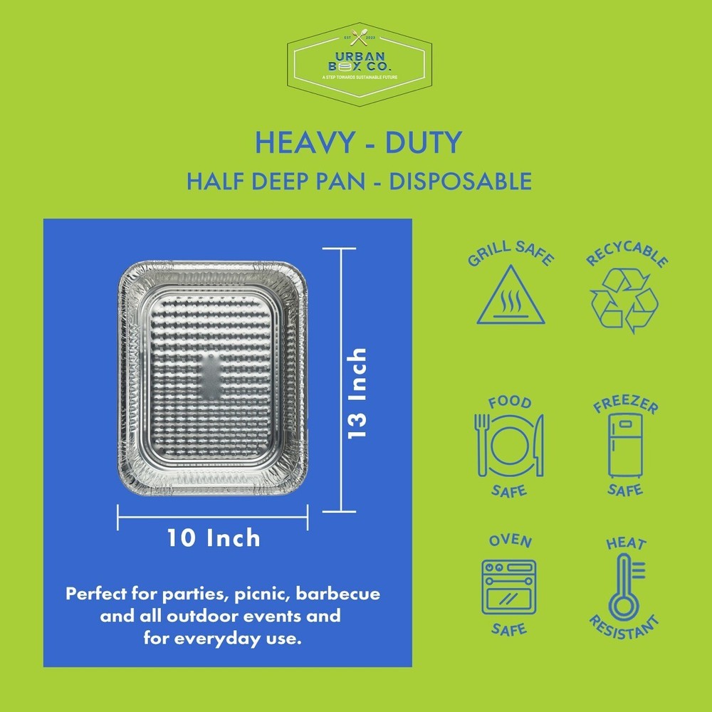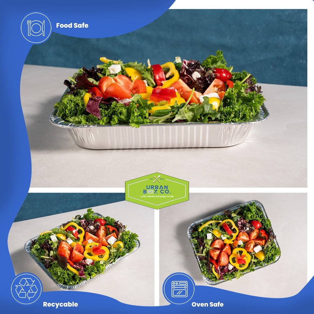 Experience Culinary Excellence with Urban Box Co's Half-Size Aluminum Pans Measuring a generous 10.5 x 12.9 inches and with a depth of 3.1 inches, our half-size aluminum pans. Ideal for effortlessly preparing medium to large batches of food for any occasion. Crafted from premium food-grade aluminum, Urban Box Co's sturdy and durable pans are your kitchen workhorse. Whether you're cooking, roasting, or heating in the oven, expect perfection every time. These foil pans are a kitchen powerhouse—safe for use in the freezer, oven, and steam table. From advance food preparation to keeping dishes warm for serving, enjoy unparalleled versatility. Enjoy the luxury of gourmet without breaking the bank. Urban Box Co's disposable pans redefine convenience. Quick and easy cleanup meets eco-friendliness and recyclability, reducing your environmental impact while enhancing your cooking experience. We stand by our product with a 100% satisfaction guarantee. If you're not completely thrilled with your purchase, enjoy a full refund hassle-free. Urban Box Co brings you high-quality cooking and easy cleanup without compromise. Cook with confidence, cleanup with ease—choose Urban Box Co for culinary excellence. Order your Half-Size Aluminum Pans now! Urban Box Co Brilliance: Urban Box Co, dedicated to providing cost-efficient solutions, presents a top-tier product at an economical price. Transform your catering and take-out experience with this premium food storage solution. Versatile and Temperature-Savvy: The Urban Box Co half-size foil steam table pan is your ultimate choice for cooking, storing, and serving entrees, sides, appetizers, and desserts. With an impressive 125 fl. oz. capacity, it's ideal for banquets and events of any size, ensuring unparalleled temperature retention. Durable Aluminum Foil Construction: Crafted from heavy-duty aluminum foil, this pan ensures durability throughout your entire event while providing a polished look. Urban Box Co prioritizes strength and style in one. Full Curl Rim for Easy Handling: The flexible rim can be effortlessly bent to cover all pan edges, ensuring easy handling and a sleek presentation. Urban Box Co's attention to detail shines through for your convenience. Designed for Easy Stacking: Urban Box Co's half-size foil steam table pan is thoughtfully designed for compact storage and transport. Easily stack pans on top of each other for efficient organization and convenience. Disposable Design for Effortless Cleanup: Forget about time-wasting scrubbing. These disposable aluminum pans from Urban Box Co make cleanup a breeze, providing convenience without compromising on quality.