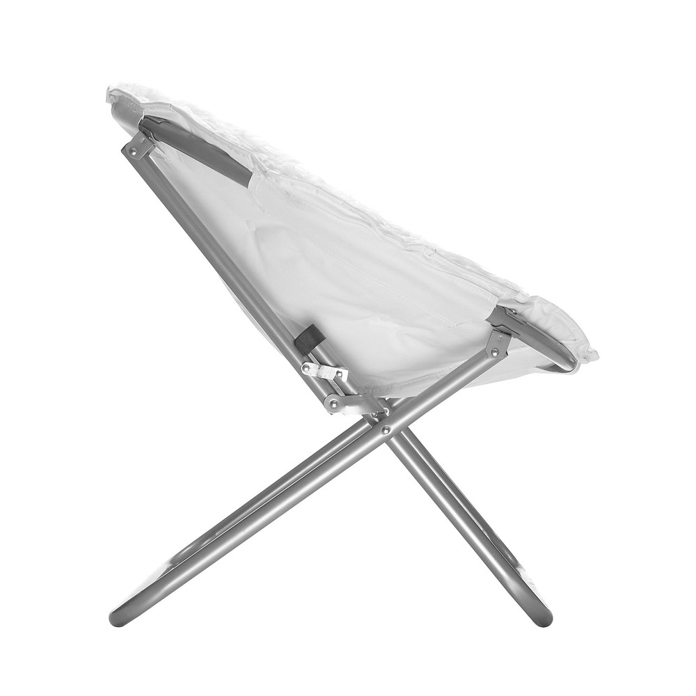 Update your bedroom or dorm with this luxurious Mongolian Faux Fur Saucer Chair. Super plush and comfortable, this folding chair is perfect for reading, watching TV or just relaxing. This cozy chair is a perfect decorative addition to update any room with the luxurious Mongolian fabrication. Chair easily folds up and can be stored without taking up much space when not in use. No assembly required. Dimensions: 30" H x 29" W x 28" L. DESIGN: Settle into a seat that loves you back and is designed to fit your body. A saucer chair designed in a gorgeous off white color that will suit any room décor. Featuring a silver sturdy metal frame to compliment its look. Add additional seating to living rooms, bedrooms, rec rooms or any room with this saucer chair. Add a fun and cozy touch to any room you desire with this super soft faux fur saucer chair! COMFY AND COZY: Provide a convenient place for friends or family to sit with this ultra-cozy and comfy saucer chair. This saucer chair is sure to become everyone's favorite spot to sit or lounge in. The coziness that you will experience with this saucer chair will be one of your favorite reasons to sit and relax in it. This saucer chair is designed for maximum comfort and durability. Furthermore, this saucer chair is designed to support and wrap your body in the coziest way possible. MONGOLIAN FAUX FUR MATERIAL: Covered in super soft faux fur to add to this saucer chairs touch and coziness. A material that makes it so comfortable to relax and to just enjoy the moment in. The durable soft material on this saucer chair will be the reason you will not want to get up. Covered in 100% faux fur fabrication. Additionally, this saucer chair will stay sturdy and beautiful for years to come. For easy care, spot clean only. FOLDABLE: A foldable steel frame supports up to 225 lbs and folds flat when not in use, making it easy to hide this faux fur saucer chair out of sight without taking up a significant amount of room in tight spaces. This saucer chair also has a safety locking mechanism on the leg for added support. This saucer chair is easy to transport around making it an item that is easy to carry. Carry this saucer chair with you to your next destination, as it is also travel friendly. DIMENSIONS: This super soft saucer chair measures 29'' H x 32'' W x 22'' D. The edge of the front seat is 14” from the floor, and seat is 16” deep and has 19” back. An ideal perfect size for kids, teens, and young adults. The sizing of this chair is designed at its absolute best making this faux fur saucer chair a practical multifunctional purchase.