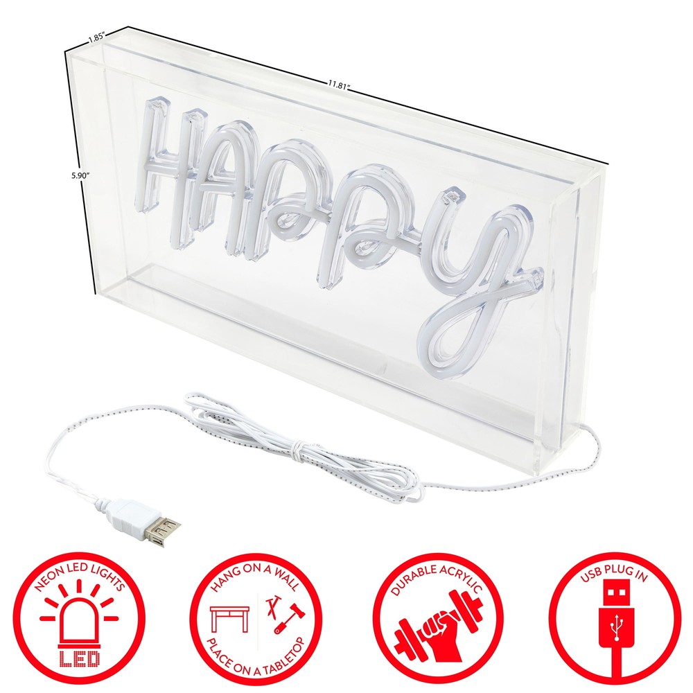 Brighten up your shop or home decor with this colorful LED neon light box from Urban Shop. Measuring 5.90 inches in height, 11.81 inches in length, and 1.85 inches in width, this clear acrylic box is the perfect size for any room. The box features a rainbow design that emits energy-efficient and eco-friendly LED lights, making it a great addition to any space. With its unique happy theme, this light box is perfect for those who want to add a touch of whimsy to their decor. The item weighs only 1.5 lbs and is easy to hang in any room. Whether you're looking to brighten up your shop or add some color to your home, this Urban Shop LED neon light box is the perfect choice.