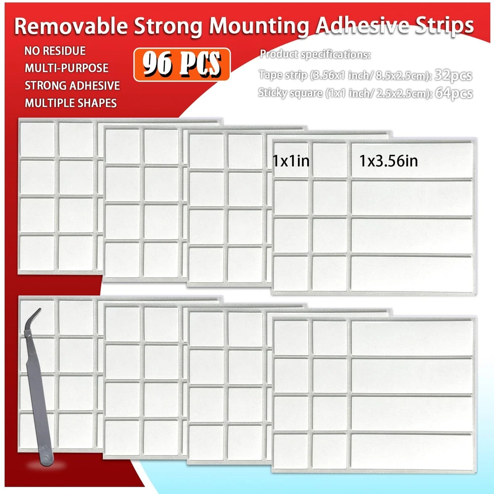 Strong two sided mounting adhesive tape: These adhesive strips, squares are very suitable for hanging and pasting medium-sized and small objects. They are ductile and have excessive adhesion. You will get 96 pieces of Removable tape strips, and combined use can exert greater power Clear removable no residue: These acrylic adhesive strips are transparent and thin 0.8mm, and will not leave glue and traces when removed, and will not pollute your walls and objects. Easy to use, no scissors required, 2 sided tape heavy duty for adults and kids For hanging stuffs, making crafts, party decoration: You can use it to hang pictures, posters, balloons, socket; Stick art crafts, mirrors, and carpets. Tape for home, office, school, party, wedding, decoration and organization. Can also be given as a festival gift to parents, family, and friends. Multipurpose adhesive tape Keep items secured: Provide fixation and protection for your small items, such as car accessories, charger, power sockets, light strips, and desk calendars. These small things often fall and move, so using this mounting squares to stick them is a good idea NOT for Painted Walls: This sticky strips adhesive strip are suitable for smooth and flat surfaces such as plastic, glass, metal, fabric, wood, ceramic tiles. It should be noted that removing it may damage your painted wall, so careful consideration should be given when using it on painted walls