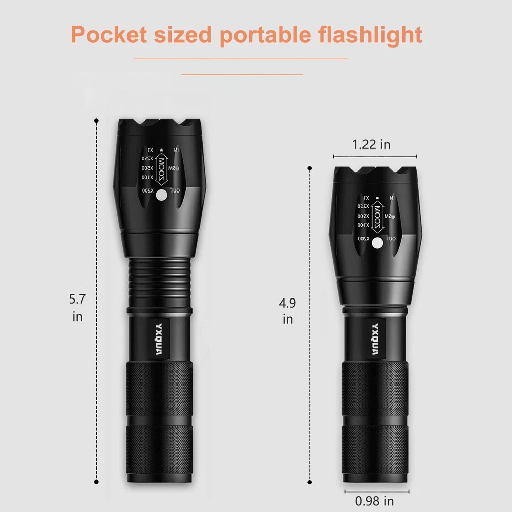 YXQUA USB Rechargeable Flashlights, 8381 High Lumens Lights, 3 Modes, Zoomable & Waterproof Super Bright Flash Light for Camping, Hiking, Emergency Hurricane(2 Pack Emergency Power Supply - USB Rechargeable Flashlight Built-in 2000MAH high-capacity rechargeable battery with the latest rechargeable design, once fully charged, it can work for up to 4 hours and can also be used as a power source to charge your phone for emergencies. Super Bright - YXQUA LED powerful flashlights is equipped with an upgraded chip that produces up to 1000 lumens of ultra-high output and a life span of up to 50,000 hours. Zoomable & 3 light modes - Three useful settings, high brightness; low brightness; strobe (SOS) with adjustable focus for close or long range, as a spotlight that throws a bright beam 600 feet ahead, or as a compact, small floodlight that brings light to people. Waterproof & Tough - The tactical flashlight is designed to be waterproof to IPX6 for use in heavy rain, and the military-grade aluminum body and 10-foot drop impact resistance can withstand rough handling. Portable Size - Non-slip, comfortable handle makes the flashlight always in your hand, the best pocket flashlight for outdoor activities, camping, hiking, fishing and home use. flashlight * Order Cancellation Policy ** You can return a product for up to 30 days from the date you purchased it. 1. The seller reserves the right to cancel the special case only due to eBay cancellation fee. 2. The decision of seller is the final. 3. The seller will respond to the cancellation request within 2 business days. Please wait for the result of cancellation. 4. In case the cancellation is not completed by some reasons, the buyer can follow the options below to get the refund. 4.1 The buyer can reject the item when it arrives. 4.2 The buyer can send the item back to the seller within 30 days If the buyer receives item (USA Shipment ONLY). The seller will provide the FREE return label to the buyer when the buyer opens " Return Item" case on eBay by using the reason as "Change my mind" ONLY. 5. When buyer has placed the order. The order will be processed and completed by automatic warehouse system within 5 minutes. In case that buyer sends the cancellation request after 5 minutes of placing the order, the request will be rejected. **Sending direct message to cancel the order is not allowed for every case.* Return Policy For the return case - If buyer would like to return the items for refund or replacement, please CONTACT SELLER to receive the free return label from seller. The refund or replacement will be processed with the tracking number of return label which is provided by seller only. The other ways of return which are not approved by seller will not be processed for the refund or replacement. SHIPPING Domestic Buyers - We ship within 3 business days of payment, usually sooner - We offer FREE shipping on all orders! - We only ship to the lower 48 states, no APO/FPO addresses or PO Boxes allowed - We have confidence in our products, but if you are not fully satisfied please contact us within 30 days of purchase and you will get full refund. International buyers – please note: Import duties, taxes, and charges aren't included in the item price or postage cost. These charges are the buyer's responsibility. - Please check with your country's customs office to determine what these additional costs will be prior to bidding or buying.