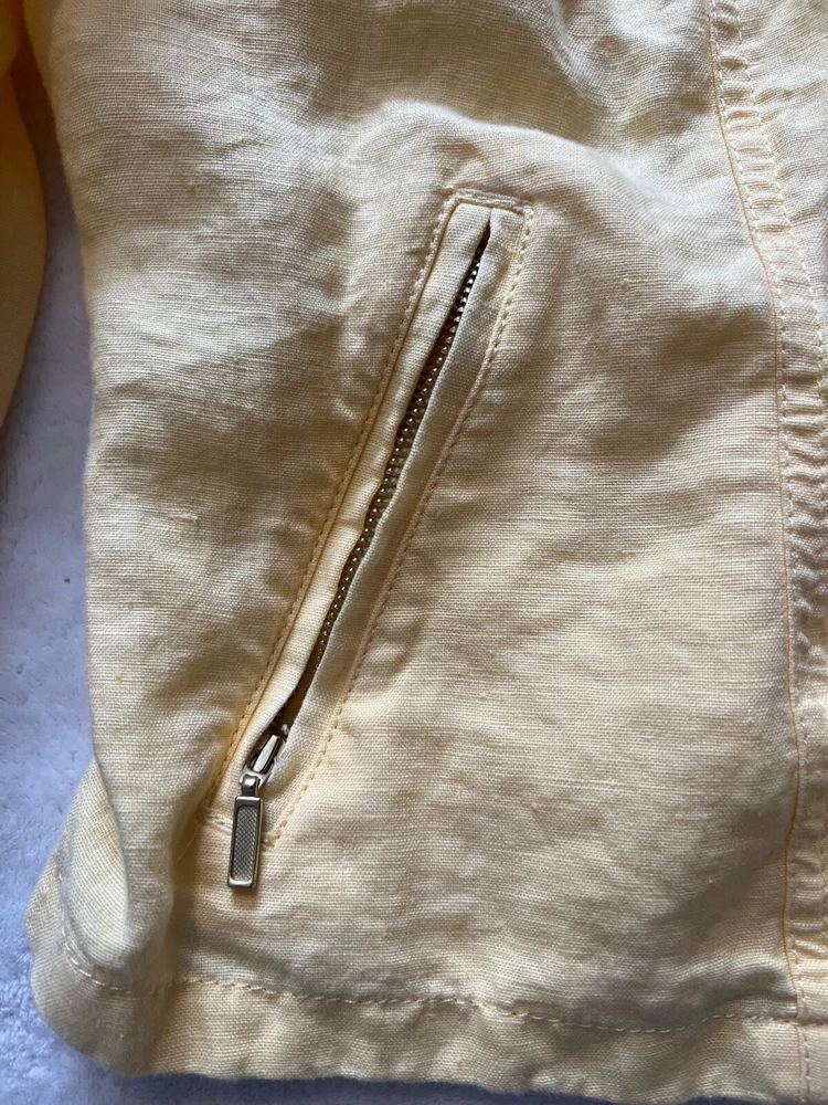 *This is not a new item and does not ship with its original tags. Good condition Size 0 Pockets with zipper closure Long Sleeve Gold accent buttons