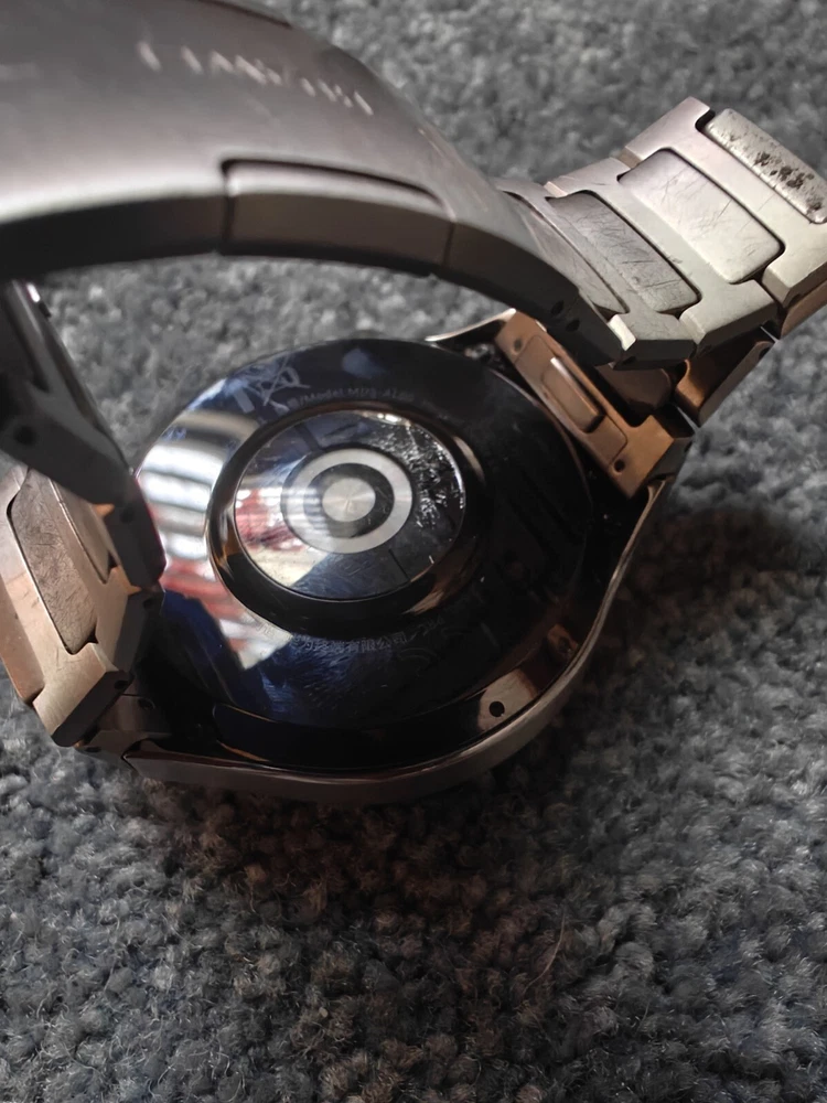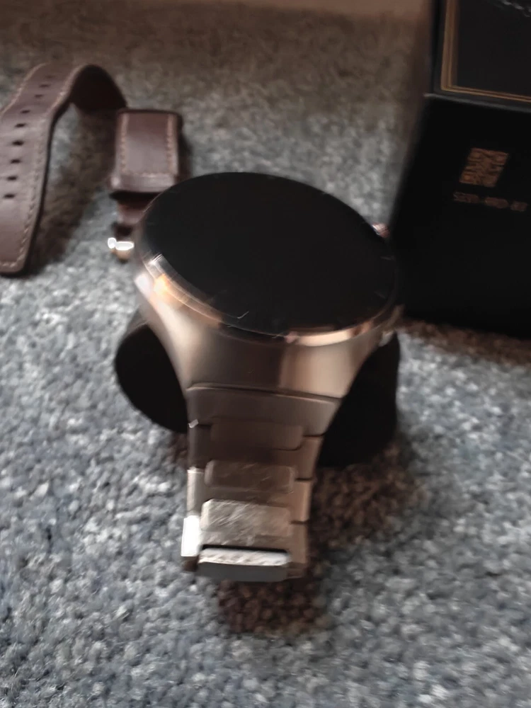 This Huawei Watch 4 Pro smartwatch is a great addition to your collection. With its stunning 49mm aerospace-grade titanium case and dark brown leather strap, this watch is perfect for any occasion. It is compatible with both iOS and Android operating systems and comes with a range of features that will keep you connected and healthy. The watch has a sleek AMOLED display, Bluetooth connectivity, NFC, GPS, and wireless charging capabilities. It also has a blood oxygen sensor, heart rate monitor, and sleep monitor to keep track of your health. With the AppGallery, you can easily access all your favorite apps. This smartwatch is a must-have for anyone who wants to stay connected and healthy. Has a small hair line on watch come with two watch bands one is for small wrist and leather band is for large wrist