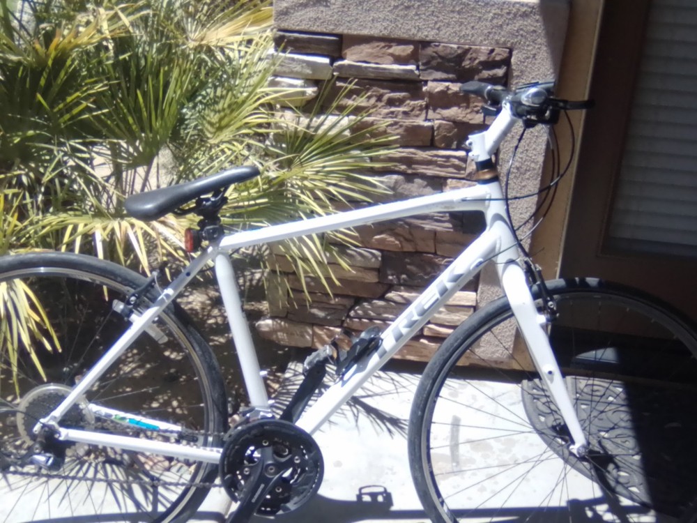 Features: Lightweight, Bottle Cage, Lights - LEDs, Kickstand Frame Size: 9.5 in Color: White Bike Type: Mountain Bike Model: trek fx Material: Carbon Fiber Brand: Trek Brake Type: Rim Brake - Mechanical Department: Men Wheel Size: 29 in