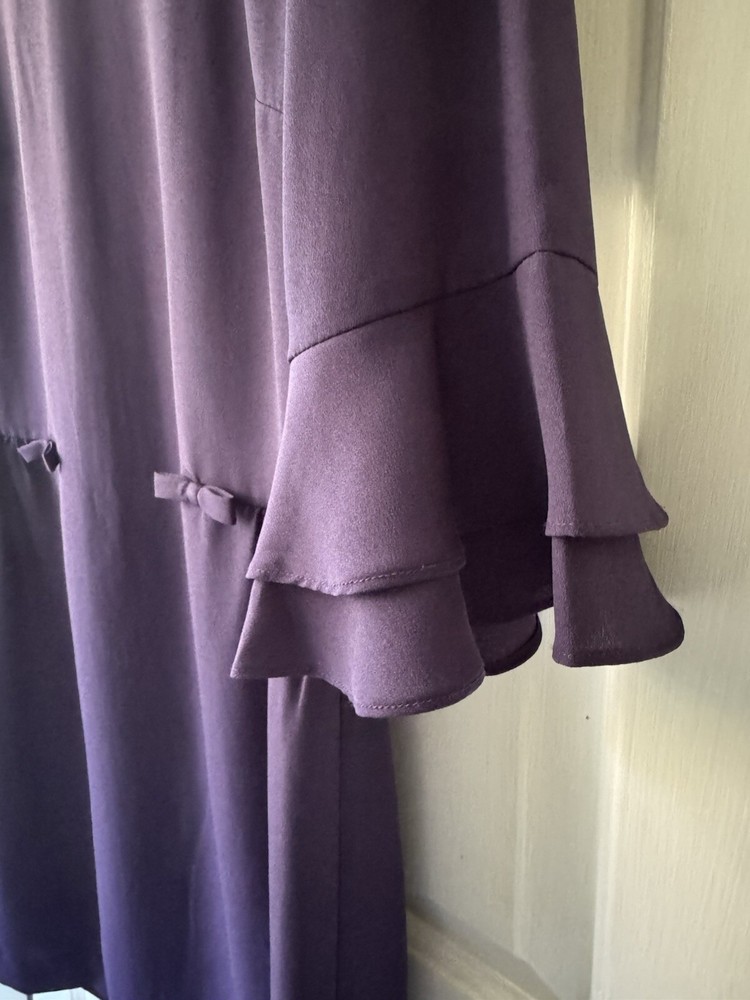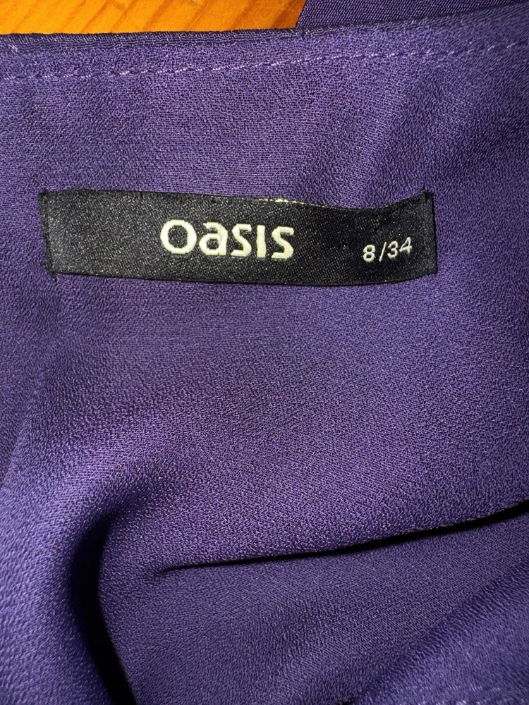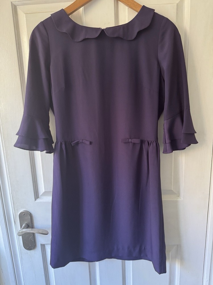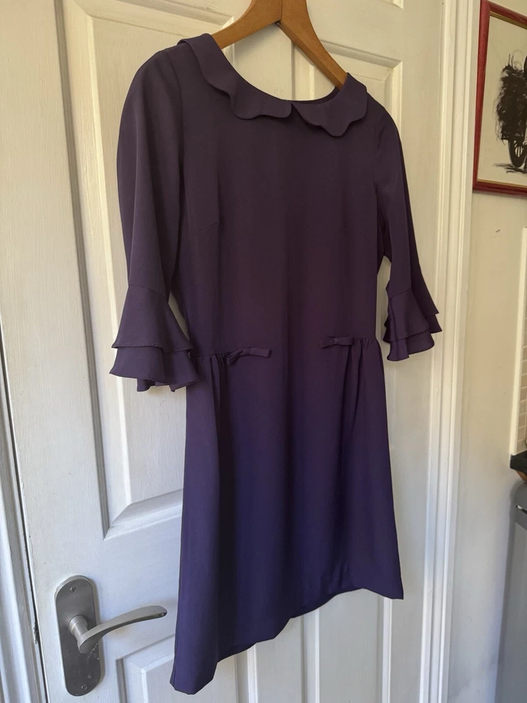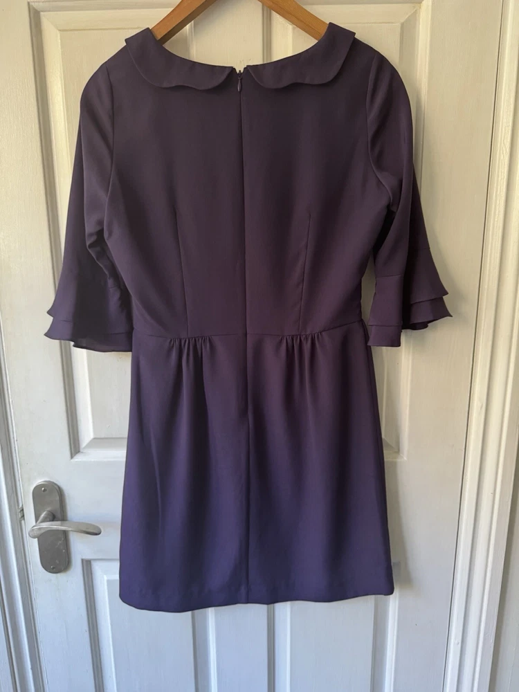Used. Woman's. Oasis. Size UK 8 / EU 34. Short Dress. Scalloped Collar. Fluted Sleeve Cuffs. Bows at the waistline. Lined. Back Zipper Closure. I am also including a purple bead adjustable necklace. Measurements : Chest 36" / Length 33" (please see photographs). Fabric and care instructions : please see photographs. You pay what I pay for shipping