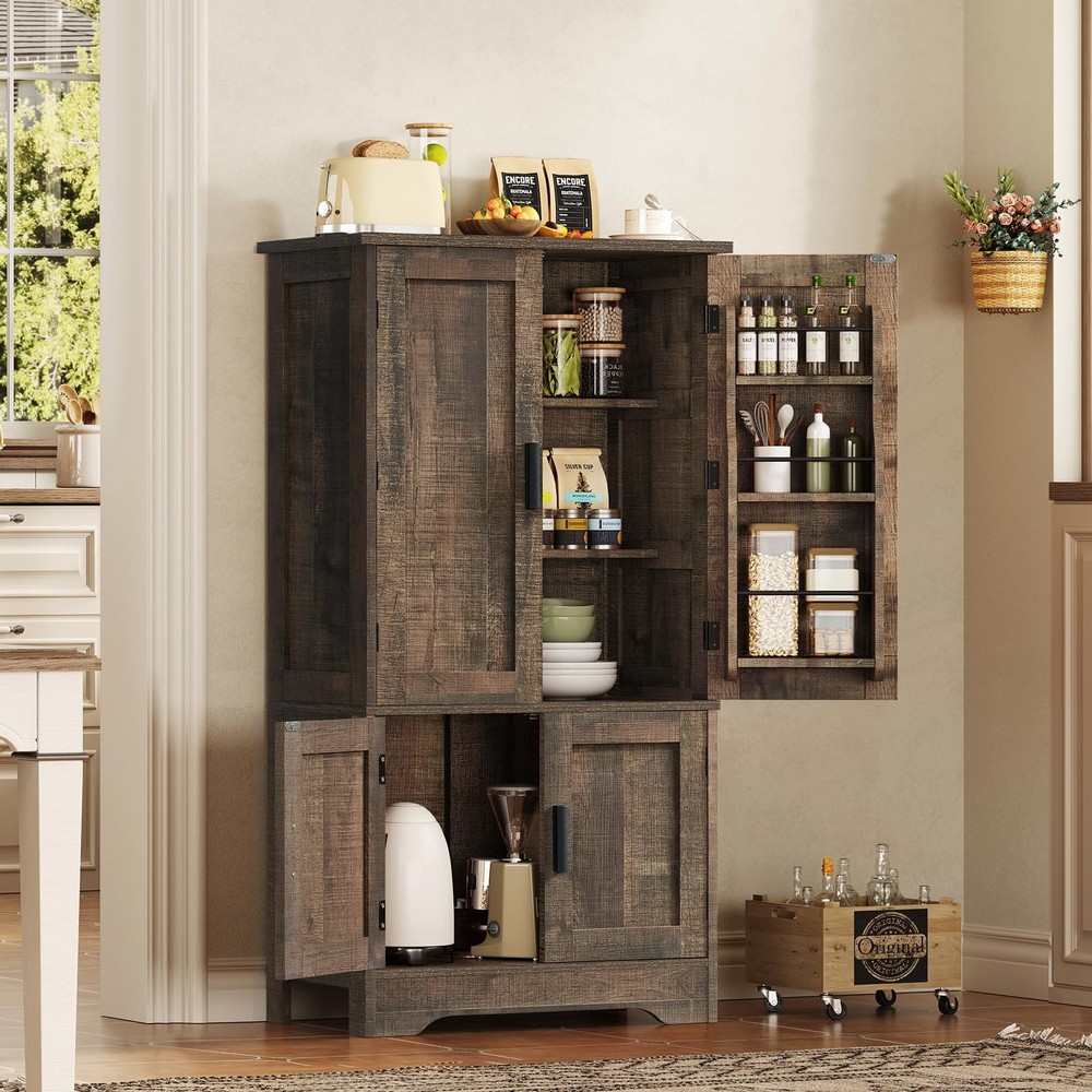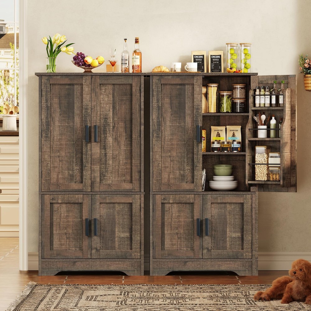 usikey Pantry Cabinet with 4 Doors, Farmhouse Kitchen Cabinet with 6 Door Shelves, Kitchen Pantry with 3 Adjustable Shelves, for Living Room, Kitchen, Antique Oak 【Pantry Cabinet Size】11.8"D x 23.6"W x 43.3"H; Weights: 37.9LB 【Master Organizer】This pantry storage cabinet comes with 2 large double-door storage cabinets, and 1 bottom storage that can meet different heights of storage needs, suitable for everything from your food and utensils to your kitchen appliances. In addition, the upper door cabinet also has 6 hanging shelves for storing your olive oil, spices and other kitchen items, which are easy to find and access 【Multi-functional Pantry Cabinet】This pantry cabinet presents a farmhouse style. With its elegant rustic finish, black pulls and smooth shape design, the storage cabinet fits perfectly into a variety of spaces such as kitchen, dining room, bathroom, living room, study or hallway. It not only provides ample storage space but also adds a touch of rustic beauty. 【Strong & Safe】This tall kitchen pantry is made of P2 grade MDF with a wider and heavier base to ensure stability. In addition, we have equipped you with a reinforced back panel and anti-tilt devices so that you can attach the tall kitchen pantry cabinets to the wall to prevent the pantry from tilting and swaying. 【Easy to Assemble & Service Guarantee】This pantry storage cabinet provides a detailed step-by-step assemble instruction chart and all accessories are labeled with numbers, so you don't have to worry about assembly. Meanwhile, if you have any problems with the installation, please let us know. We will reply to you within 24 hours.