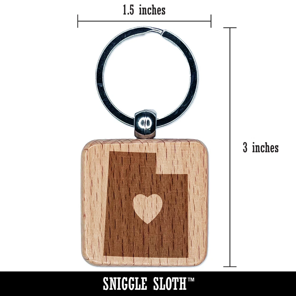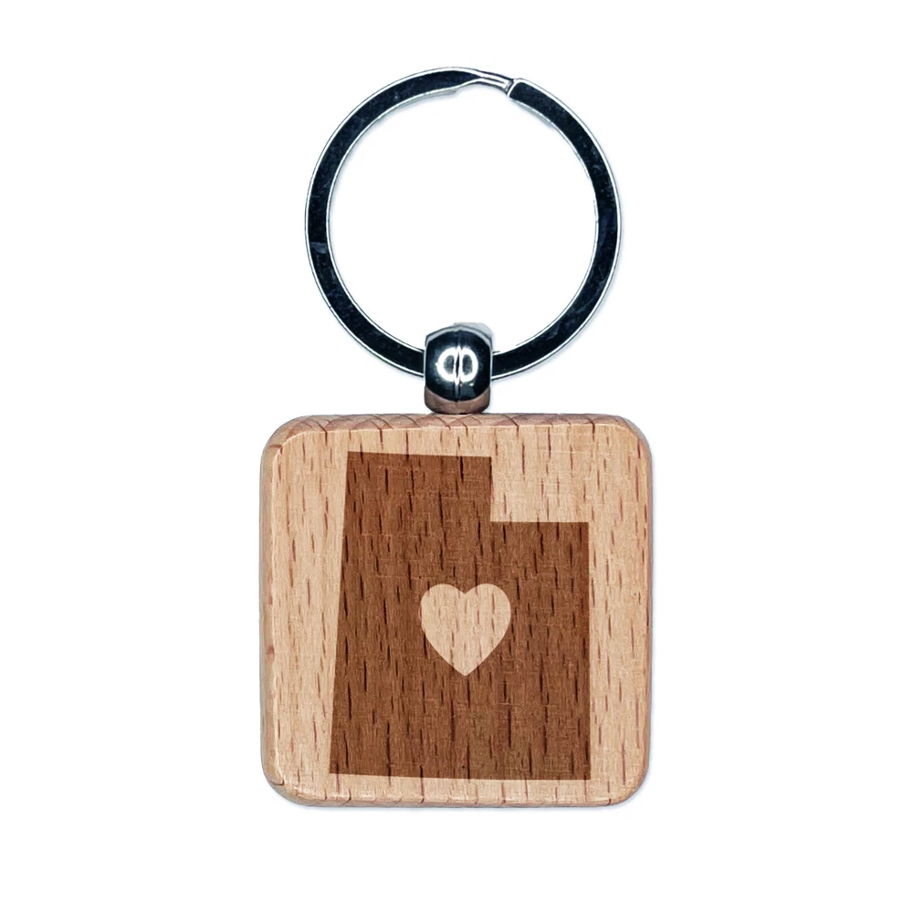Utah State with Heart Engraved Wood Square Keychain Tag Charm