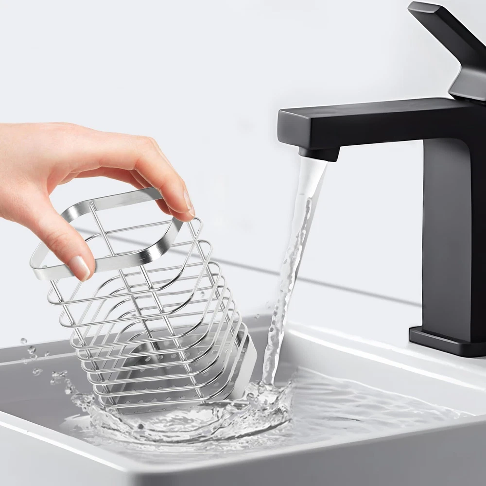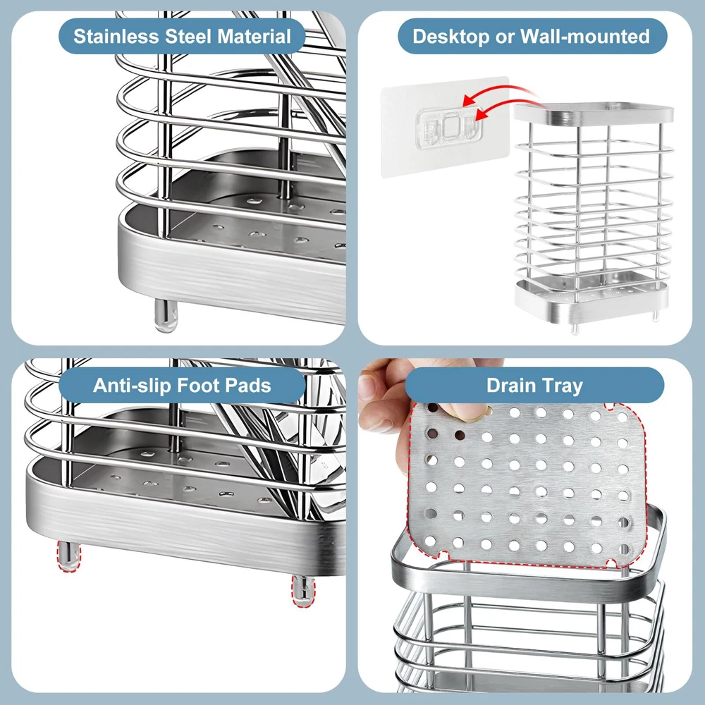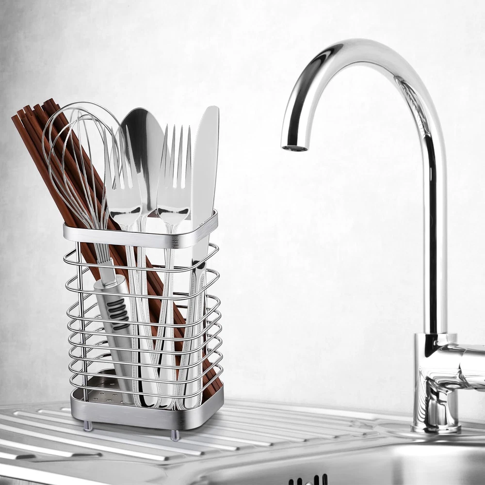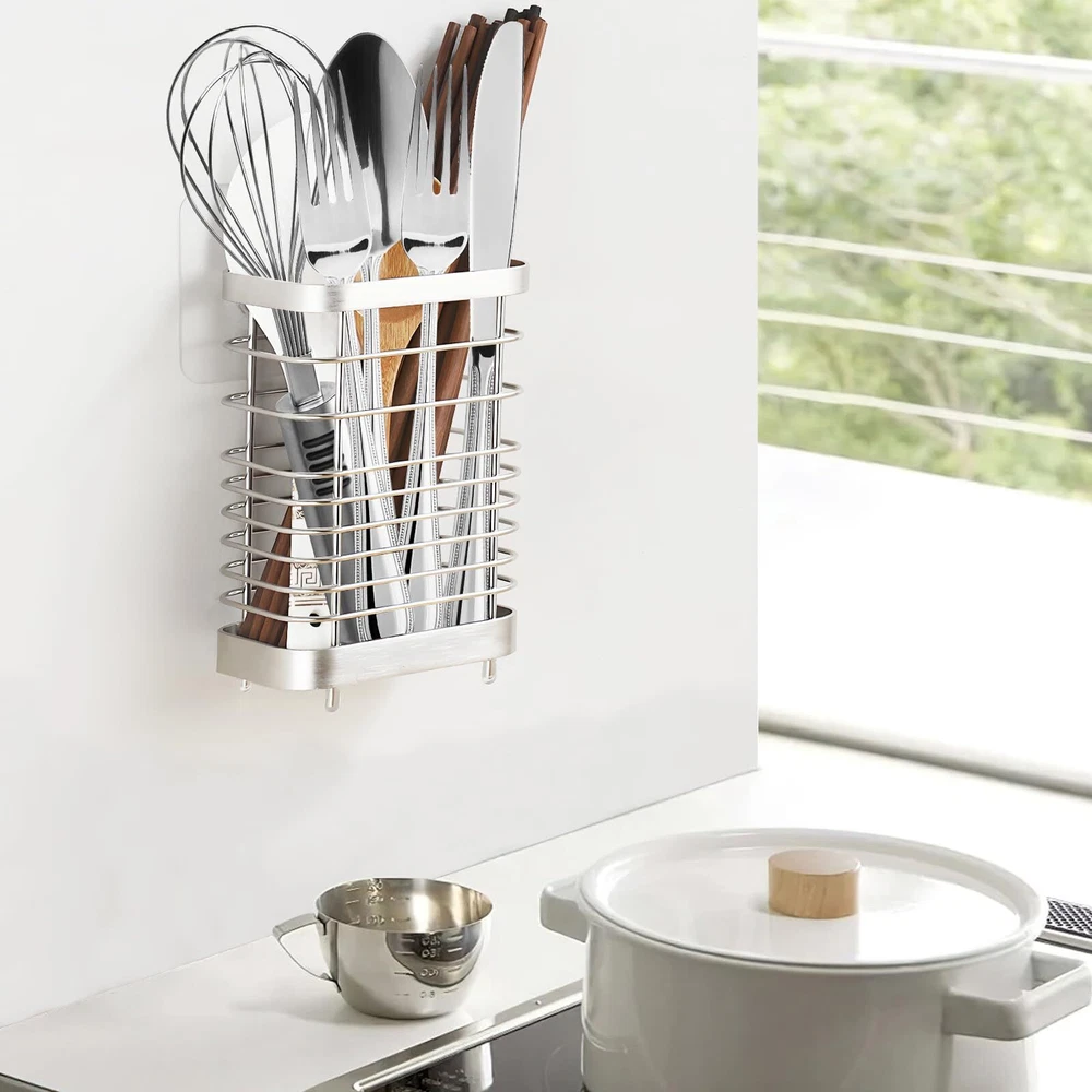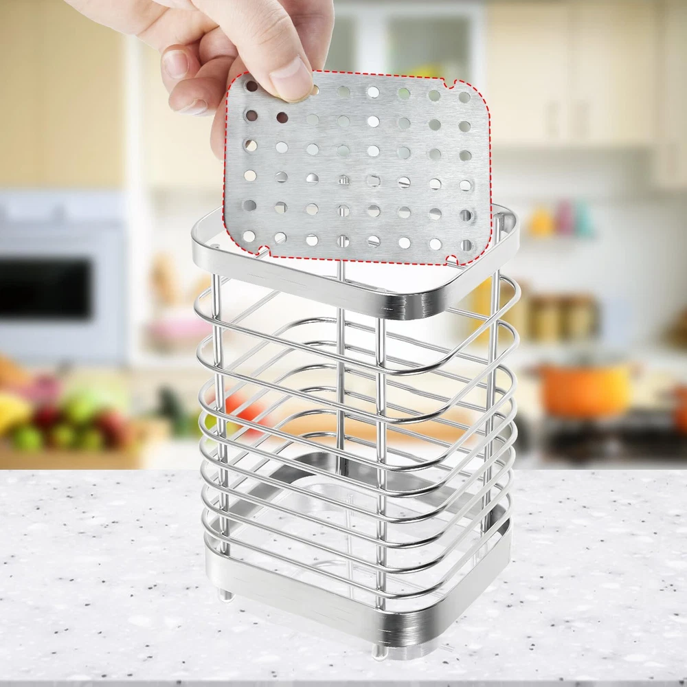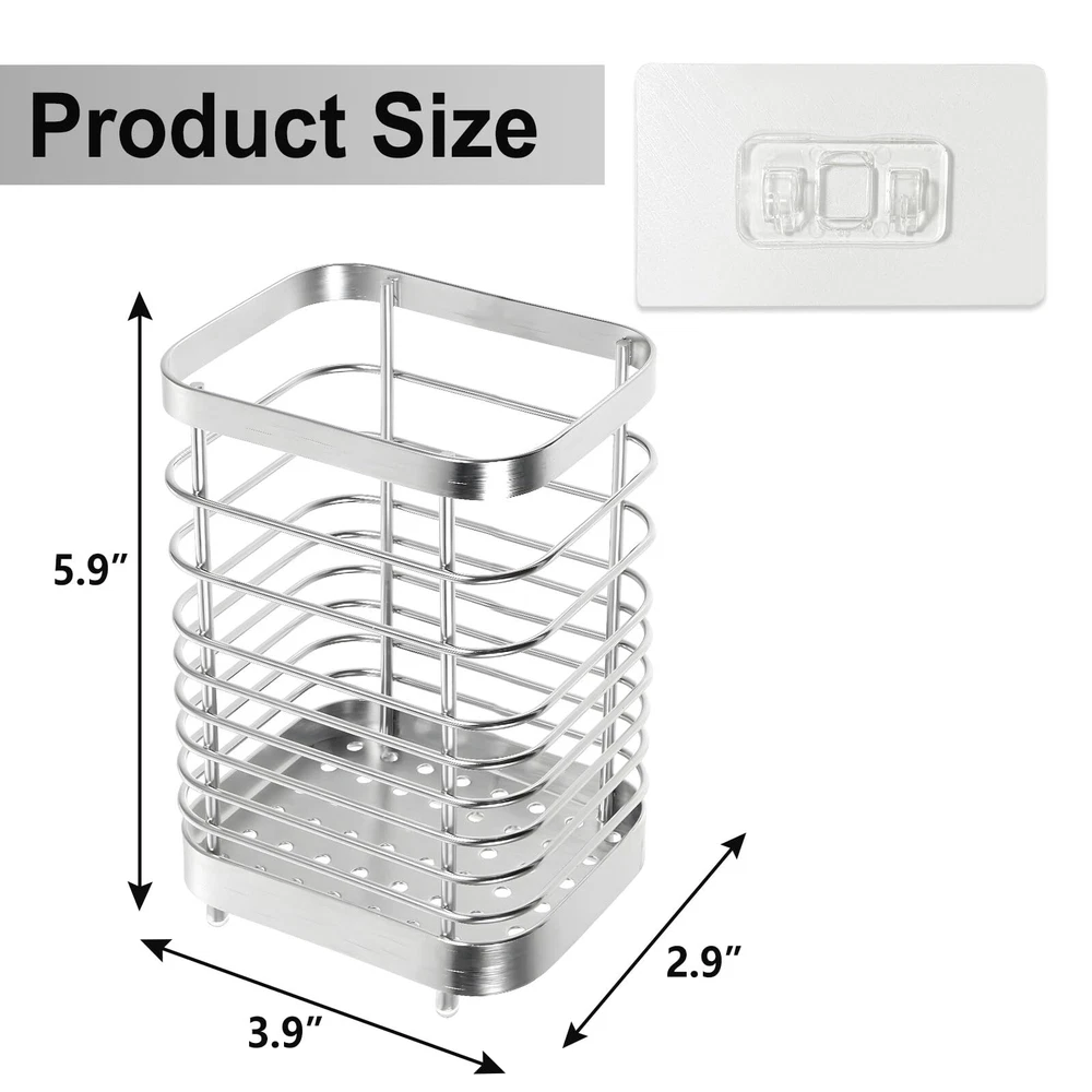Kitchen Utensil Holder: stainless steel utensil holder can be wall mounted or placed on the kitchen counter, breathable and easy to dry, providing a comfortable storage environment for your tableware and cookware. High-Quality Stainless Steel Material: This kitchen utensil rack is made of durable stainless steel and uses 4 sturdy cylindrical legs to securely attach to the countertop without slipping or wobbling. Cutlery Holder Size: 3.9"L x 2.9"W x 5.9"H, it can holder kitchen essentials such as knives, forks, chopsticks, spoons, spoons, etc., your cutlery in categories. Easy to and access, keeping your kitchen feeling neat and tidy. Keep Dry & Easy to Clean: stainless steel cutlery holder has drainage holes at the bottom, which have drainage and ventilation functions to keep your dishes dry. Removable bottom makes the cutlery rack easier to clean. Wall Mounting: Our kitchen utensil organizer comes with a clear adhesive backing that makes it easy to install it on smooth walls. You can also place the utensil storage rack directly on the kitchen table to keep cooking tools within easy reach and save space.
