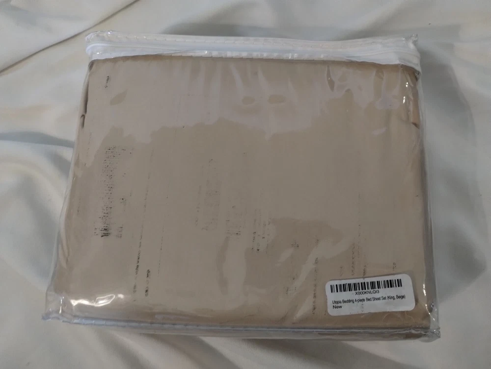 Note - Only the plastic case is marked, bedding is not. See picture of the back of the item. About this item Microfiber BED SHEET SET - King size 4-piece bed sheet set comprising of 1 flat sheet measuring 105 by 102 inches with a 2 inches self-hem, 1 fitted sheet measuring 78 by 80 inches with a 15 inches box for over-sized bedding and 2 pillowcases measuring 20 by 40 inches each with a 4 inches hem ALL-AROUND ELASTIC - The all-around elastic used in the fitted sheet makes it fit easily onto the mattress while giving a nice finish to the bed BRUSHED MICROFIBER POLYESTER - Brushed microfiber polyester fabric makes the sheet set exceptionally soft SMOOTH AND COMFORTABLE - The smooth feel of the sheet is very cozy which keeps you cool during summers and warm during winters SHRINK AND FADE RESISTANT - The microfiber material is processed to make it resistant to shrinkage and fading which adds to the longevity of the set by keeping it in great condition CARE INSTRUCTIONS - Machine wash, tumble dry or iron on low temperature; do not bleach