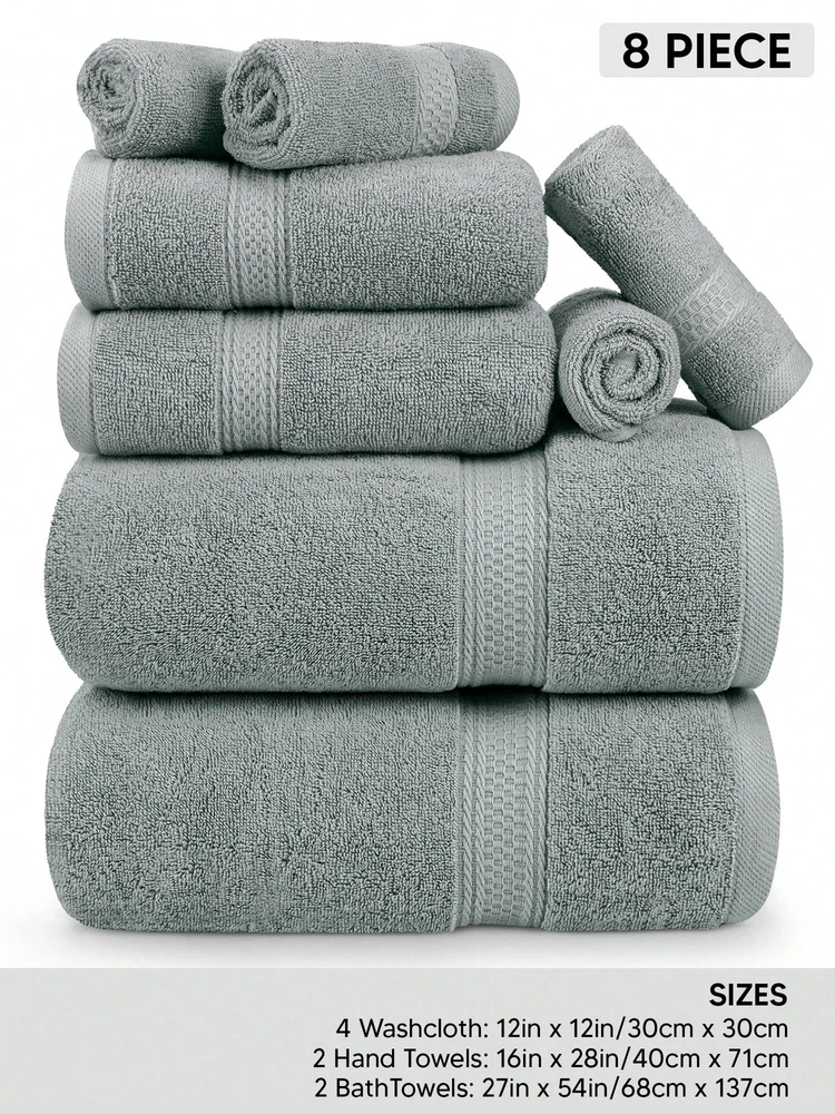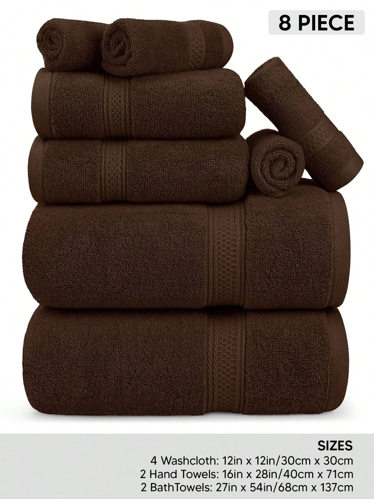 Indulge in a spa-like experience with our 8-piece towel set, including 2 bath towels (27 x 54 inches), 2 hand towels (16 x 28 inches), and 4 washcloths (12 x 12 inches). Crafted from 100% ring-spun cotton, these towels are exceptionally soft, breathable, and durable for everyday use. Designed for versatility, they are perfect for bathrooms, gyms, pools, salons, spas, or even camping trips. Featuring double-stitched hems, the towels have a clean, refined edge that prevents fraying and enhances their aesthetic appeal. Lightweight yet highly absorbent, they provide a gentle touch while effectively drying your skin. For lasting quality, avoid direct contact with cosmetics or creams during use.