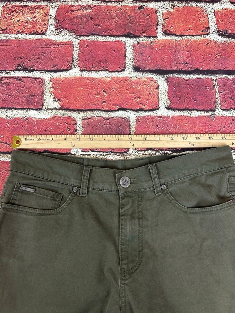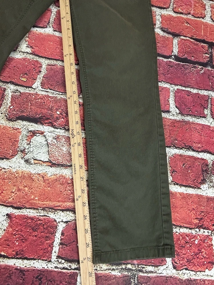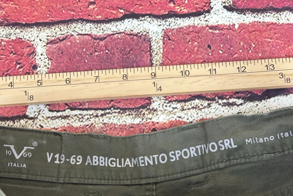 Versace V 1969 Italia jeans for men in green, size 36 x 32. These slim-fit denim jeans feature a mid-rise, bootcut style with a distressed acid wash. They have a 5-pocket design with button and zipper accents, and are made of stretchy cotton fabric. The jeans are machine washable and suitable for all seasons.