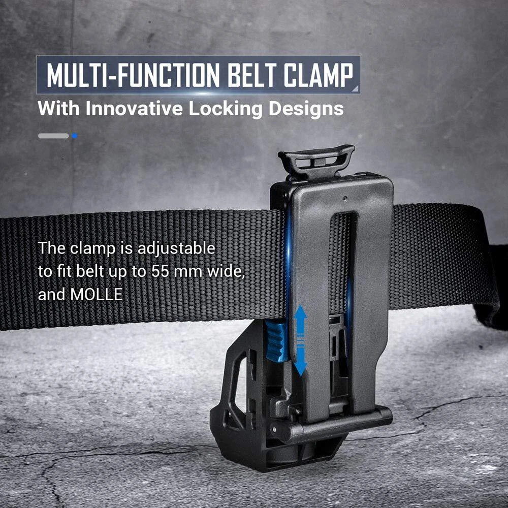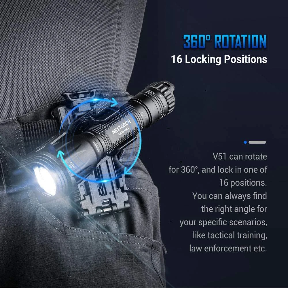【360 degree roration,16 locking positions】V51 can rotate for 360 degree and lock in one of 16 positions for 1-1.25'' flashlight,can find the right angle for your need. Remember to adjust the holder width via twisting the pin before putting your flashlight in the holster. 【Multi-function belt clamp】With innovative locking designs,the clamp is adjustable to fit belt up to 55 mm wide and MOLLE 【Tactical response】Quick to react,V51 can be done single-handedly and quickly to shorten your critical response time during emergency 【Detachable design and Easy Operation】Reliable locking block design,pull up to unlock and push down to lock in for a sturdy lighting 【Lightweight and portable】 Made of engineering plastics,which is lightweight,wear-resistant and corrosion-resistant.