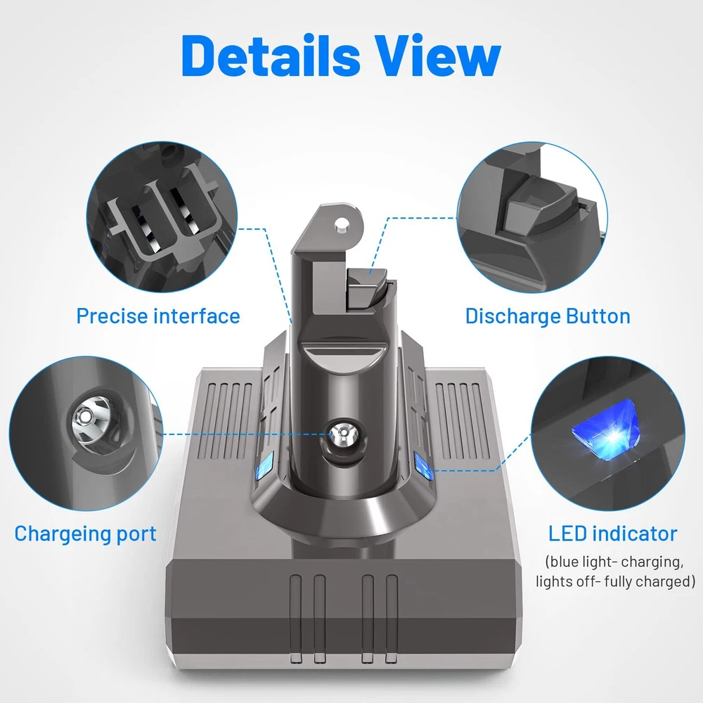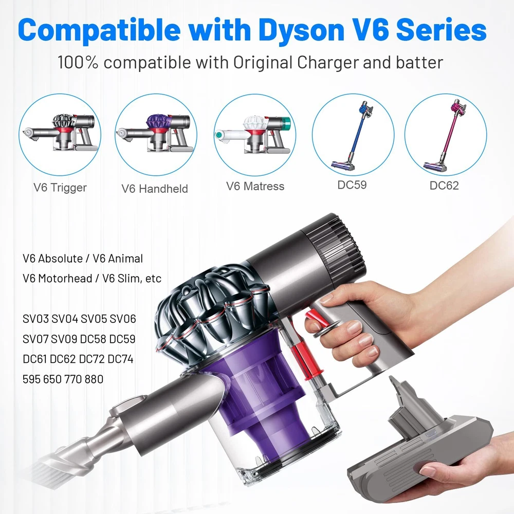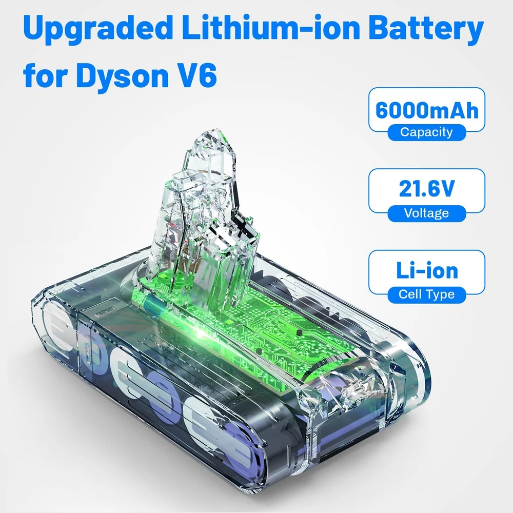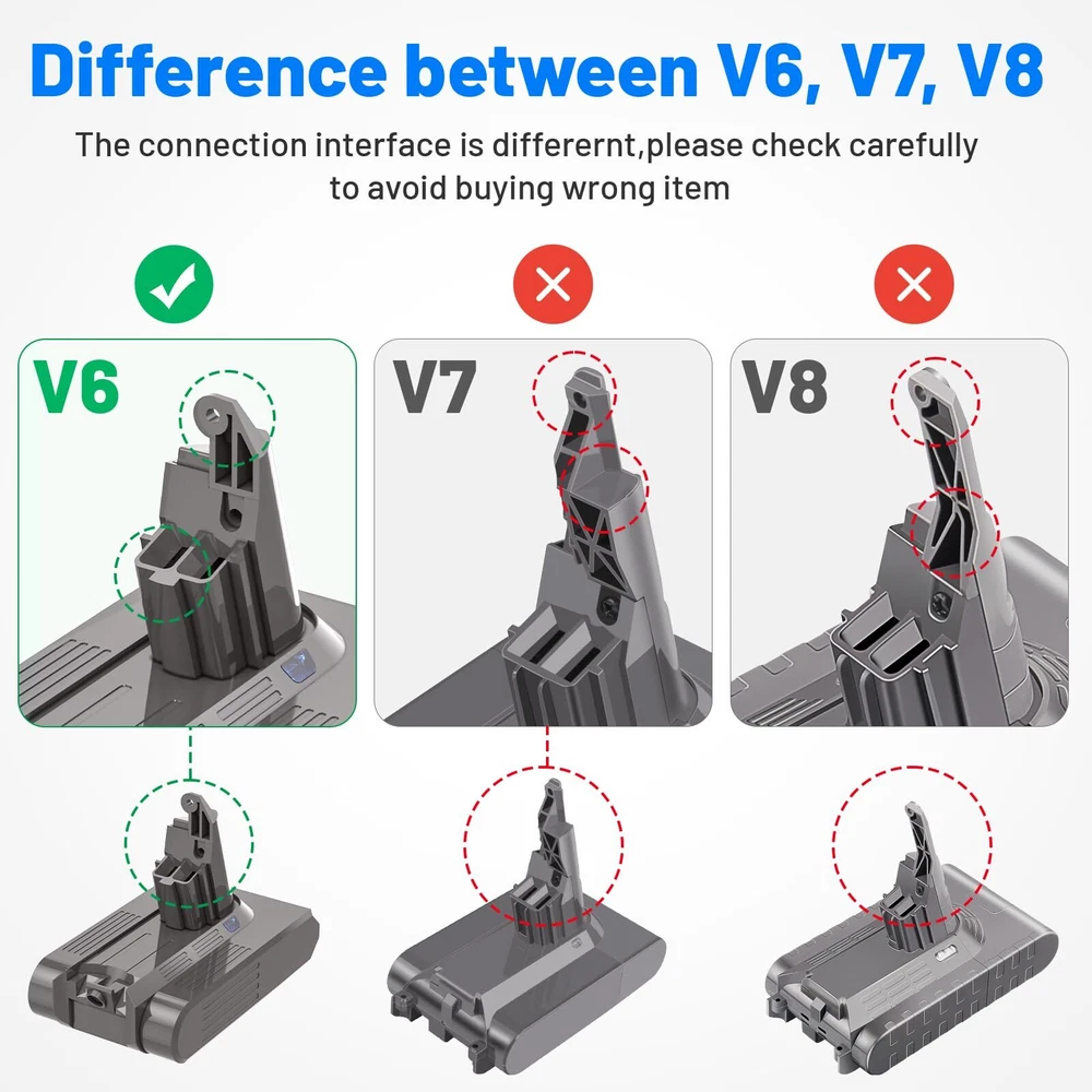Excellent Battery Performance - The battery for V6 is 21.6 Volt, 6.0Ah(6000mAh) Lithium-ion type,upgraded and high capacity battery cell makes your vacuum more powerful and longer lifetime Wide Compability for v6 battery replacement- Exactly compatible with V6 Animal Absolute Motorhead Fluffy Slim SV03 SV04 SV05 SV06 SV07 SV09 DC58 DC59 DC61 DC62 DC72 DC74 Vacuum Cleaners. It also fits the original docking station and charger Smart Charging Protection - The battery replacement for DC62 equipped with premium lithium battery cell. Built-in multiple circuit protection(over-charging, short-circuit, over-heated, and over current protection) Own Factory, Reliable Quality - The battery replacement for SV04 is produced by our own factory, strictly follows the standard of IS09001 to producce. All of the batteries are passed FCC, RoHS and CE test, more safe and reliable Guaranteed After-sale Services - The battery for DC59 is with 30 days money back and 12 months warranty. Any questions or problems, please contact us via (order history-contact seller). Our after-sales team will reply you within 24 hours