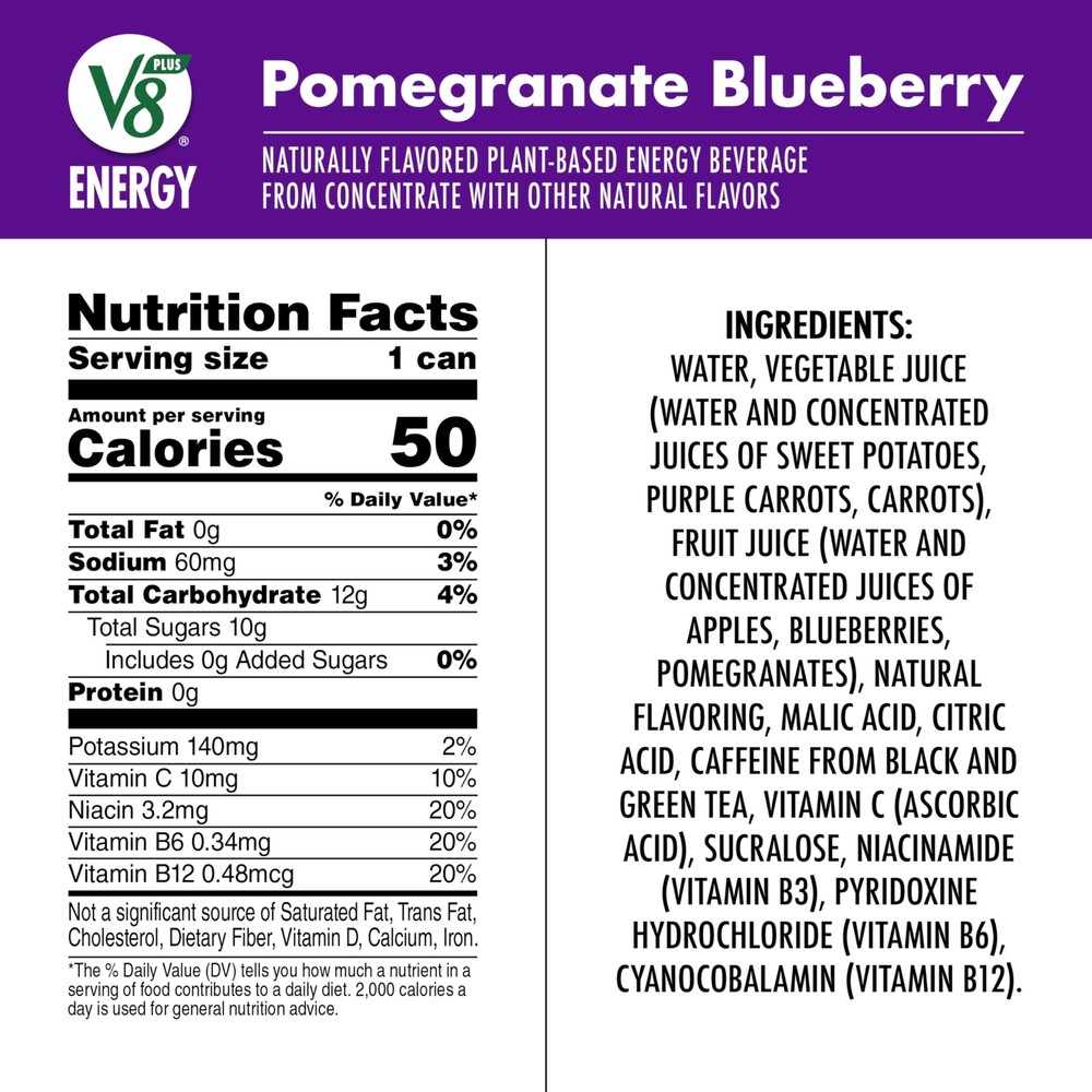 V8 +Energy Pomegranate Blueberry Juice Energy Drink, 8 fl oz Can (24 Pack) Twenty-four (24) 8 fl oz cans of V8 +Energy Pomegranate Blueberry Juice Energy Drink A pomegranate blueberry flavored fruit and vegetable juice blend infused with natural energy from black and green tea Each can contains 1 combined serving of veggies and fruit along with 80 milligrams of caffeine – as much as leading energy drink brands A healthy energy drink alternative with 50 calories and 12 grams of carbs per can; an excellent source of B Vitamins Non-GMO and gluten-free with no sugar added* and no artificial colors (*Not a low calorie food; see nutrition panel for sugar and calorie content) Shipping We offer FREE shipping on all orders! We ship within Three business days of payment, usually sooner. We use a selection of shipping services such as UPS, FedEx, USPS etc. We only ship to the lower 48 states, no APO/FPO addresses or PO Boxes allowed. Local pickups and combined shipping options are not provided at this time. Return You can return a product for up to 30 days from the date you purchased it. Any product you return must be in the same condition you received it and in the original packaging. Please keep the receipt. Payment We accept payment by any of the following methods: PayPal Please pay as soon as possible after winning an auction, as that will allow us to post your item to you sooner! Feedback Customer satisfaction is very important to us. If you have any problem with your order, please contact us and we will do our best to make you satisfied. Contact Us If you have any queries, please contact us via ebay. We usually respond within 24 hours on weekdays. Please visit our eBay store to check out other items for sale! Thank you for shopping at our store.