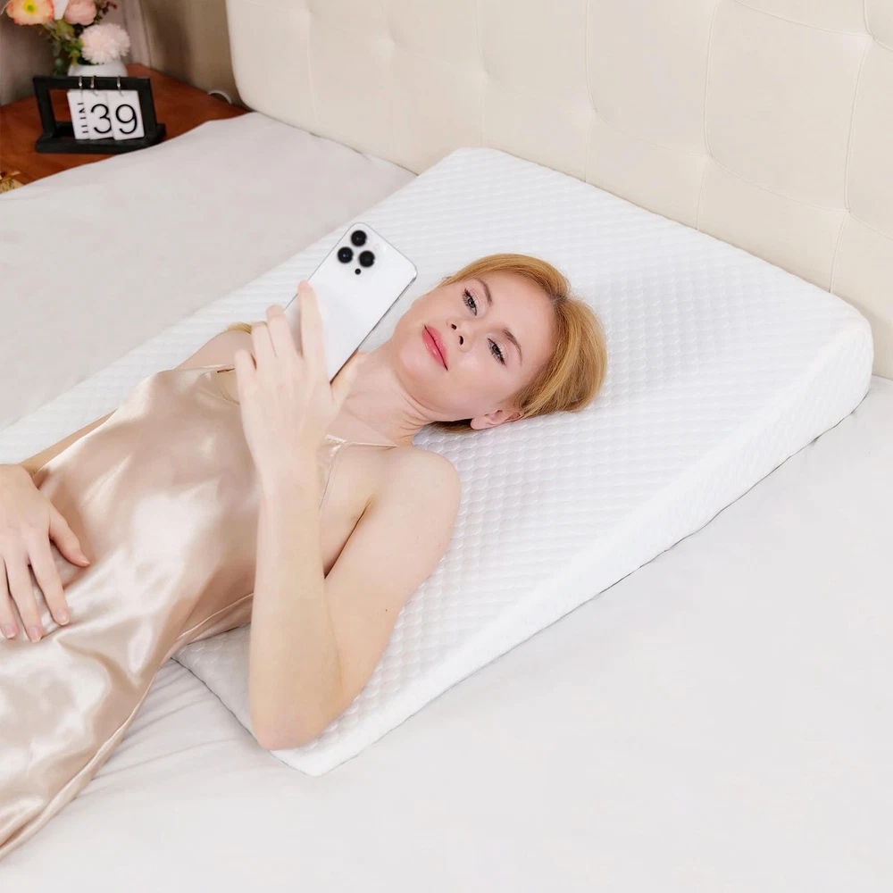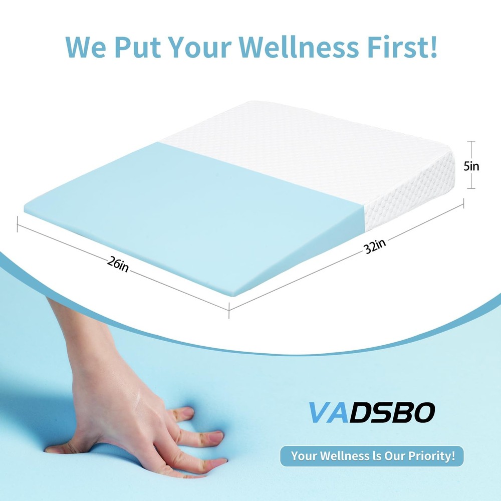 At VADSBO, our mission is to enhance every life by providing exceptional sleep solutions. We are grateful for the trust our customers place in us. As a reliable and professional brand of wedge pillows, we have served thousands of customers, helping them achieve restful and comfortable sleep. We are committed to continually improving our products and services, ensuring every customer enjoys a truly comfortable sleeping experience. Join the VADSBO family and experience the ultimate in sleep comfort! Specifications Pillowcase Material:35% bamboo fiber + 65% polyester fiber Foam Material:High density Foam Foam hardness: 30D Color:White/Gray Size:32x26x5in/80x66x12cm Package Included: Pillowcase x1 Foam x1 Care Instructions: Hand wash or machine wash cold on a gentle cycle Do not iron Use a mild detergent WARM REMINDER: Upon receiving the triangular wedge pillow, it is advisable to place it in a cool, well-ventilated area for a duration of 24 hours. This practice will assist in dissipating any smell associated with the new pillow and allow it to fully expand, thereby achieving optimal comfort and providing the appropriate level of support and balanced firmness PREMIUM MATERIAL: Our wedge pillow is made from a solid 30D high-density foam that offers durable support and quick rebound. The foam adapts to your body’s contours, providing tailored comfort and relaxation. Its resilient structure ensures long-lasting use 15° ERGONOMIC DESIGN: The bed wedge pillow features a scientifically designed 15° incline, providing 5-inch height support. This triangle wedge pillow ensures maximum comfort and proper alignment for reading, sleeping, leg support, and knee support MACHINE WASHABLE PILLOWCASE: Our triangle bed wedge pillow comes with a premium air-layered fabric pillowcase that’s both soft and breathable, offering comfort and easy maintenance. The U-shaped opening design ensures effortless cleaning. Note: The foam inside is NOT machine washable MANY PURPOSES: This versatile pillow offers gentle support for a restful sleep and can be used in multiple ways. Whether for reading, watching TV, working, or sleeping, it provides head, back, and knee support. Ideal for relaxing or for pregnant women, it ensures comfort and relaxation throughout the day ABOUT VADSBO: Your satisfaction is our top priority. If you encounter any issues with our product, please contact us first—we’re committed to resolving any concerns quickly and efficiently. Our 24/7 customer service team is here to assist, ensuring a positive experience