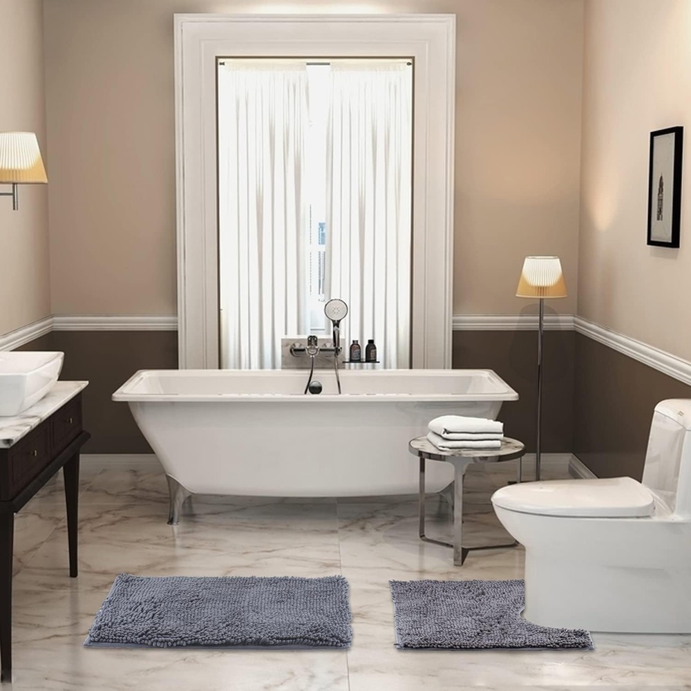 VAGAU Bathroom Rugs Chenille Bath Mat Sets 20"x32"+U Shape 20"x20", Dark Grey Product Details Brand: VAGAU Size: 20"x32"+U Shape 20"x20" Material: Chenille Weave Type: Machine Made Item Weight: 3 Kilograms Pile Height: High Pile Construction Type: Machine Made Back Material Type: Rubber Color: Dark Grey Indoor/Outdoor Usage: Indoor Is Stain Resistant: No Product Care Instructions: Machine Wash Pattern: Leaf Shape: Rectangular Special Feature: Absorbent,Machine Washable,Non-slip Room Type: Laundry Room Product Dimensions: 31"L x 19"W Rug Form Type: Bath Mat Style: Modern Occasion: Housewarming Number of Pieces: 2 Item Thickness: 2 Centimeters Water Resistance Level: Not Water Resistant Item Weight: 6.6 pounds Manufacturer: Comfy Mee PERFECT SIZE &WIDE USE- VAGAU plush shaggy Chenille rugs set includes 1 Large Bath Mat 20"x32", 1 U-Shape Contoured Toilet Mat 20"x21".Versatile Colors colors to choose, making it easy to go with any home decor. Great for bathroom, vanity, vacation home, master bathroom, kids bathroom, guest suite. Great gift idea for all occasions, Christmas, Wedding, Fathers Day, Mothers Day, Valentines. COMFORTABLE AND LUXURIOUS – This bath mat for bathroom is made of thousands of individual microfiber shags, which are more soft and density, cozy, fuzzy, comfortable, offers exceptional softness and comfortable to your toes and protects your feet from cold bathroom floor.You can enjoy superior comfort when you step on it.Thicker and better constructed than most other brands. ANTI-SLIP– Our Bath Mat Rug is backed with high quality PVC material of skid-resistant bottom to prevent shifting and skidding and that will hold up for years to come, unlike other rugs with the rubber backing tends to wear and peel off after a number of washes. It reliably grips the floor keeping the rugs in place. Rugs provide a secure place to stand when getting in and out of the shower or tub. Great for kids, teens, adults and seniors.CAUTION: Place rug on DRY &SMOOTH SURFACE only. ULTRA ABSORBENT- The mat is consist of 3 layers, the top layer is 1" long individual microfiber pile, which are made of thick Chenille fabric; the middle layer is sponge;the bottom is PVC mesh. With this high-quality construction, the bath rugs can help to absorb water in seconds. MACHINE WASHABLE & DRYABLE- Just toss them in washing machine in cold water with mild detergent. Please do not use chlorine or bleach. Tumble dry on low heat or lay to air dry. Our bath rugs color will stay nice and vibrant for years to come no matter how many times they’ll be washed and dried!The super soft material will not shrink or turn rough after the wash, keeping your bathroom rug in the same shape as the day you bought it.