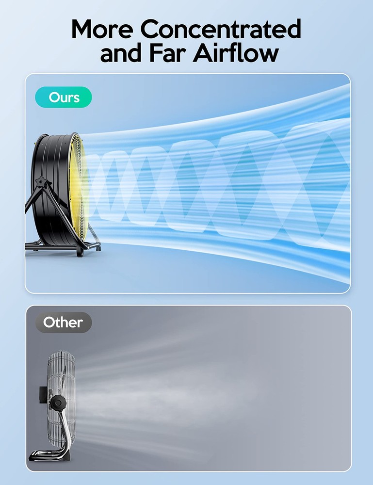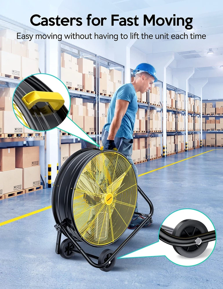 ๐๐จ๐ซ๐ ๐๐จ๐ง๐๐๐ง๐ญ๐ซ๐๐ญ๐๐ ๐๐ข๐ซ ๐ ๐ฅ๐จ๐ฐ: The barrel fan body with edges and square fan blade design concentrates the wind better and allows it to blow farther, which is ideal for cooling large spaces like patios, garages, or warehouses. Enjoy your cooling wind easily when heat waves hit ๐๐๐๐ ๐๐จ๐ฐ๐๐ซ๐๐ฎ๐ฅ ๐๐จ๐ญ๐จ๐ซ: High-powered (320W) premium motor allows the 24-inch floor fan to produce a greater volume of air. Perfect for markets, patios, garages, barns, gyms, basements, commercial settings, industrial settings, factory floors, and anywhere strong and reliable air movement is needed. Any accessories missing can ask for sending replacement parts. ๐ ๐๐ฉ๐๐๐๐ฌ & ๐๐๐ยฐ ๐๐ข๐ฅ๐ญ: Our floor fan offers 3-speed options, so you can easily find the perfect level of airflow for your needs. The industrial drum fan features a 360ยฐ pivoting function and tilt adjustable design, allowing you to direct the airflow in multiple directions over a wide space ๐๐จ๐ซ๐ญ๐๐๐ฅ๐ & ๐๐จ๐ฏ๐๐๐ฅ๐: Equipped with a no-slip handle, big wheels, no-skid positioning legs, and a long power cord, the movable 24 inch floor fan can be placed almost anywhere on a flat surface, making it a highly versatile cooling/ ventilation solution ๐๐๐๐ ๐๐จ๐ง๐ฌ๐ญ๐ซ๐ฎ๐๐ญ๐ข๐จ๐ง: VAGKRI floor fan is constructed from steel materials that can withstand regular use and extend its longevity. The solid blades and high-density pitch metal grid meet ETL standards for safety, ensuring the safety of the standing fan