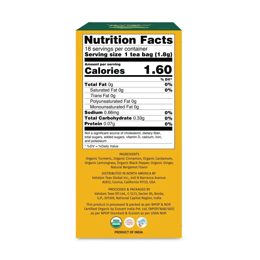 VAHDAM, Organic Turmeric Citrus Ginger Herbal Tea (18 Count) Caffeine Free, Gluten Free | 100% Pure Herbal Blend - Citrusy & Savory | Eco-Friendly Individually Wrapped Tea Bags | Direct from Source Description Features: Harvested in India - Turmeric Citrus Ginger Herbal Tea crafted with turmeric, ginger, and lemon sourced directly from Indian farms, with no middlemen involved, grown sustainably and free from artificial flavors. Citrusy Turmeric Ginger Tea - Our tea offers a warming spice of turmeric and ginger with a balance of tangy citrus note from lemon with a hint of natural sweetness. Being caffeine-free it's perfect for any time of the day. A Brand With a Billion Dreams - Feel alive with VAHDAM Indias premium teas. A leading global brand, we ship to over 3 million customers in 130+ countries. Proudly carbon-neutral and plastic-neutral, we invest in environmental sustainability under our home-grown, sustainable label. Ethical, Direct & Fair-trade - Our supply chain ensures you get the freshest tea while farmers receive fair prices. We reinvest 1% of our revenue into the education of our tea growers' children through our Teach Me initiative, honoring their aspirations and supporting their future. Product Details: Brand: VAHDAM Item Form: Teabags Flavor: Turmeric Tea Variety: Turmeric Unit Count: 1 Count Package Dimensions ‏ : ‎ 5.2 x 3.19 x 2.8 inches; 2.4 ounces UPC ‏ : ‎ Manufacturer ‏ : ‎ VAHDAM Country of Origin ‏ : ‎ India Handling We will ship all orders within 3 business days of payment. Delivery We do not ship outside of the Continental US. Feedback We take our reputation seriously, we buy and sell online, so we understand the value of trust. If you are unsatisfied with your order, please contact us and we will work with you to resolve it to your satisfaction.