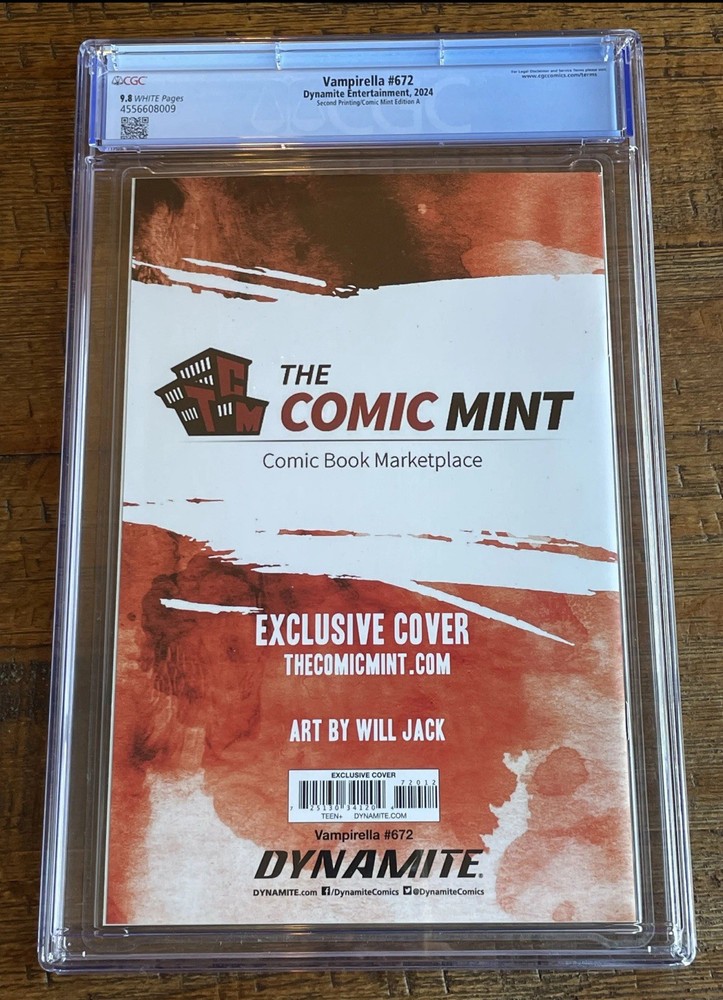 The product is a highly collectible VAMPIRELLA #672 comic book featuring exclusive Will Jack artwork, graded 9.8 Near Mint/Mint by CGC. This variant, released at New York Comic Con, includes characters such as Catwoman, Ghost-Spider, Poison Ivy, and more in a vibrant color splash style. Published by Dynamite Entertainment in 2024, this single issue comic is a must-have for fans of action, superheroes, and adventure within the modern age of US Comics.