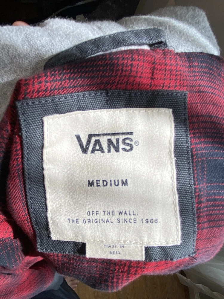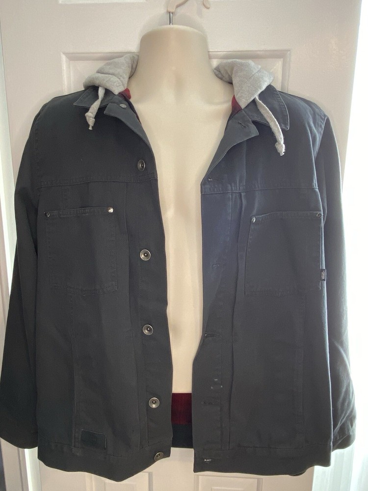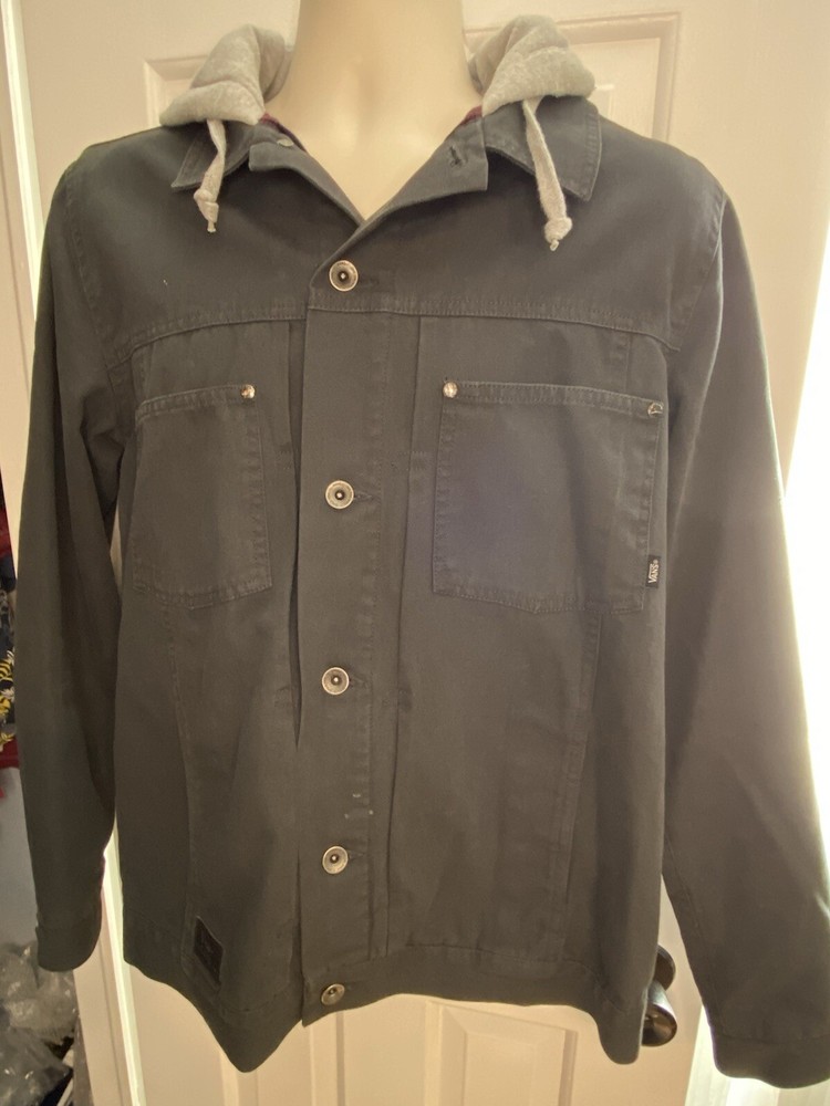 VANS Men’s Gray Hooded Jacket, Red Flannel Lined - Size Medium. Condition is Pre-owned. Shipped with USPS Ground Advantage.