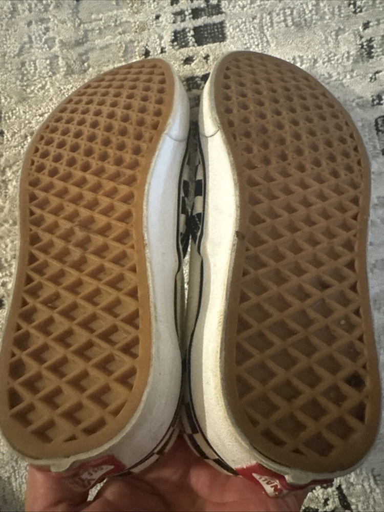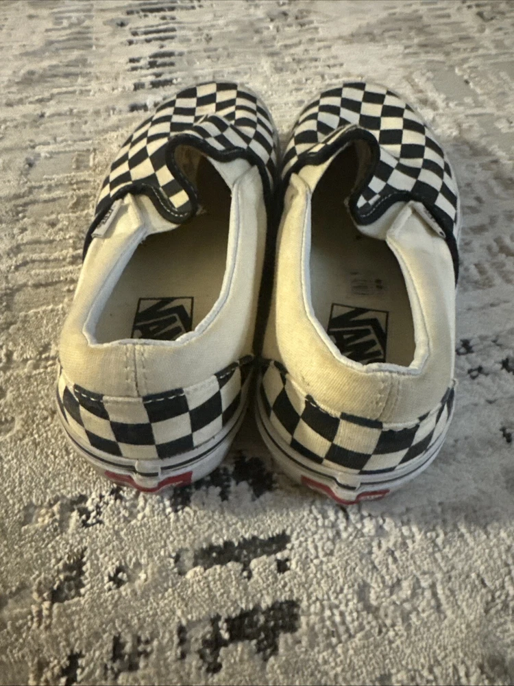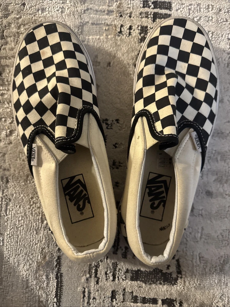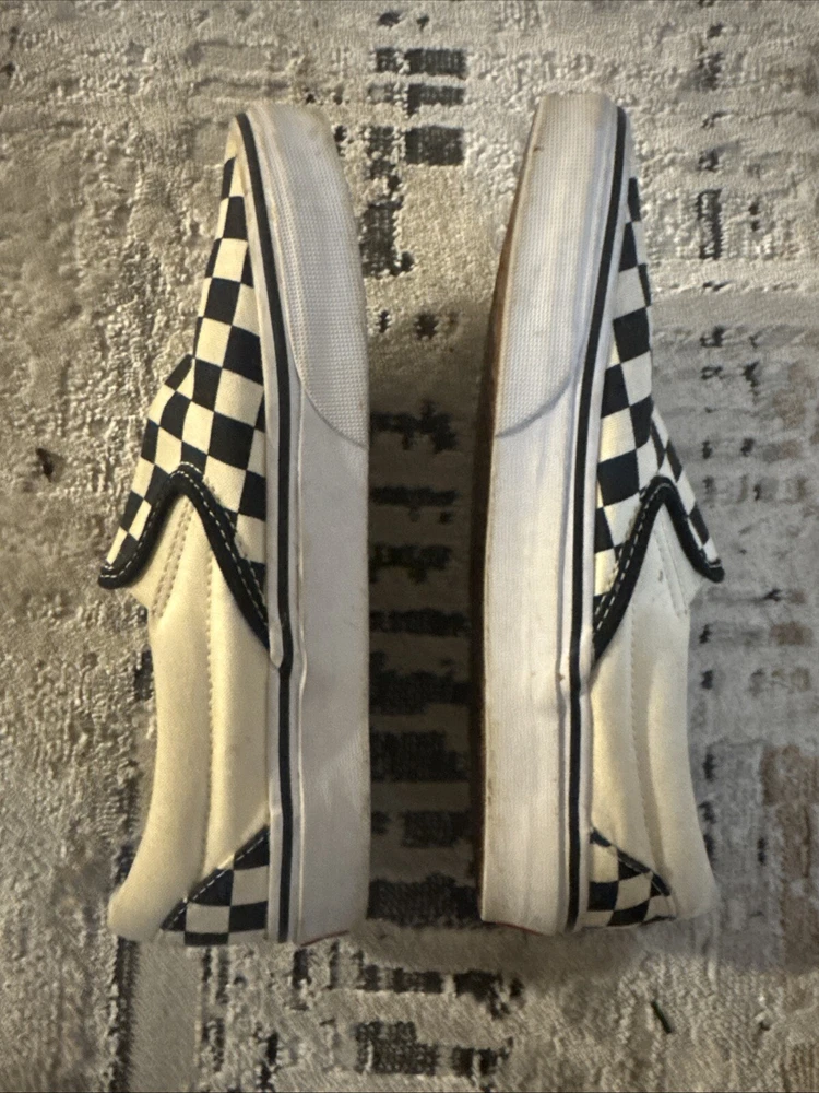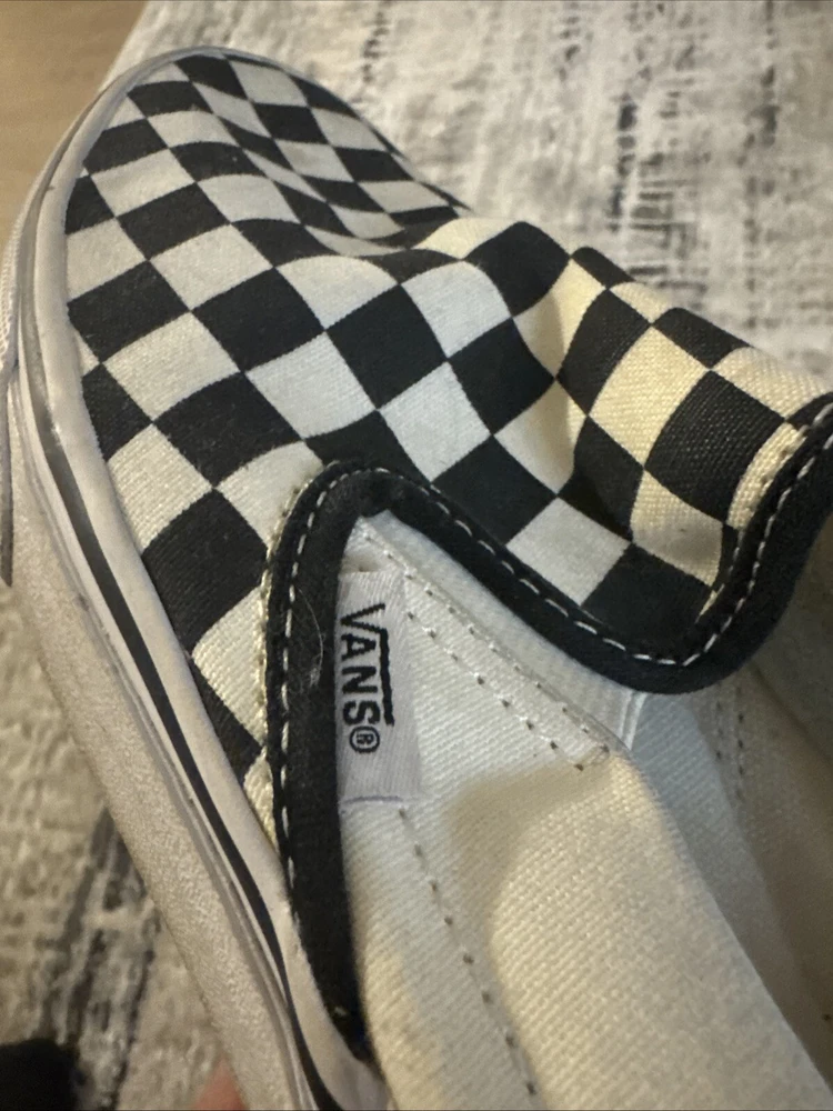 The VANS Women's Classic Slip-On Checkerboard Black White Canvas Skate Shoes in size 6.5 are low-top sneakers featuring a colorful check pattern in black and white. They have a slip-on closure, standard shoe width, and a rubber outsole suitable for skateboarding activities. Made of linen and canvas materials, these athletic shoes have a foam insole for comfort. The VANS brand signifies quality in this classic slip-on model, making them a stylish choice for activewear or casual wear. Clean