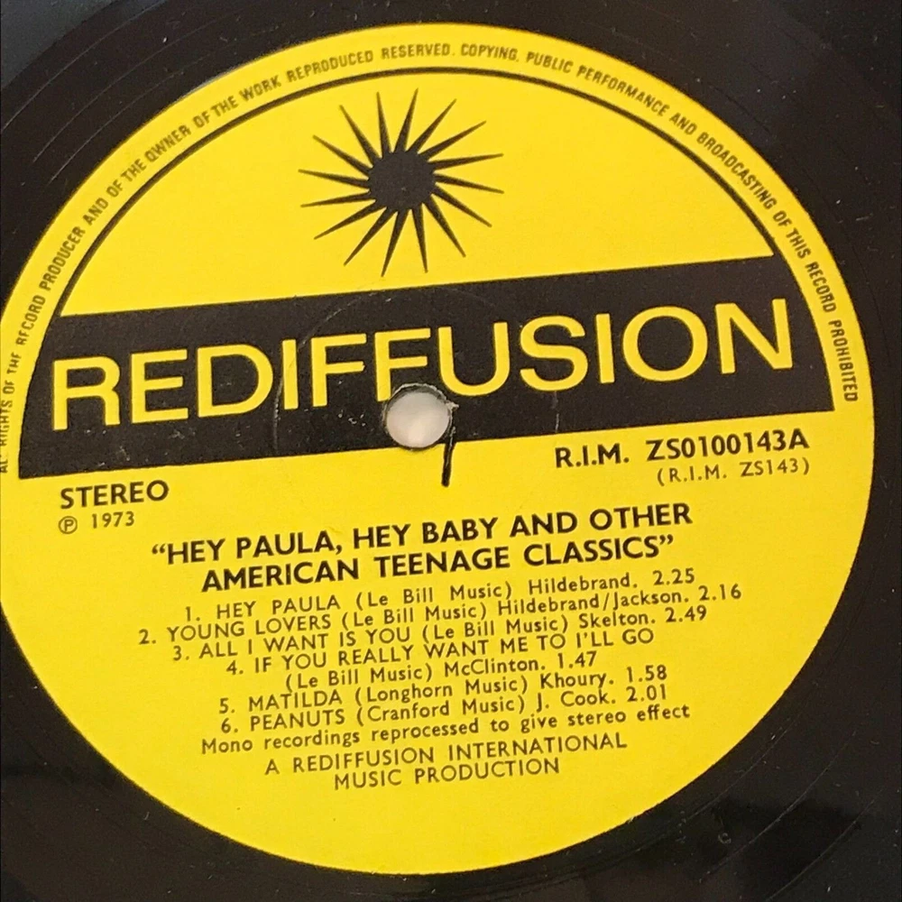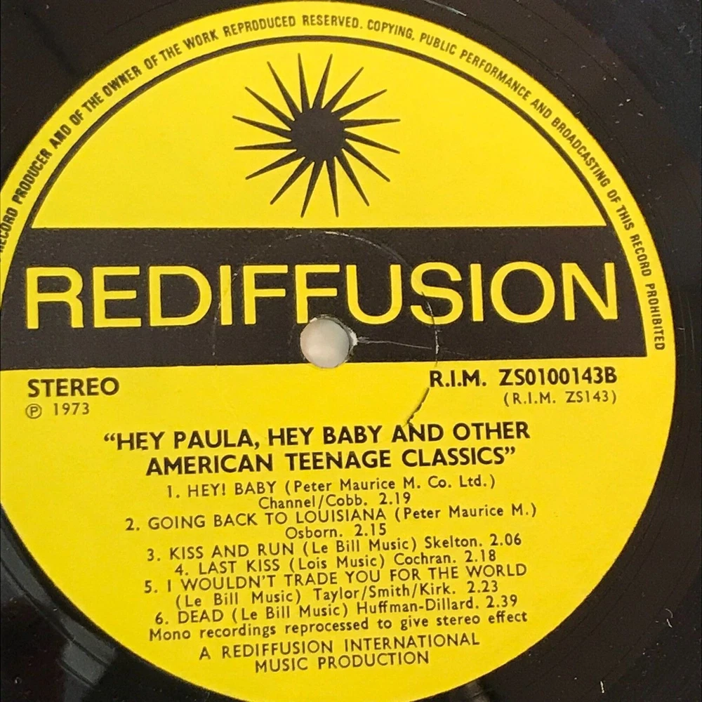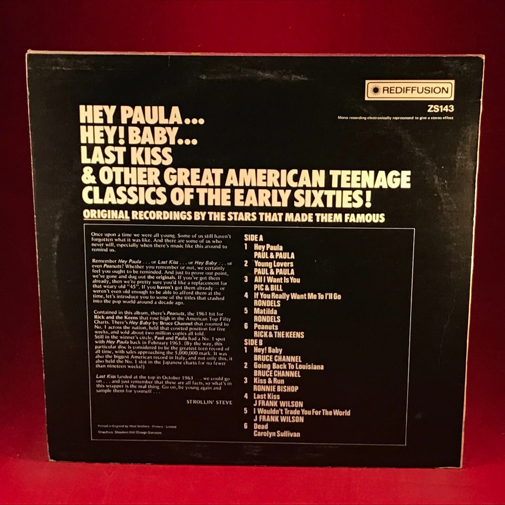 VARIOUS Hey Paula, Hey Baby & Other Teenage Classics - 1973 UK vinyl LP compilation, including Peanuts by Rick & The Keens, Hey! Baby by Bruce Channel, Kiss & Run by Ronnie Bishop & loads more fun, ZS143 A1 Paul & Paula - Hey Paula 2:25 A2 Paul & Paula - Young Lovers 2:16 A3 Pic & Bill - All I Want Is You 2:49 A4 The Ron-Dels - If You Really Want Me To I'll Go 1:47 A5 The Ron-Dels - Matilda 1:58 A6 Rick And The Keens - Peanuts 2:01 B1 Bruce Channel - Hey! Baby 2:19 B2 Bruce Channel - Going Back To Louisiana 2:15 B3 Ronnie Bishop - Kiss & Run 2:06 B4 J. Frank Wilson - Last Kiss 2:18 B5 J. Frank Wilson - I Wouldn't Trade You For The World 2:23 B6 Carolyn Sullivan - Dead 2:39 Record Condition : Excellent Sleeve : Minor shelfwear (see photo) Please check out our other items !