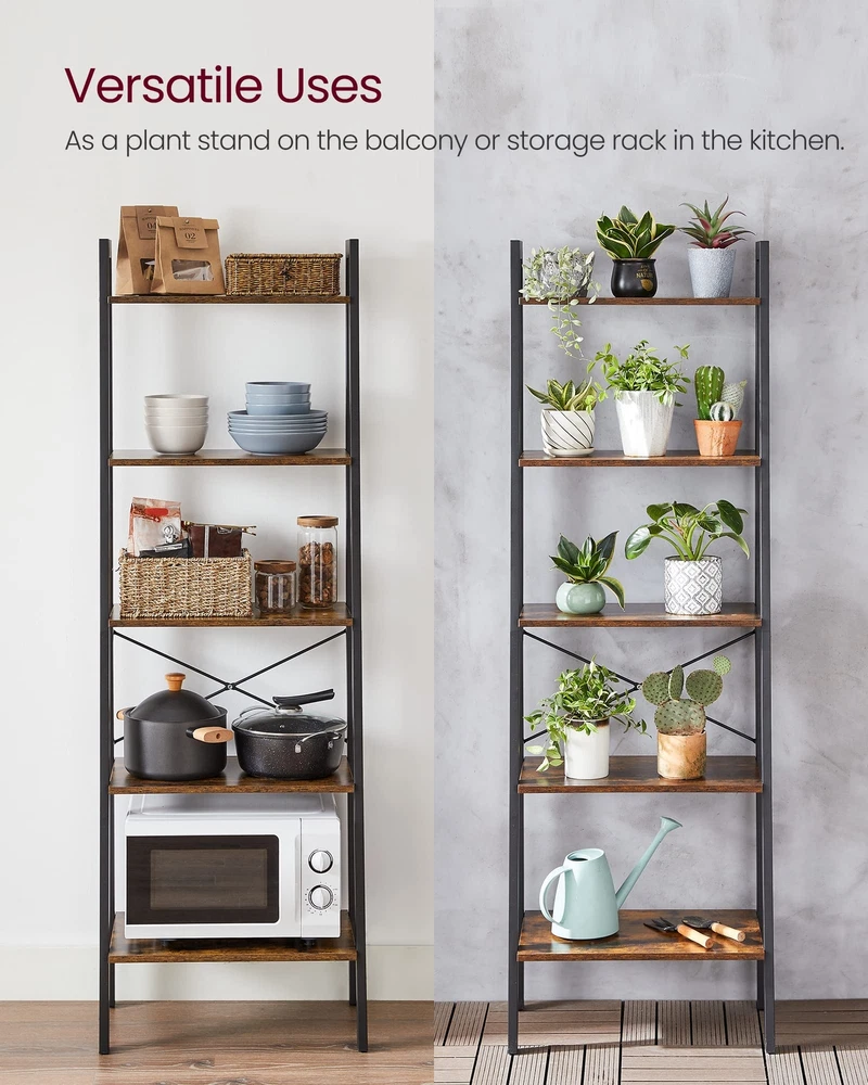 This ladder shelf is a game-changer for small spaces! The sturdy wood construction holds books, plants, and decor perfectly. The vintage design adds charm while the 5 tiers provide ample storage. Easy to assemble and surprisingly durable—looks way more expensive than it is. Love how versatile it is for any room!