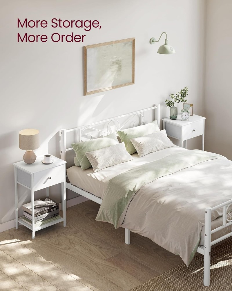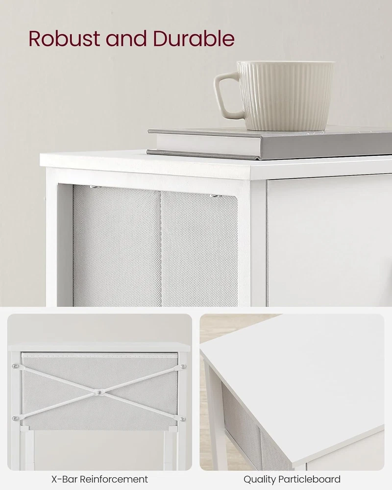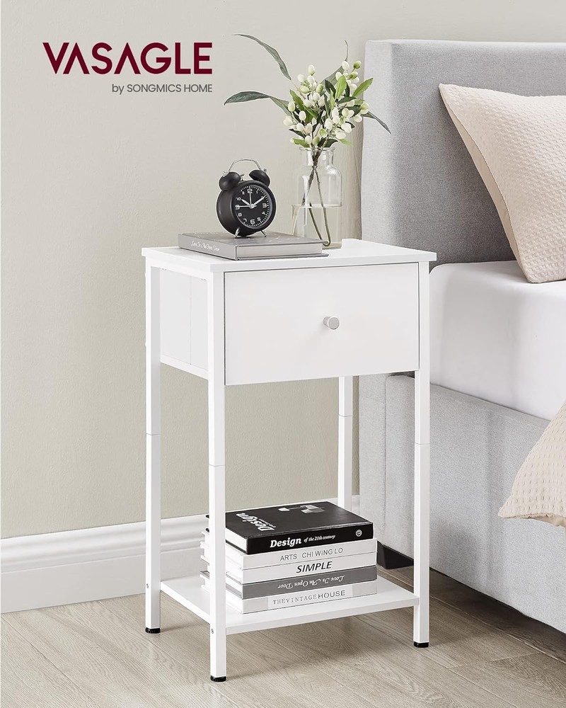 VASAGLE Nightstands, Set of 2 Side Tables 2 Pack with Single Drawer, White Product Details Brand: VASAGLE Product Dimensions: 11"D x 15"W x 24"H Maximum Weight Recommendation: 22 Pounds Color: White Product Care Instructions: Wipe with Dry Cloth Item WeightFrame Material: 16.4 PoundsGlass Top Material TypeShape: GlassRectangular [Ample Storage] With 2 open shelves and 1 fabric drawer, these 2 nightstands offer within-reach storage for your lamp, water glass, and remotes and out-of-sight storage for those easy-to-get-messy cables, pens, and your little secrets [Serve Many Places] Make it an end table next to the couch in the living room, a bedside table in the bedroom, or add handy storage in the hallway—this set of 2 stylish tables rounds off your space in any way [Ideal Height] 24” tall, each side table matches most beds and makes it easier for you to grab the stuff on the table when you’re in bed [Sturdy & Stable] Made with particleboard, a steel frame with an X-bar, a durable non-woven fabric drawer, and balanced by 4 adjustable feet, each end table with drawer offers firm, stable, and lasting support [Easy-Peasy Assembly] With easy-to-follow instructions and labeled parts, you can assemble these bedside tables before you know it Specifications: Color: Greige, BlackMaterial: Particleboard, Steel, Non-Woven FabricProduct Size: 11”D x 15”W x 24”H (28 x 38 x 61 cm)Total Weight of 2 Tables: 16.3 lb (7.4 kg)Max. Static Load Capacity of the Tabletop: 100 lb (45.6 kg)Max. Static Load Capacity of the Shelf: 20 lb (9 kg)Max. Static Load Capacity of the Drawer: 5 lb (2.2 kg)Max. Total Static Load Capacity per Table: 125 lb (56.8 kg) Package Contents: 2 x Nightstand2 x Accessory Kit1 x Instructions VASAGLE Notes: Do not put overweight items in the not wash the drawer. Clean with a wet cloth.There may be a smell of "new" when first opening the package; please air the side table out in a well-ventilated place for a few hours.