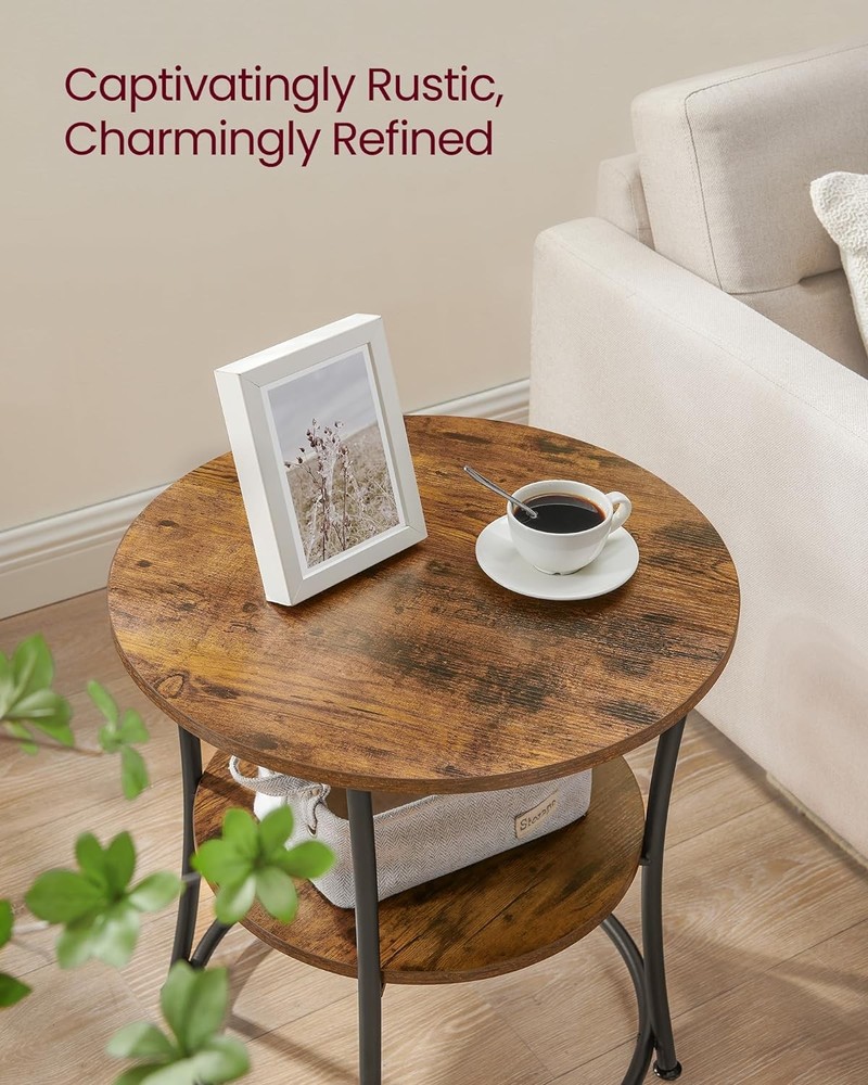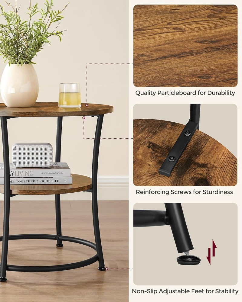 VASAGLE Side Table, Round End Table with 2 Storage Rustic Brown + Ink Black Product Details Brand: VASAGLE Product Dimensions: 21.7"D x 21.7"W x 21.7"H Maximum Weight Recommendation: 66 Pounds Color: Rustic Brown + Ink Black Table design: End Table Item WeightFrame Material: 5.9 KilogramsMetal Top Material TypeShape: Engineered WoodRound [Robust Little Fellow] The 21.7" dia. side table has stable steel legs, which are additionally reinforced by round tubes. The table does not yield whether you place a 66 lb bronze statue on the top shelf, nor when you use it for many years [Everything Counts] 2 round, finely crafted rustic brown shelves, a black steel frame, and numerous purposes—all in all, this makes a simple and yet extraordinary side table of the extra class [Assembly in Record Time] Gone are the days of spending hours setting up a piece of furniture. Thanks to the simple structure, manageable number of individual parts, and the easy-to-follow instructions, this side table can be assembled in record time [It Fits in Any Way] As an end table next to the couch in the living room, an additional shelf in the hallway, or as a bedside table next to your bed—it rounds off your space in any wayce in any way [What You Get] A round side table from VASAGLE’s DAINTREE Collection, 1 storage shelf, adjustable feet for slightly uneven ground, and a simple assembly process!