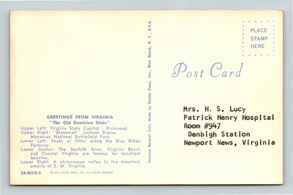 Region: See Image Theme: Cities & Towns Type: See Image Unit of Sale: Single Unit Subject: Cities & Towns Continent: See Image Postage Condition: See Image Original/Licensed Reprint: Original Country: See Image Size: Standard (5.5 x 3.5 in) Era: See Image City: VA-Virginia, Country/Region of Manufacture: See Image