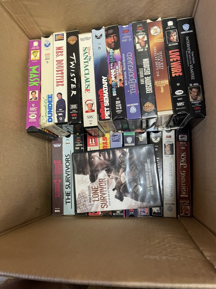 The product being offered is a lot of 36vhs tapes containing movies in English language with NTSC signal standard. This buy all bin offer allows the buyer to acquire a collection of VHS tapes at a discounted price, providing entertainment for viewers looking to enjoy classic movies on their VCR player. The variety of titles and films included in this lot adds a fun and nostalgic touch to any movie enthusiast's collection 1 dvd . Bin 25