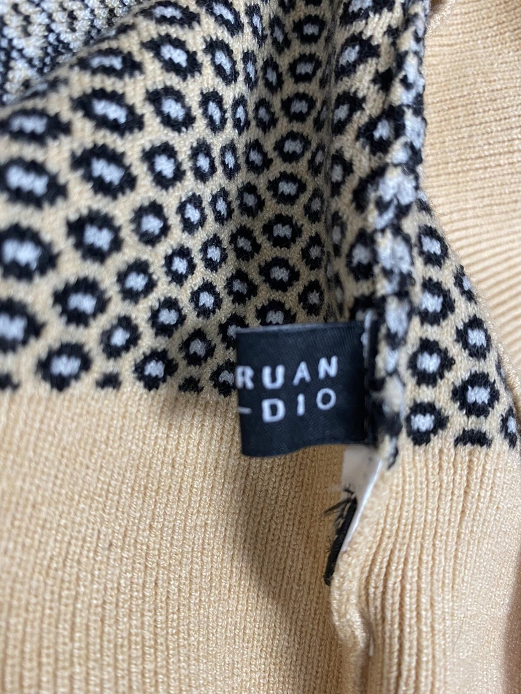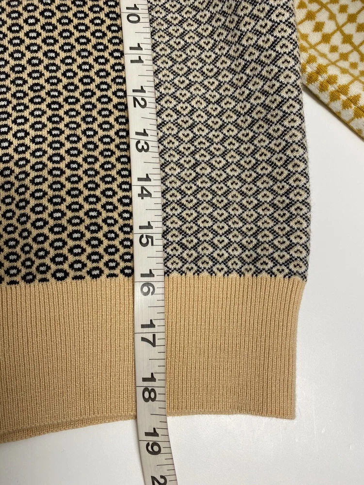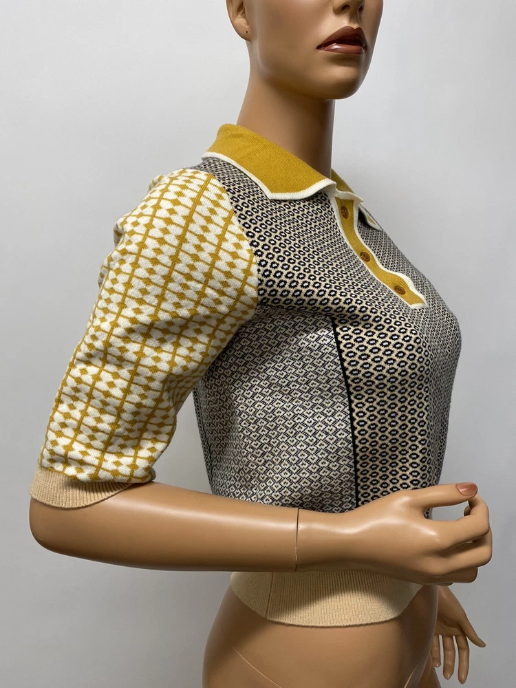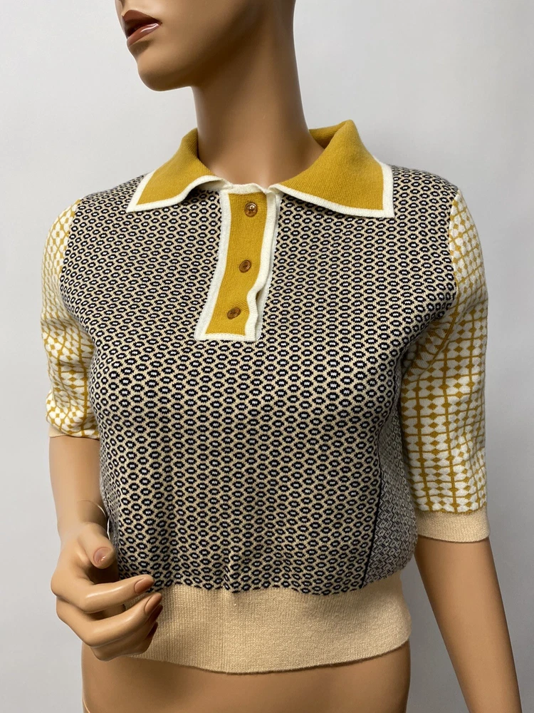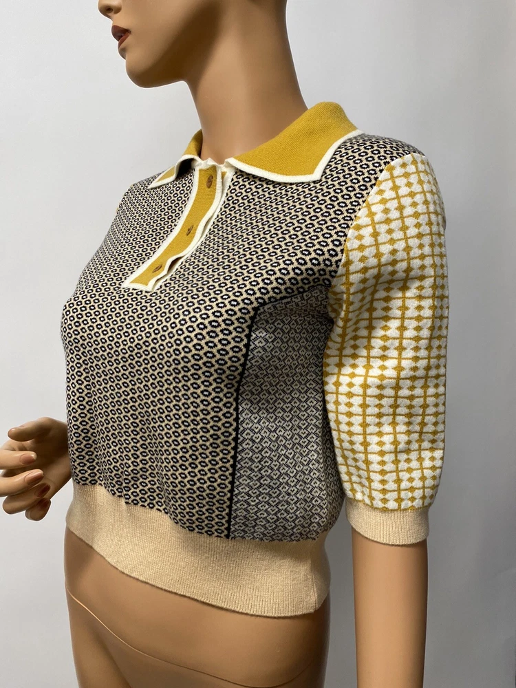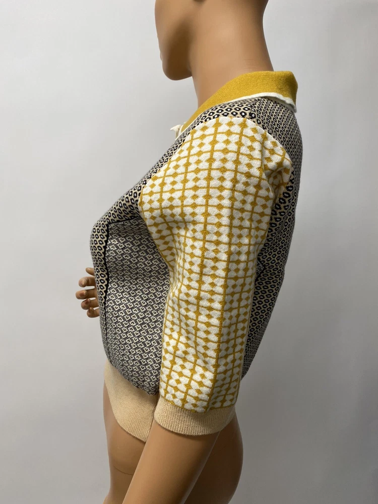 VC-RUAN STU-DIO Cropped retro Style Size Small is a women's sweater made of knit fabric with a collared neckline and short bell sleeves. The pullover features a geometric pattern in multicolor and a button accent. It is a classic fit and is available in size small. The sweater is machine washable and made of polyester.