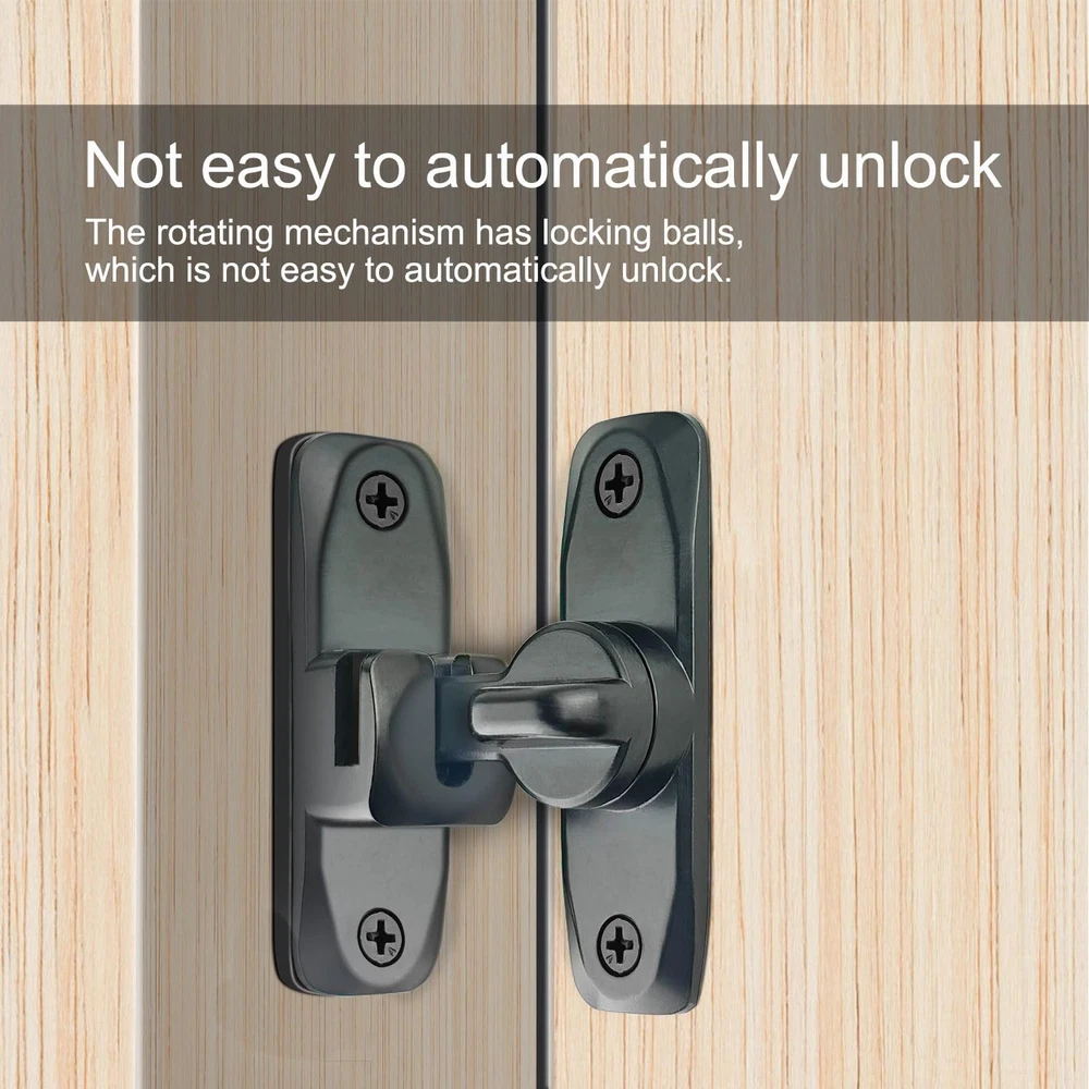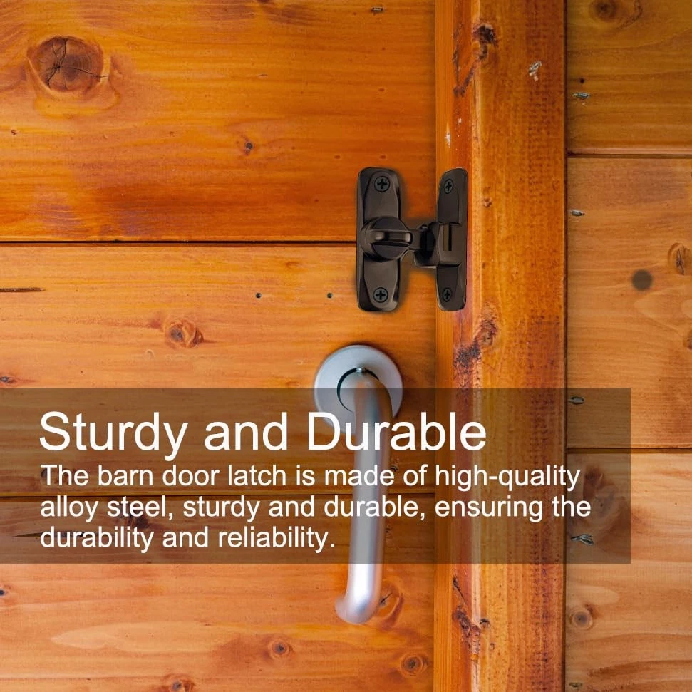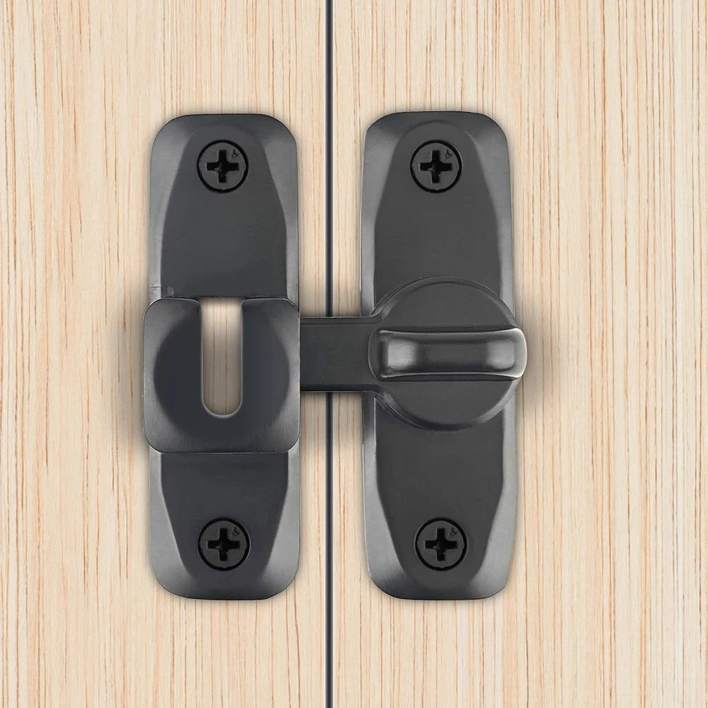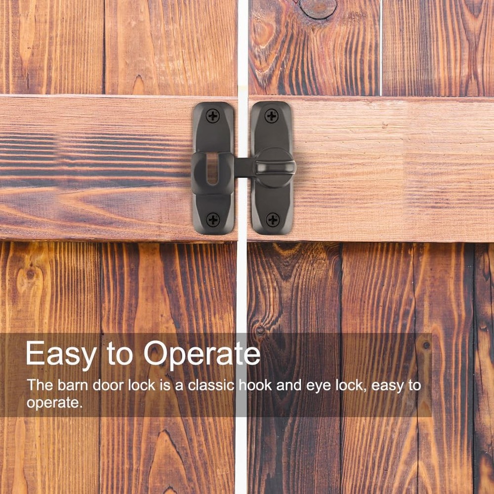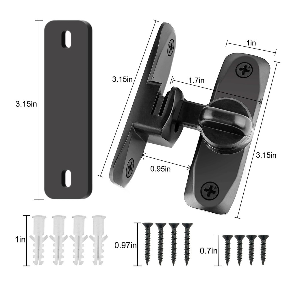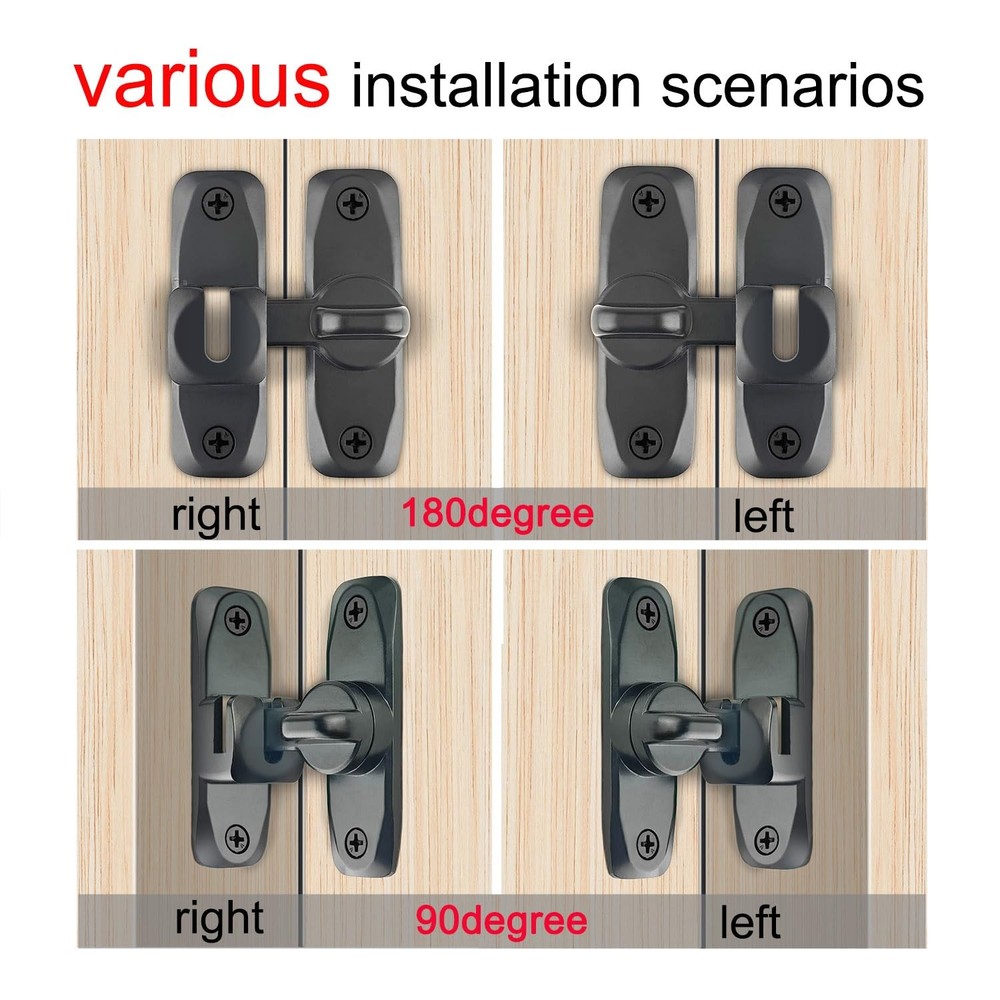 VEAPIZ brand is committed to providing you with the highest quality products and services to make your shopping experience the best it can be. we want to bring convenience and fun to you and your family. Product Advantages: ● Can be mounted at 90° right angles, also can be mounted at 180 degree angles for even more space-saving use. ● The rotating mechanism has locking balls, which is not easy to automatically unlock. ● Equipped with 4 mounting screws and 1 2.5mm Thick Door Latch Spacer. If the door and the frame/wall are not in the same plane, this gasket can be used ● Classic hook eye lock that is easy to operate and can be quickly locked and unlocked. ● Made of high-quality alloy steel, covered with a rust resistant coating on the surface, which can resist daily corrosion, and discoloration. ● Not limited by space,can also rotate 180 degrees,both sides can be installed. ● Attention to the distance between the rotating cards to ensure that the door latch can work proper. ● The door lock and latch are lightweight, sturdy, and durable, and will not easily deform. ● not only do you not have to worry about children and pets entering, but also protect your privacy. If you like it, don't hesitate to act! Material: High-quality carbon steel Lifetime Guarantee: VEAPIZ products are subject to strict quality checks and provide a lifetime guarantee on our products. If there is any problem with the product during the warranty period, we will give you a full refund. Package Includes: 1PCS Barn door lock(black) 1PCS 2.5mm Thick Door Latch Spacer(black) 4PCS Installing screws(black) No Limited by Space:The 90/180 Degree barn door lock can be mounted at 90° right angles, also can be mounted at 180 degree angles for even more space-saving use. The barn door latch can also rotate 180 degrees and can be installed on both the left and right sides of the doors and windows. Easy to Operate: The barn door lock is a classic hook and eye lock, easy to operate . The rotating mechanism has locking balls, which is not easy to automatically unlock. Compact and exquisite, it can firmly grasp your doors and windows, not only do you not have to worry about children and pets entering, but also protect your privacy. Sturdy and Durable: The barn door latch is made of high-quality alloy steel, sturdy and durable, and will not easily deform. The surface is covered with anti rust coating, which can resist daily corrosion, ensuring the durability and reliability of the sliding door lock. Easy to Install: This gate latch is easy to install, equipped with 4 mounting screws and a 2.5mm Thick Door Latch Spacer. If the door and the frame/wall are not in the same plane, this gasket can be used. Once the screws are fixed, the installation is complete. However, pay attention to the distance between the two accessories to ensure that the barn door lock can work properly. Wide Application: The barn door latch is lightweight, but sturdy and practical, making it an ideal choice for most farm gates, small pet cages, sheds, cabins, windows, cabinets, garages, barn doors, and more. Add a simple protection to your doors and windows, and bring convenience to your life.
