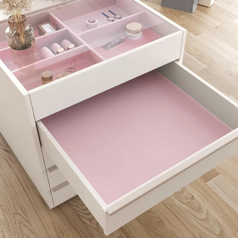 Self adhesive velvet drawer liner, felt flocking liner, velvet fabric roll peel and stick SIZE: 15.7'' wide x 118'' long each roll velvet flocking liner(40cm x 3m), thick fabric vinyl, baby pink velvet wallpaper. Made of durable velvet fabric, tear resistant, sturdy for long term use FEATURE: Self adhesive velvet drawer liner, no glue is required. Soft and velvety, protect your jewelry from scratching, sound-absorbing. Removable without sticky residue left behind EASY TO USE: Adhesive drawer liner, easy to cut to size, easy to work with, forgiving to reposition without bubbling and creasing. Low maintenance, affordable solution to improve the look of jewelry drawers MULTIPURPOSE: Self adhesive velvet flocking liner for jewelry drawer, jewelry box, bedroom dresser, drawer liners, shelf liners, arts and crafts, upholstery, bookshelves, cabinets, furniture, dollhouse, picture framing, display backsplash, backdrop, tool boxes, DIY projects