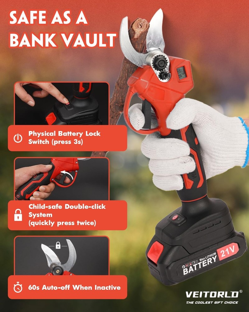 VEITORLD Electric Pruning Shears, Portable Cordless Branch Cutter Tree Trimmer with LCD Display&Replaceable Blades, 30mm 1.2'' Cutting Diameter for Gardening Tree (Included 2Pcs 2000mAh Batteries) - Buy Now with Fast Shipping! VEITORLD Electric Pruning Shears, Portable Cordless Branch Cutter Tree Trimmer with LCD Display&Replaceable Blades, 30mm 1.2'' Cutting Diameter for Gardening Tree (Included 2Pcs 2000mAh Batteries) Product Details Brand: Veitorld Color: Black Red Style: 1.2in Handheld Pruner Product Dimensions: 30"L x 4"W Blade Material: High Carbon Steel Brand: Veitorld Color: Black Red Style: 1.2in Handheld Pruner Product Dimensions: 30"L x 4"W Blade Material: High Carbon Steel Handle Material: Rubber Blade Edge: Serrated Blade Type: Bypass Hand Orientation: Ambidextrous Point Style: Round point Cutting Width: 1.2 Inches Manufacturer: Veitorld Part Number: 001 Item Weight: 4.58 pounds Country of Origin: China Item model number: DDXZJ-DCK Batteries: 5 Lithium Ion batteries required. (included) Material: High Carbon Steel, Plastic Power Source: Battery Powered Voltage: 20 Volts Wattage: 600 watts Item Package Quantity: 1 Included Components: Oil Bottle, Blades, Battery, Charger, Sharpening Stone Batteries Included?: Yes Batteries Required?: Yes Battery Cell Type: Lithium Date First Available: June 17, 2024 Key Features ✅ UP TO 30mm CUTTING:Quickly and cleanly trim branches without damage. SK5 steel blades and a brushless motor ensure sharpness and durability for cutting 1.2 inch branches. Ideal for gardens, parks, farms, and orchards, perfect for grapevines and fruit tree ✅ 600W BRUSHLESS MOTOR:Efficient and easy-to-use, our shears feature a powerful motor for superior performance. Less energy use, more efficiency, effortlessly every time, and a longer lifespan make it perfect for summer pruning tasks ✅ LONG BATTERY LIFE:Equipped with 2 x 21V, 2AH lithium batteries for extended use. Quick 1-2 hour charge and spare batteries allow for 6-8 hours of work, cutting over 1,000 branches. Ideal for maintaining your garden during the busy summer season ✅ SAFETY & AUTOMATIC SLEEP:Turning the battery on and pressing the start button twice quickly before it starts working reduces the risk of accidents. After 1 minute of inactivity, it automatically enters sleep mode to extend the life of the battery ✅ ENJOY EVERY PRUNING JOURNEY:Ergonomic design, pruning shears weigh only 1.7lb, long-term use is not easy to feel fatigue, especially suitable for the elderly, women and other uses ✅ LCD DISPLAY:Equipped with LCD display can real-time display cutting situation and battery remaining power, so that you always keep track of cutting activities, so that each trimming work is no longer laborious and boring ✅ PACKAGE & SUPPORT:Includes shears, 2 batteries, oil bottle (WITHOUT OIL), 2 SK5 blades, sharpening stone, wrenches, charger, and manual. Our 24/7 customer service is ready to assist with any product inquiries, Please feel free to contact us Product Description