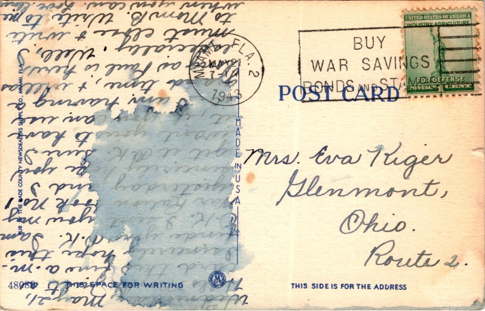 MAKE AN OFFER. THE MORE YOU BUY THE BETTER DEAL I WILL ACCEPT The postcard depicts the Venetian and County Causeways and Bay Islands in Miami Beach, Florida. The image shows a view of the bay islands, with a focus on the industry and agriculture of the area. The postcard is from the United States of America and includes a message from Mrs. Eva Tiger in Ohio.