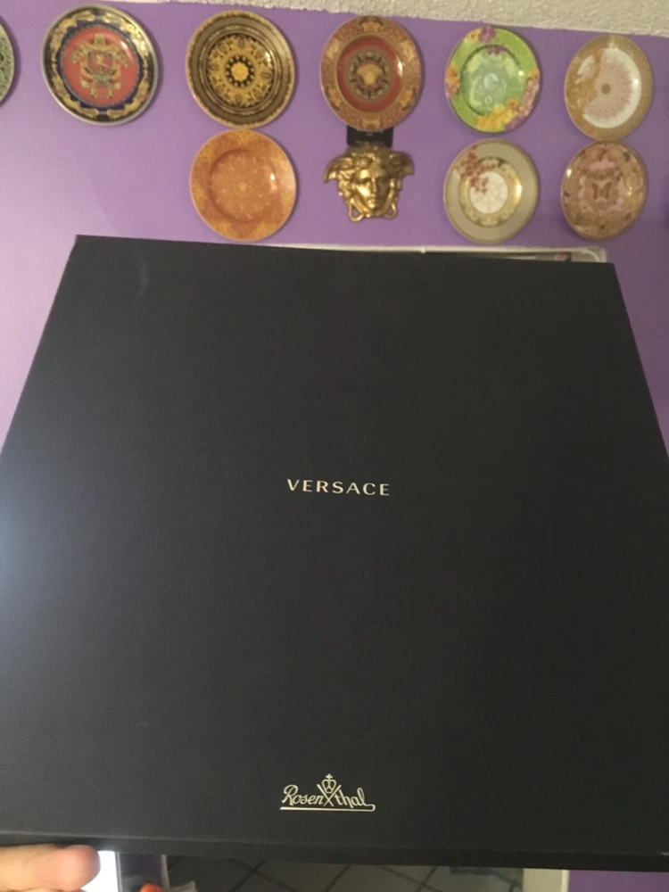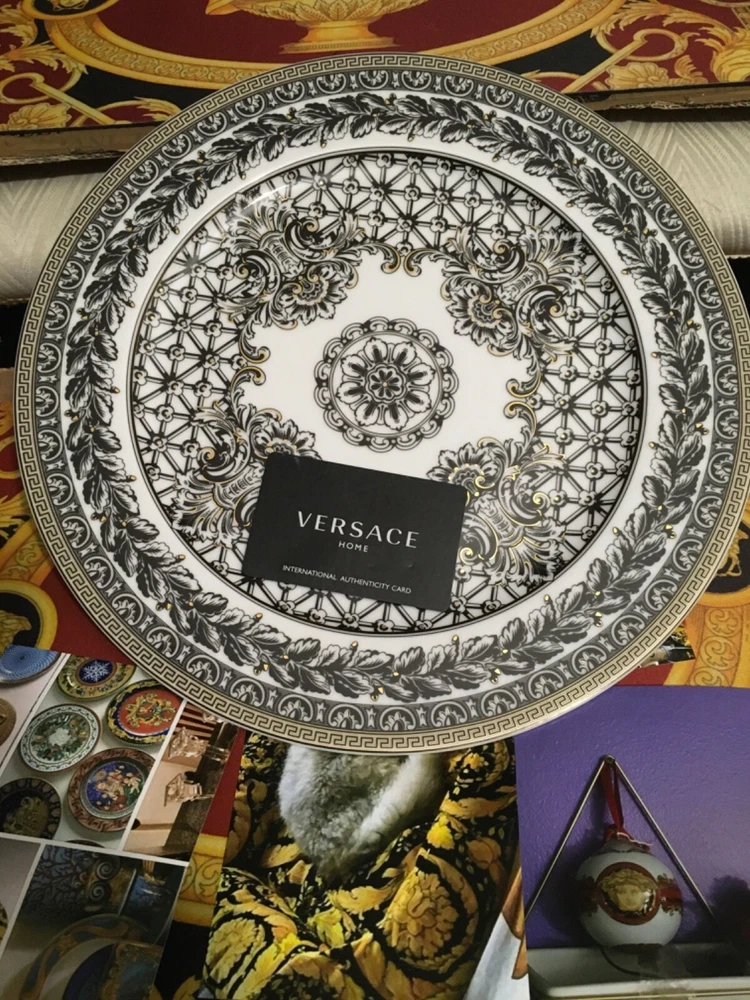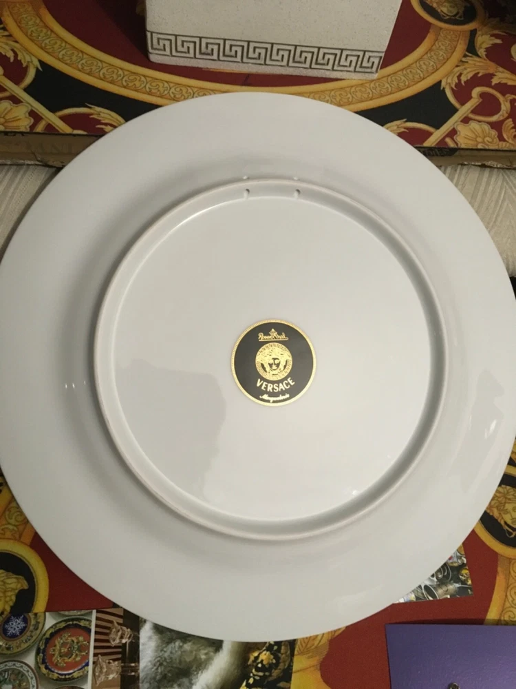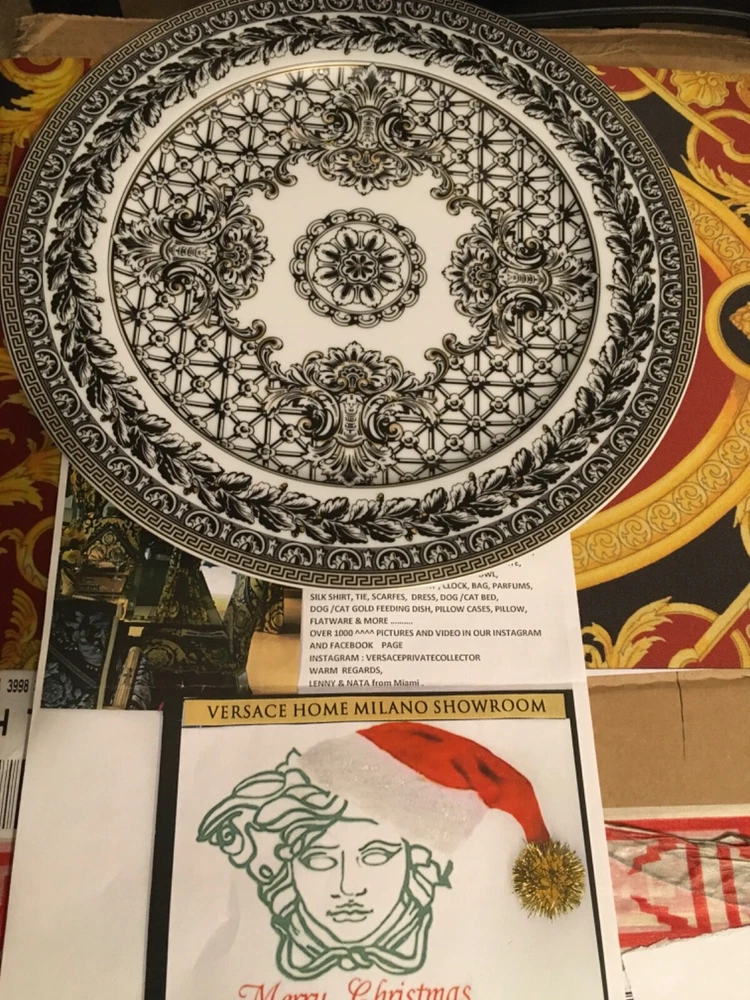 1 VERSACE SERVICE CHARGER PLATE MARQUETERIE SIZE 12" or 30cm ORIGINAL NEW in VERSACE BOX with certificate SALE ++++ INSTAGRM VERSACECOLLECTOR305 The Versace “MARQUETERIE Service Plate comes in an elegant gift box. The central eye-catcher of this collection is the glorious gold coloured WHITE BLACK GOLD the unmistakably Versace emblem framed by expressive gold baroque ornaments against a striking red background. A perfect balance is reached between the swirling acanthus tendrils, hunting scenes and flying cherubs and the fine geometric friezes as if to contain the flamboyant opulence of the oriental energy. The result is an outstanding piece for an outstanding table setting. Ikarus, one of the first dinnerware collections of “Rosenthal meets Versace”, launched in 1993, mirrors the matchless rich, colour intensive world of Versace. The emblematic Versace pattern featuring the glorious gold coloured central Medusa head has a new contemporary look. The new form lends excitement to this classic pattern. Beautiful detail and vibrant colour of the expressive baroque ornaments make this a true must have. The pulsating brilliance of the deep red, the elegance of the black and the magnificence of the gold: a colour spectrum which dominates the collection. The collection was Designed by Paul Wunderlich a German internationally known lithographic and object surrealist