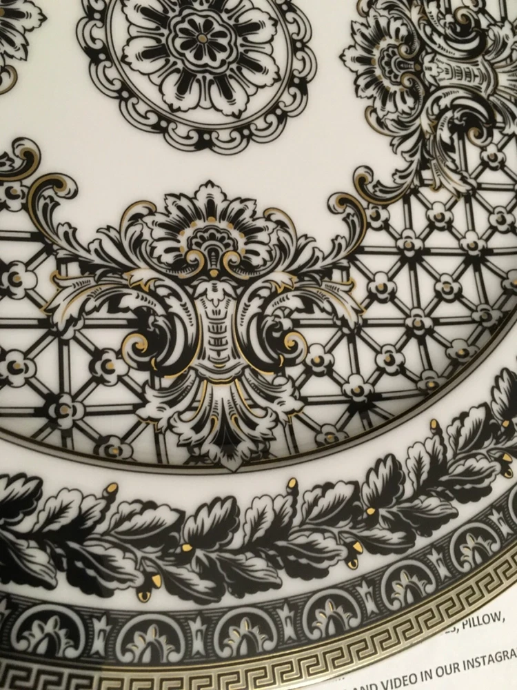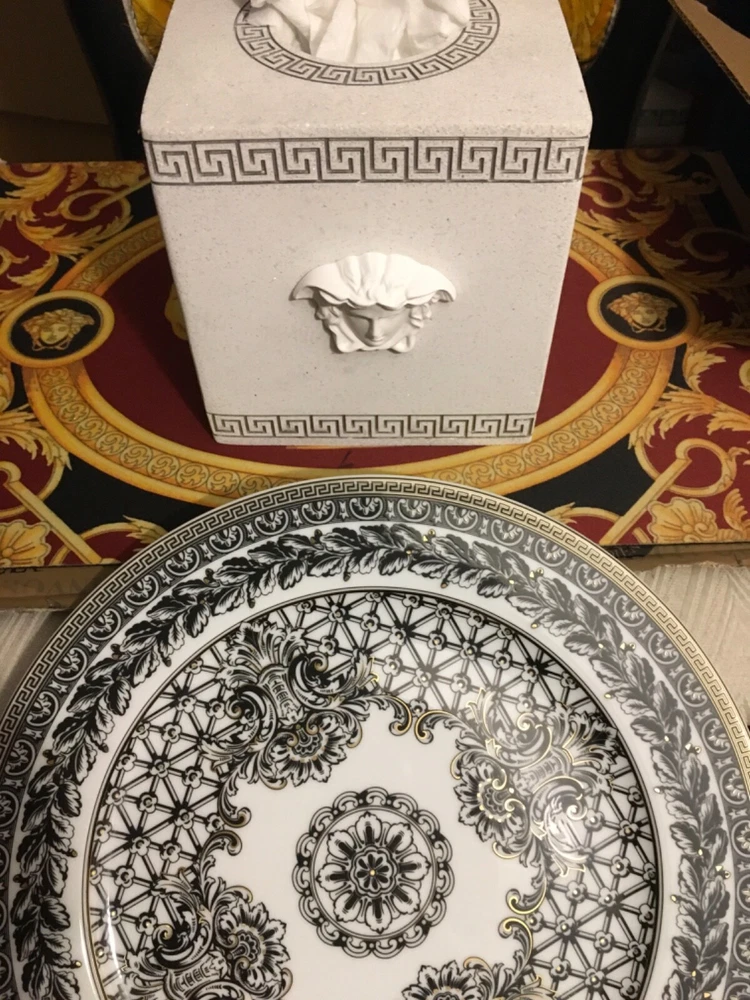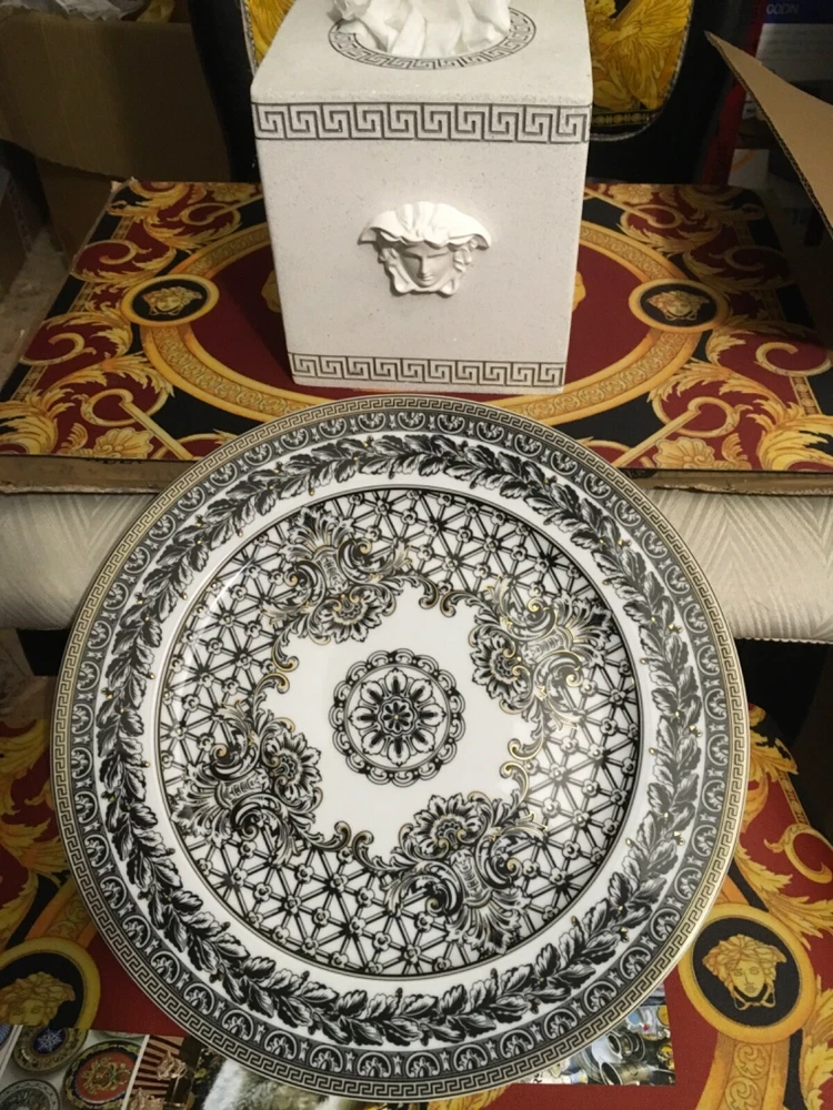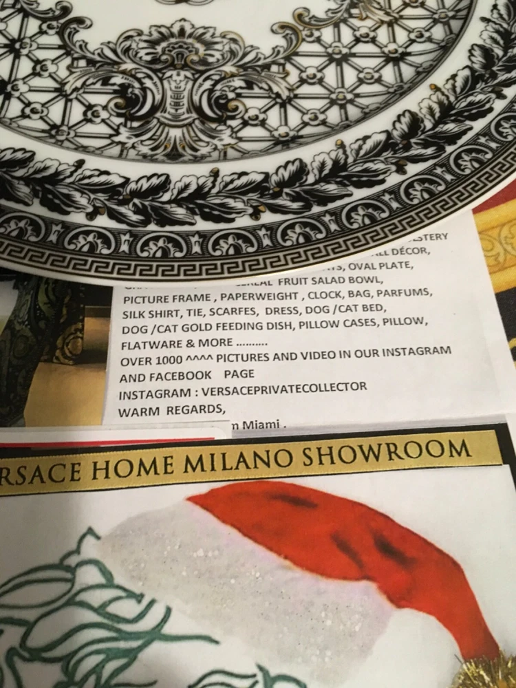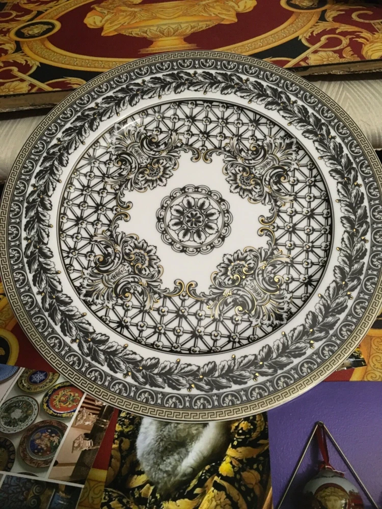 1 VERSACE SERVICE CHARGER PLATE MARQUETERIE SIZE 12" or 30cm ORIGINAL NEW in VERSACE BOX with certificate SALE ++++ INSTAGRM VERSACECOLLECTOR305 The Versace “MARQUETERIE Service Plate comes in an elegant gift box. The central eye-catcher of this collection is the glorious gold coloured WHITE BLACK GOLD the unmistakably Versace emblem framed by expressive gold baroque ornaments against a striking red background. A perfect balance is reached between the swirling acanthus tendrils, hunting scenes and flying cherubs and the fine geometric friezes as if to contain the flamboyant opulence of the oriental energy. The result is an outstanding piece for an outstanding table setting. Ikarus, one of the first dinnerware collections of “Rosenthal meets Versace”, launched in 1993, mirrors the matchless rich, colour intensive world of Versace. The emblematic Versace pattern featuring the glorious gold coloured central Medusa head has a new contemporary look. The new form lends excitement to this classic pattern. Beautiful detail and vibrant colour of the expressive baroque ornaments make this a true must have. The pulsating brilliance of the deep red, the elegance of the black and the magnificence of the gold: a colour spectrum which dominates the collection. The collection was Designed by Paul Wunderlich a German internationally known lithographic and object surrealist