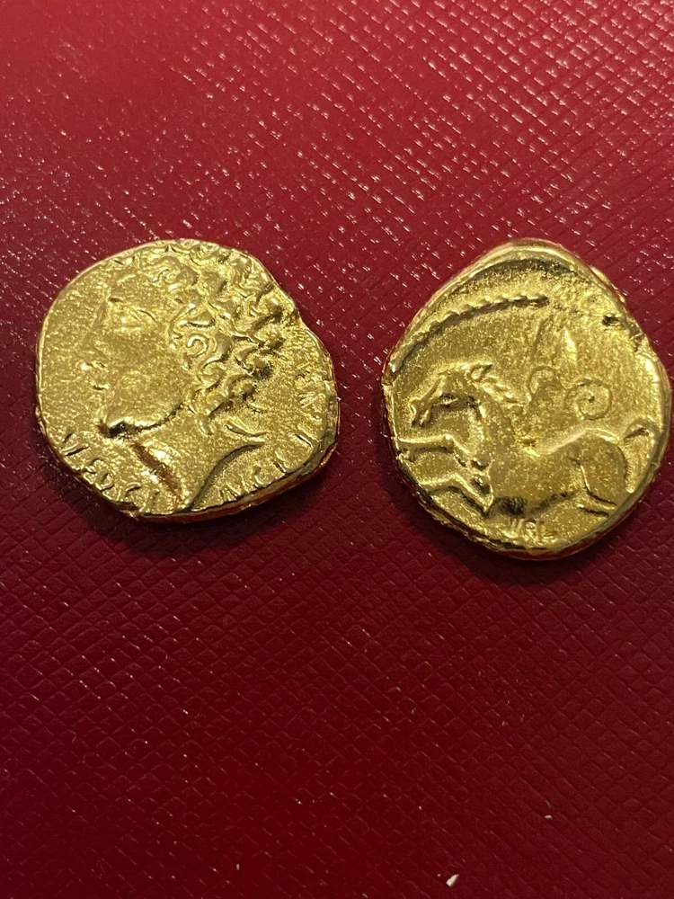 PLEASE NOTE THIS COIN WILL NOT BE POSTED UNTIL MONDAY 28th FEBRUARY RARE VERCINGETORIX GOLD STATER REPRODUCTION COIN Diameter - 18 mm An unusual and rare coin exact to the original it was cast from and finished in gold plate, EF condition. Originally struck under the authority of the Gallic chief in 52 BC at the time the Arverni leader, Vercingetorix, was confronting the Roman armies of Gaius Julius Caesar. Fewer than thirty Vercingetorix staters, in gold, electrum and bronze, have been identified around in the world Obverse - Bare head bust of Vercingetorix with wavy hair, left. Text below: VERCI-NGETORIXS. Reverse - Full bodied horse galloping left, spiral shape above . Vercingetorix, chief of the Arverni, led the great Gallic revolt against the Romans in 53-52BC. His name in Gaulish means ‘over-king of warriors’. He was eventually defeated by Caesar at the Battle of Alesia in 52BC and was imprisoned, he died in 46BC. The free horse on the reverse symbolises the Arverni spirit of independence.