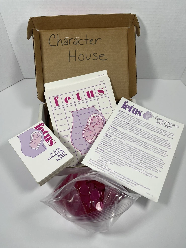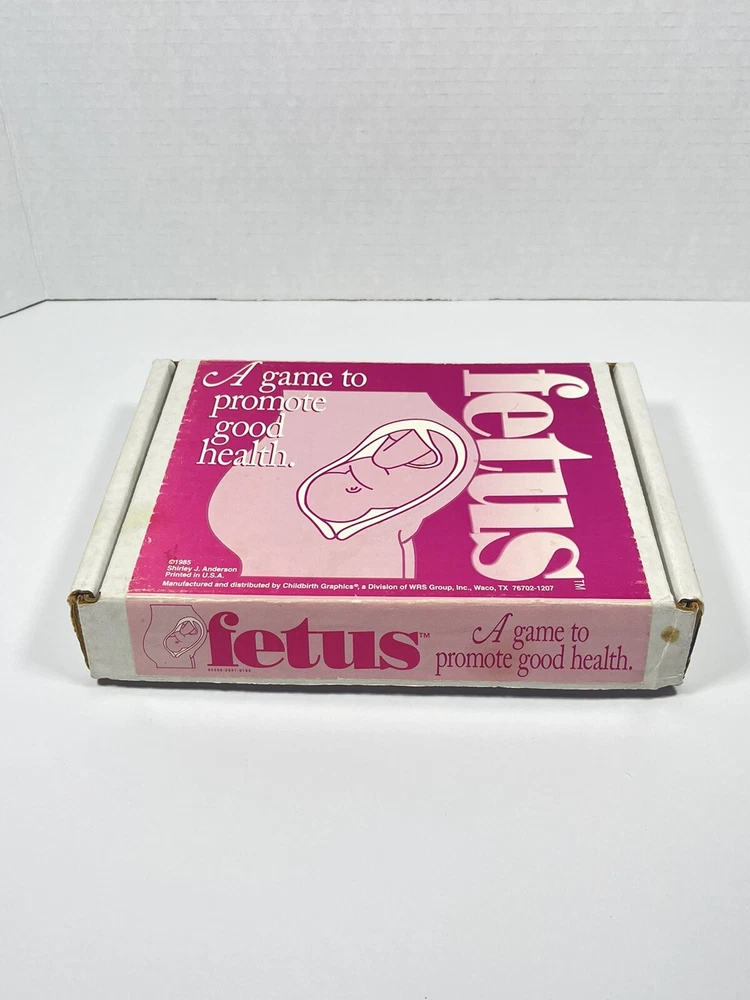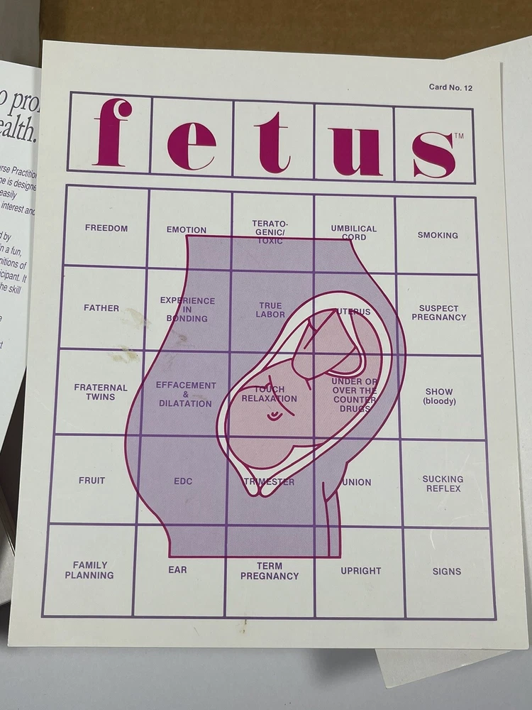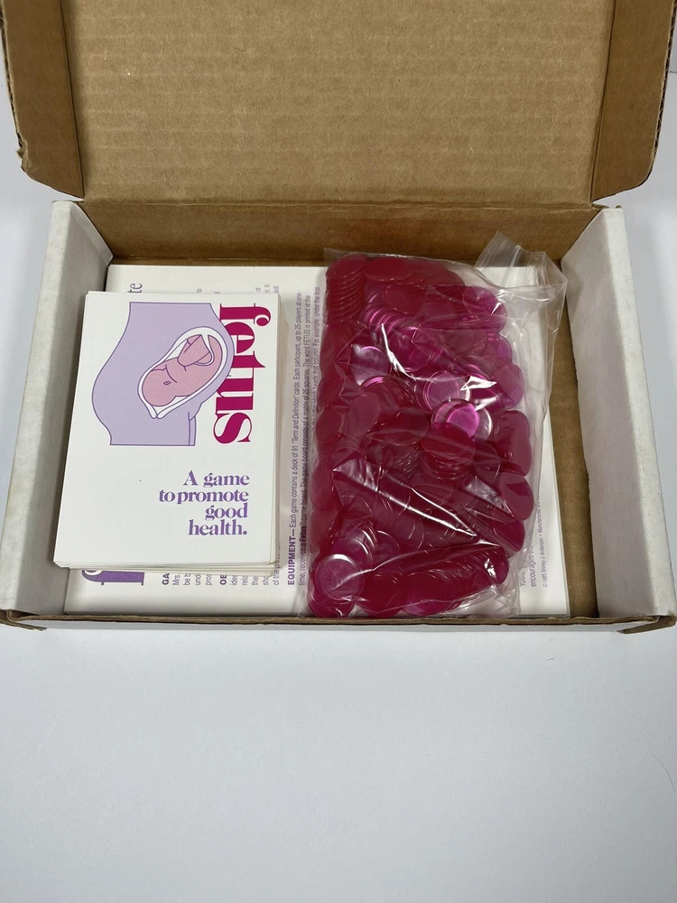 VERY RARE VINTAGE FETUS BOARD GAME 1985 Shirley Anderson Baby Child Pregnancy As far as I can tell all the pieces are here. There are 25 game cards and 95 FETUS cards. The game instructions card states that there should be 91, but there are 95 and they do appear to all be unique. As in, no repeats. There are three of the bingo cards that have a little bit of staining. I’ve provided several photos so please look at them closely before deciding whether or not you want to purchase. The photos are considered to be part of the description. I did not count all of the pink bingo tokens.